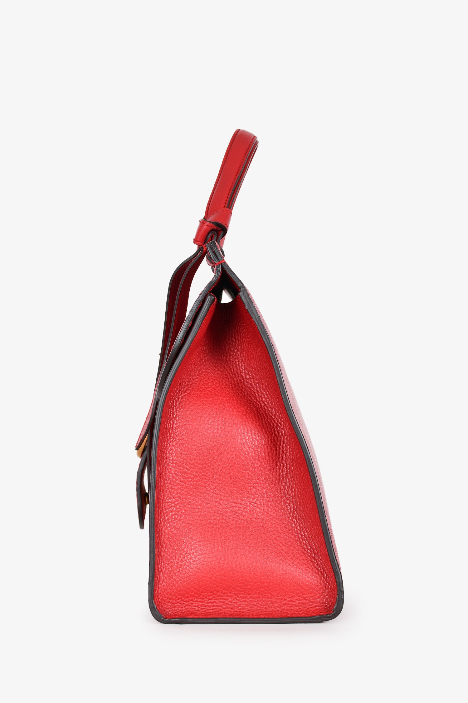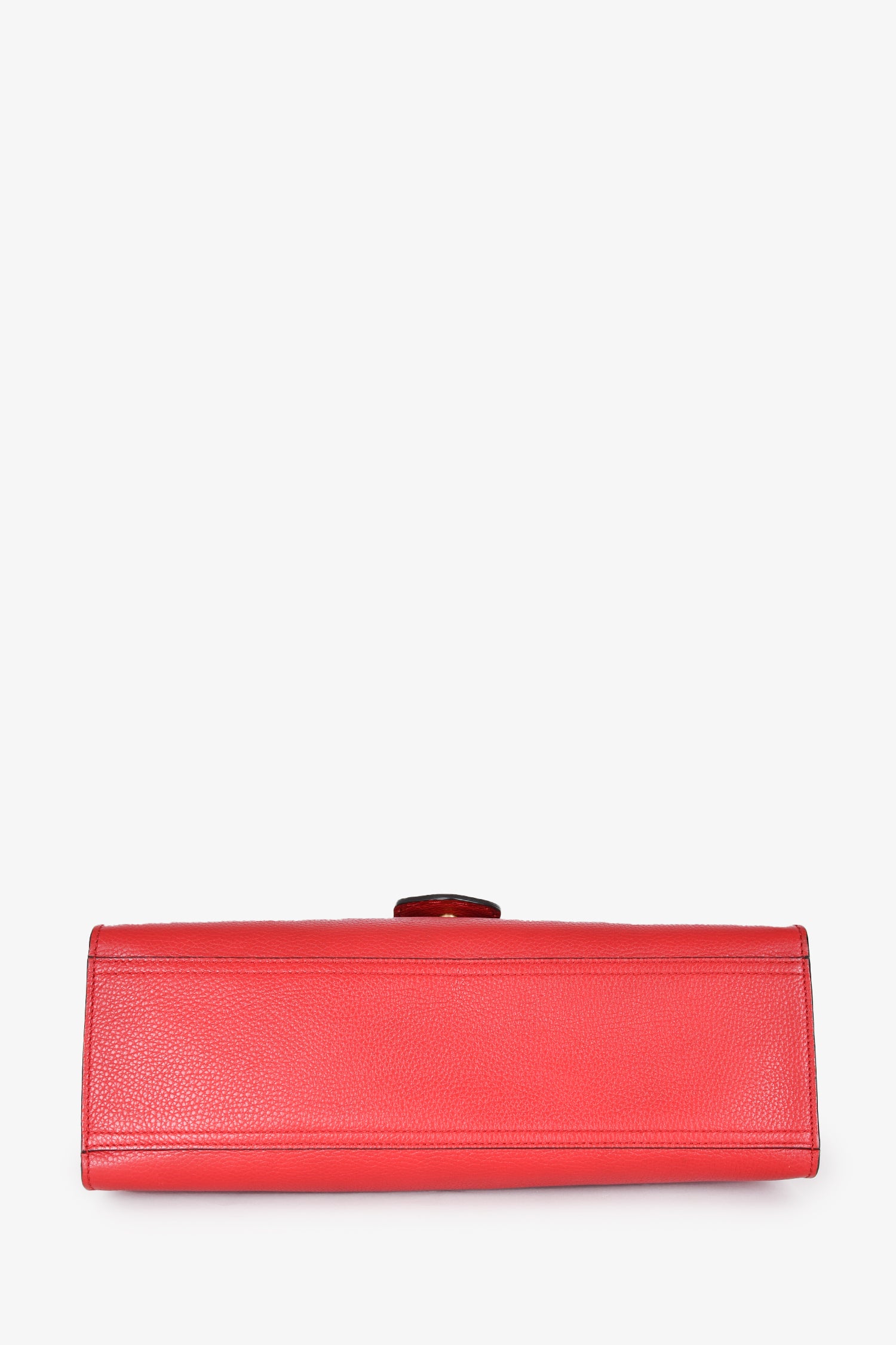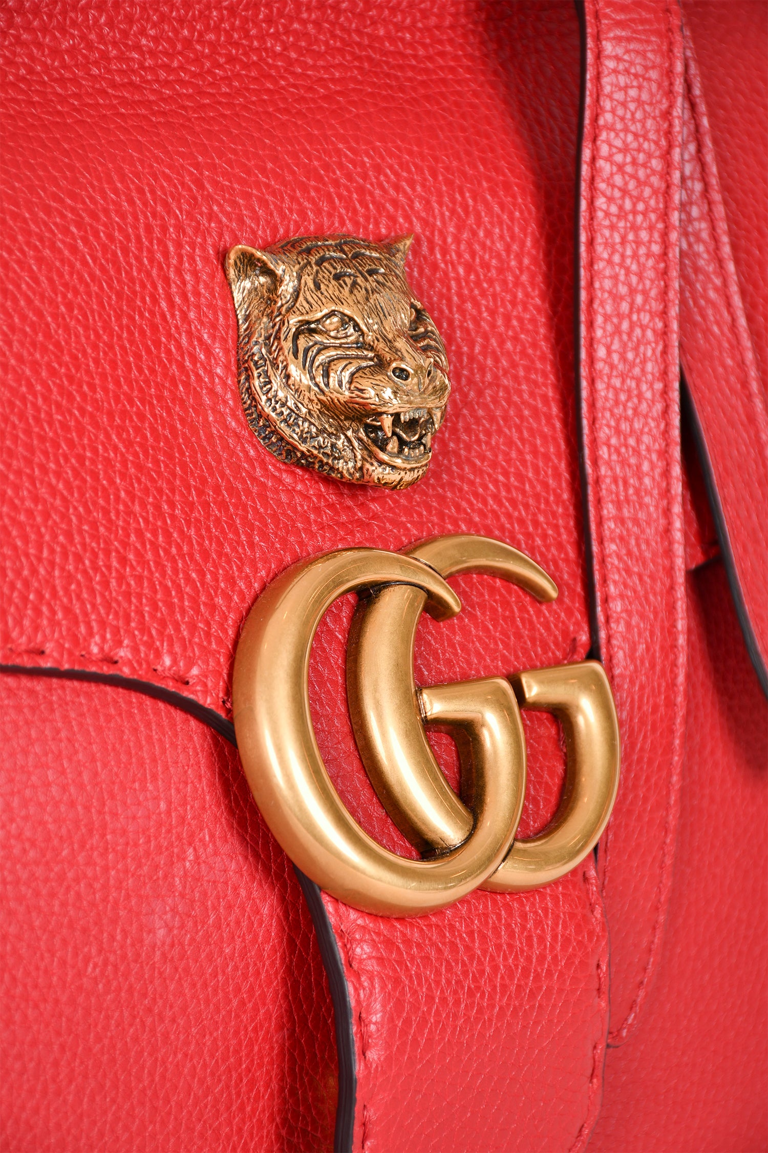 Refresh availabilityGucci Red 'GG' Marmont Animalier Top Handle Bag. Front fold-over flap with push-lock closure. Cream textile interior lining. 2 interior card slots. 1 zippered wall compartment. Gold-tone hardware. Tonal stitching.