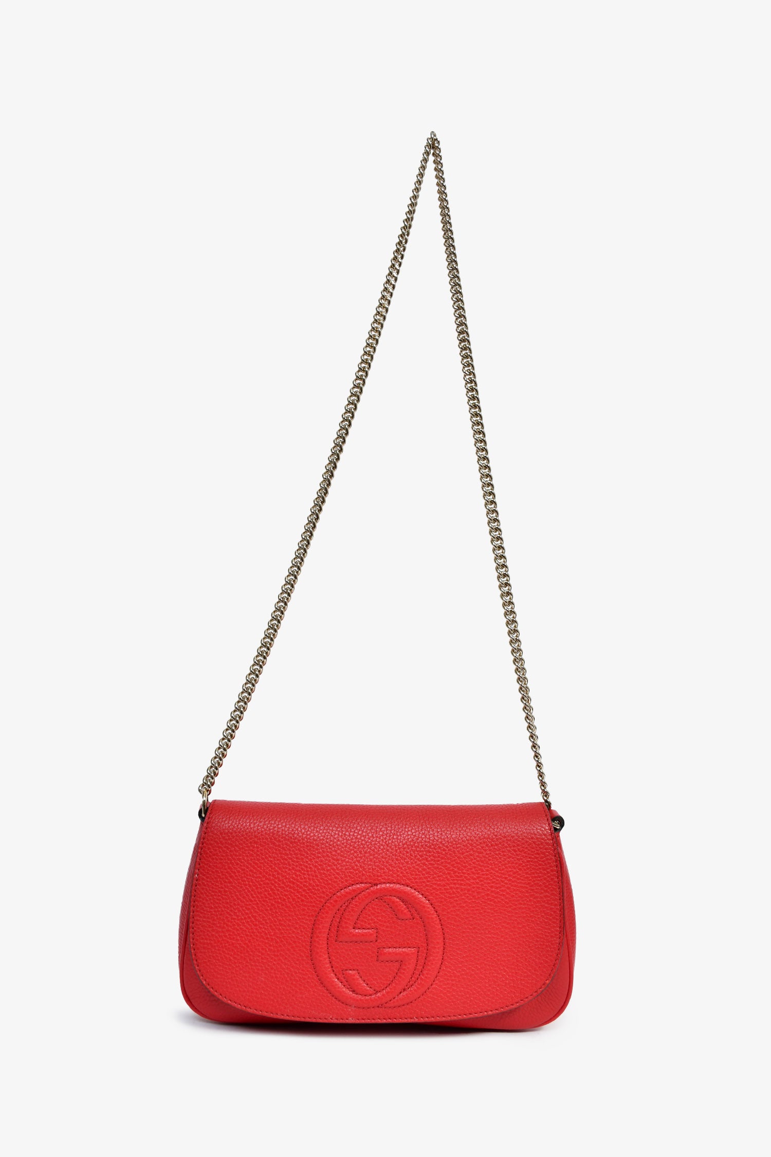 Refresh availabilityGucci Red Grained Leather Soho Chained Shoulder Bag. Fold-over flap with a snap closure. Chain-link shoulder strap. Coated trim. Lined canvas interior with a zipped compartment and single pocket. Attached tassel. Tonal stitching.