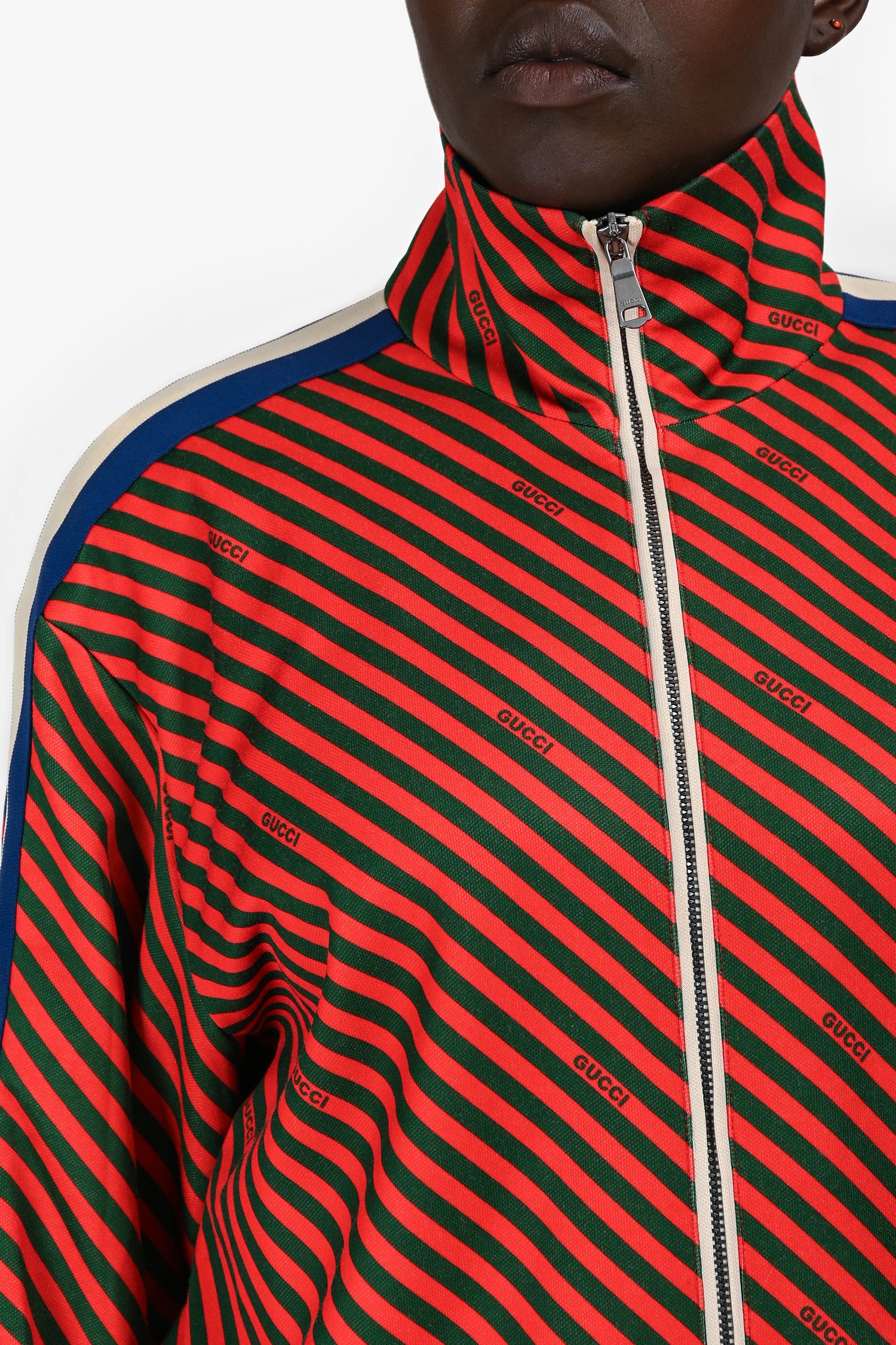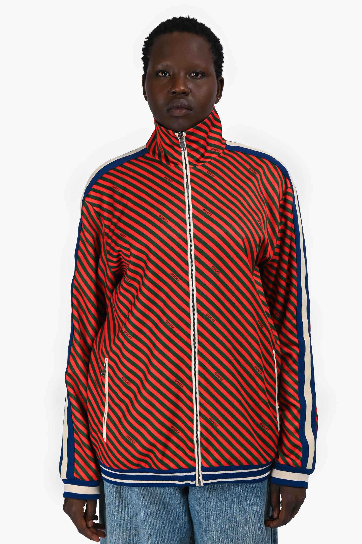 Refresh availabilityGucci Red/Green Striped Zip-Up Jacket. Lined. Front zip pockets. Ribbed cuffs and hem.