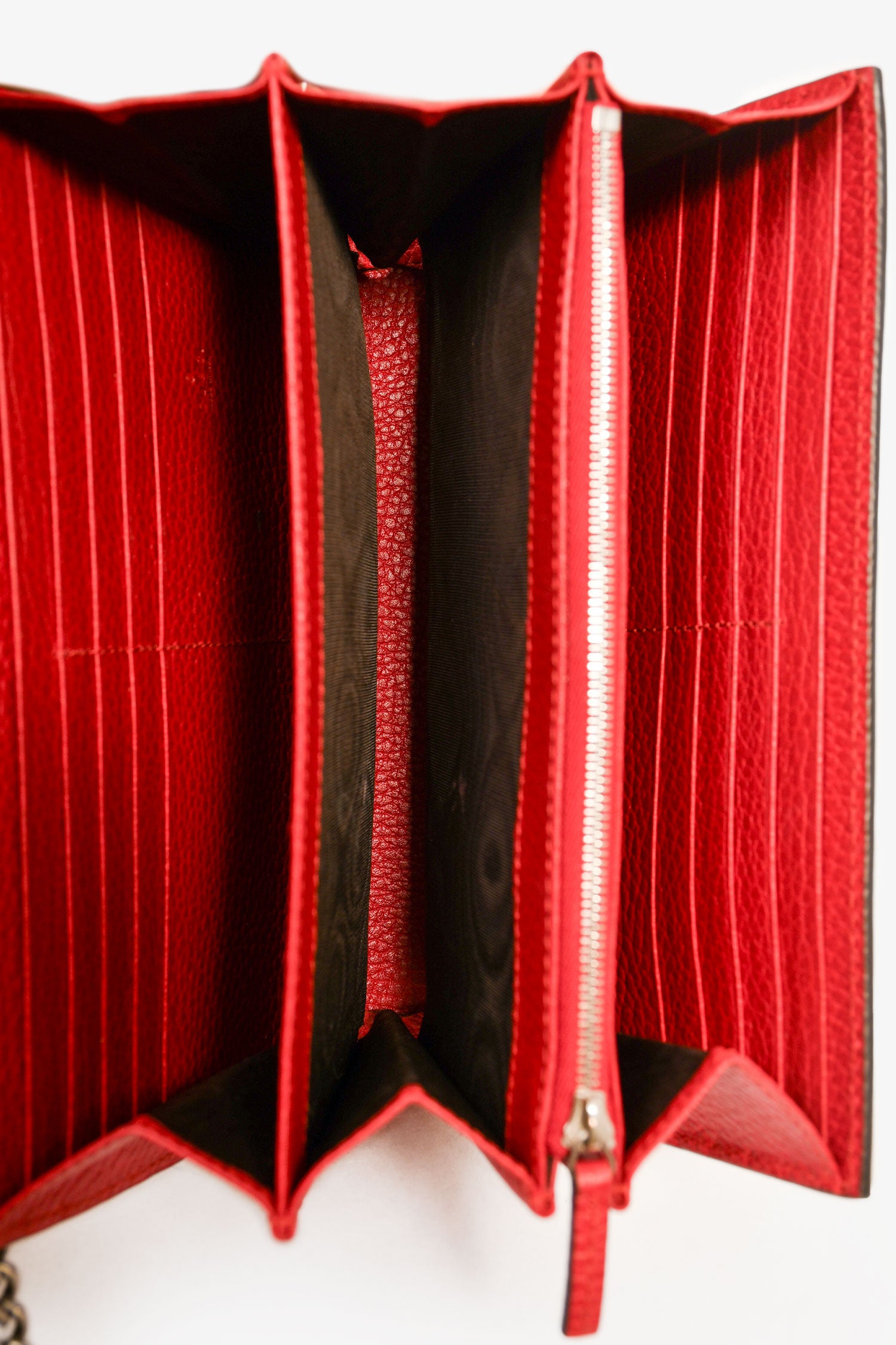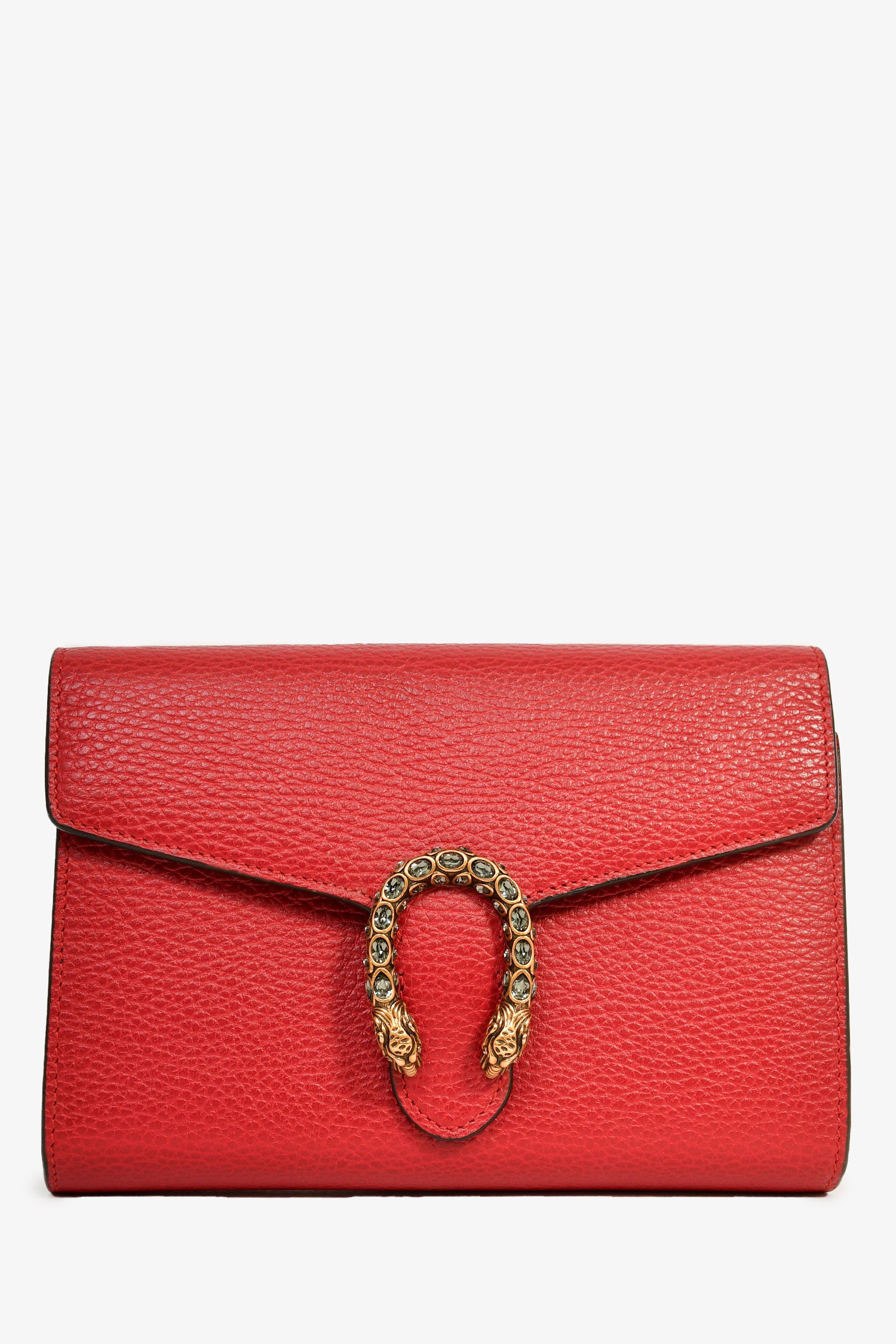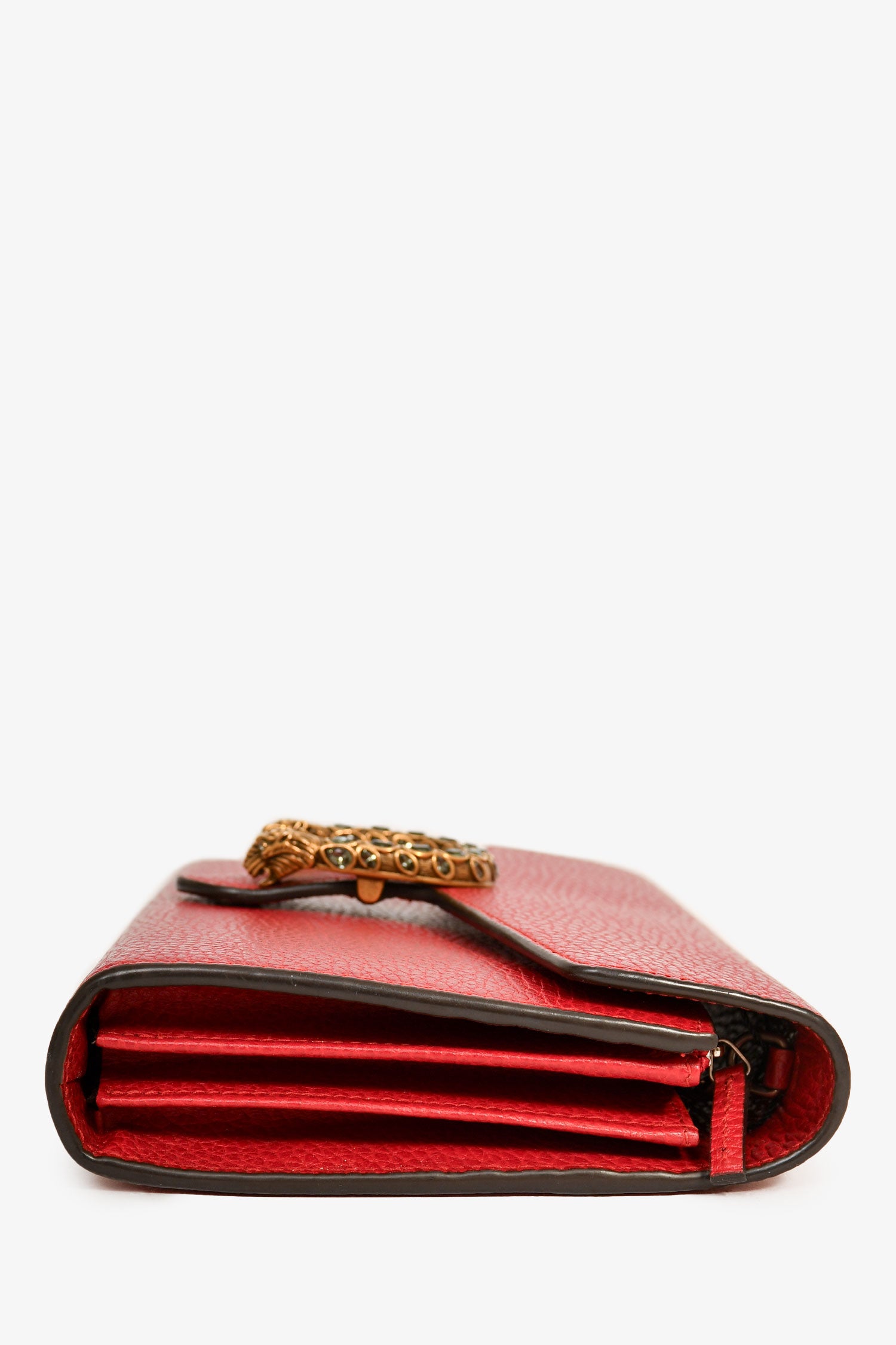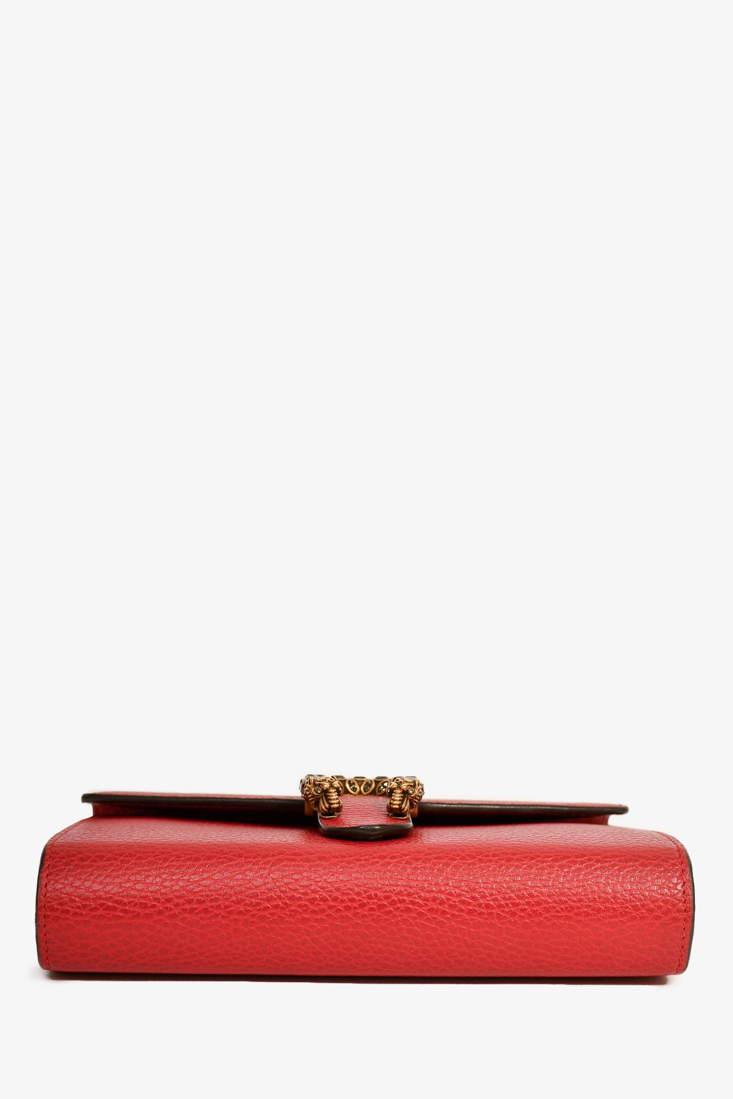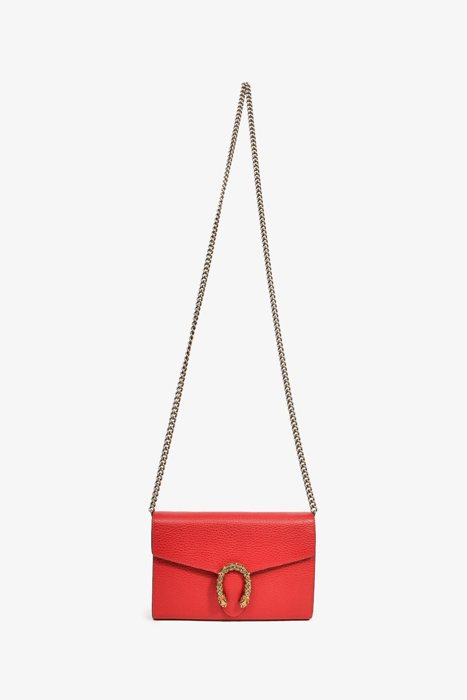 Refresh availabilityGucci Red Leather Dionysus Wallet On Chain. Antiqued gold-tone and silver-tone hardware. Fold-over flap. Snap closure. Chain-link shoulder strap. 3 interior compartments. 1 zipped compartments. 16 card slots. 2 bill compartments. Coated trimming. Tonal stitching.