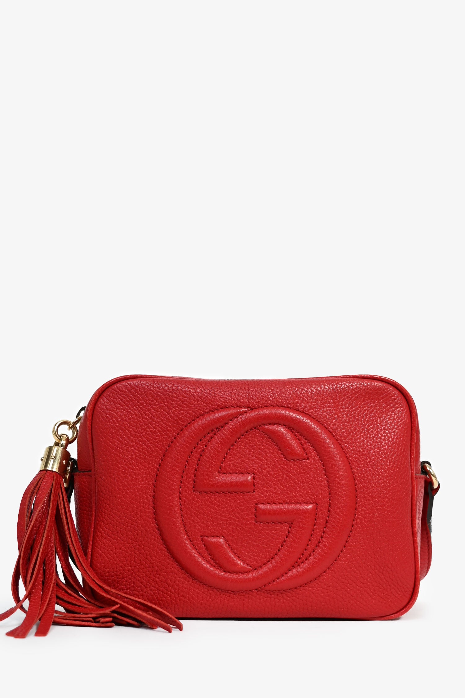 Refresh availabilityGucci Red Leather GG 'Blondie' Crossbody Bag. Gold-tone hardware. Adjustable crossbody strap. Lined canvas interior with a wall pocket. Attached tassel. Coated trimming. Tonal stitching.