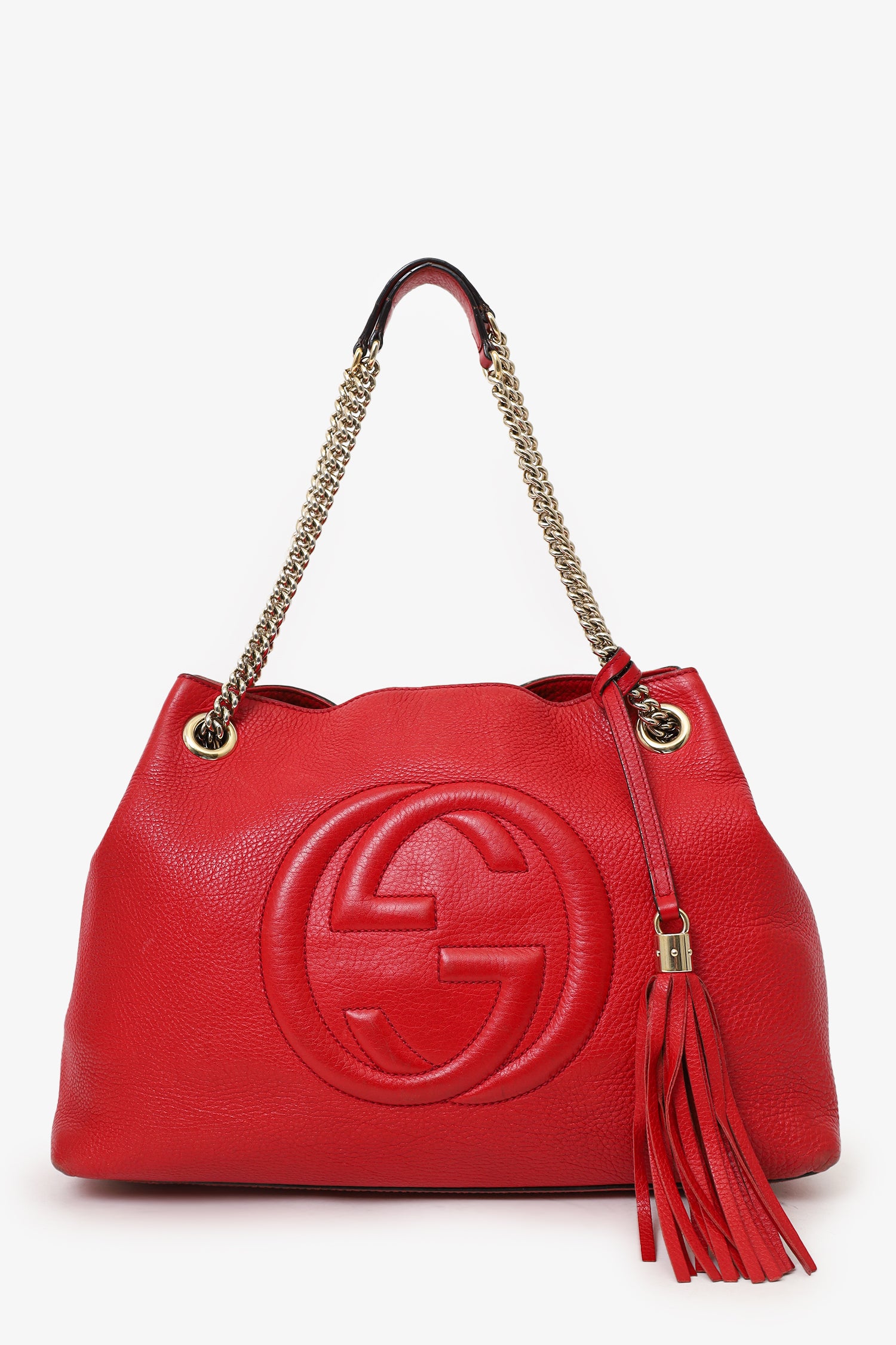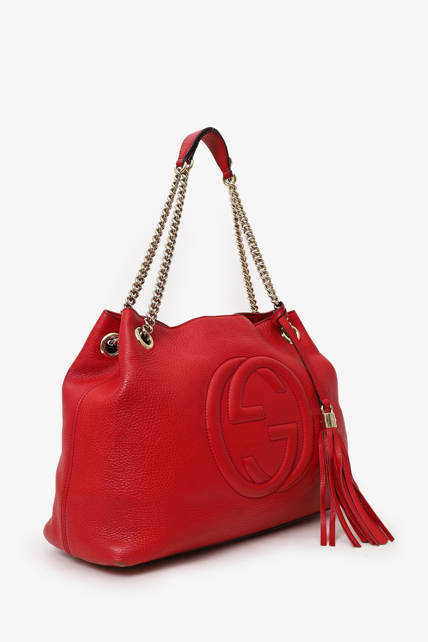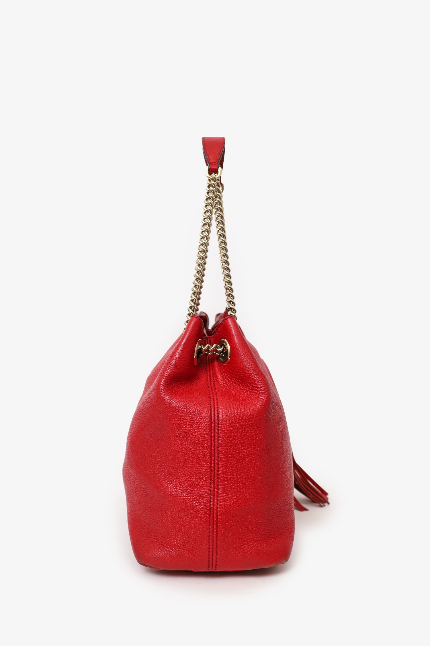 Refresh availabilityGucci Red Leather 'Soho' Chain Tote Bag. Top interior clasp closure. Twin chainlink straps that can be pulled into one long strap. Canvas lined interior. 3 interior pockets; 2 slip and 1 zip. Removable tassel charm. Silver-tone hardware. Tonal stitching.