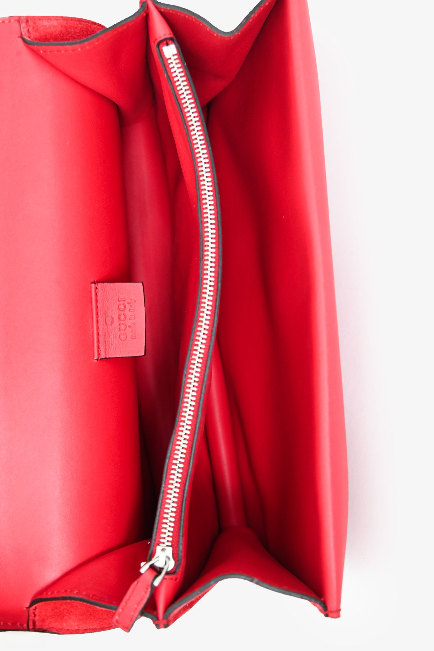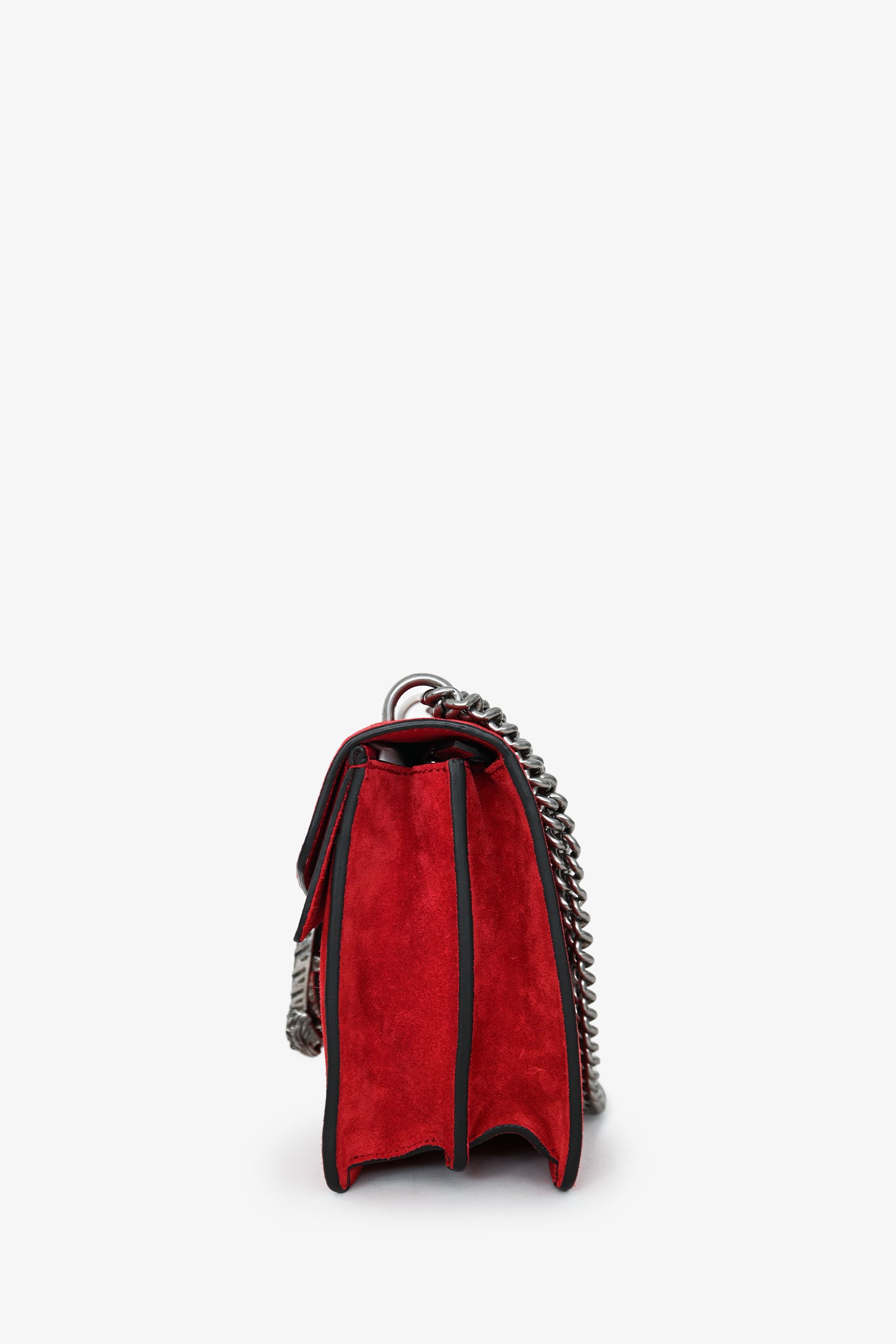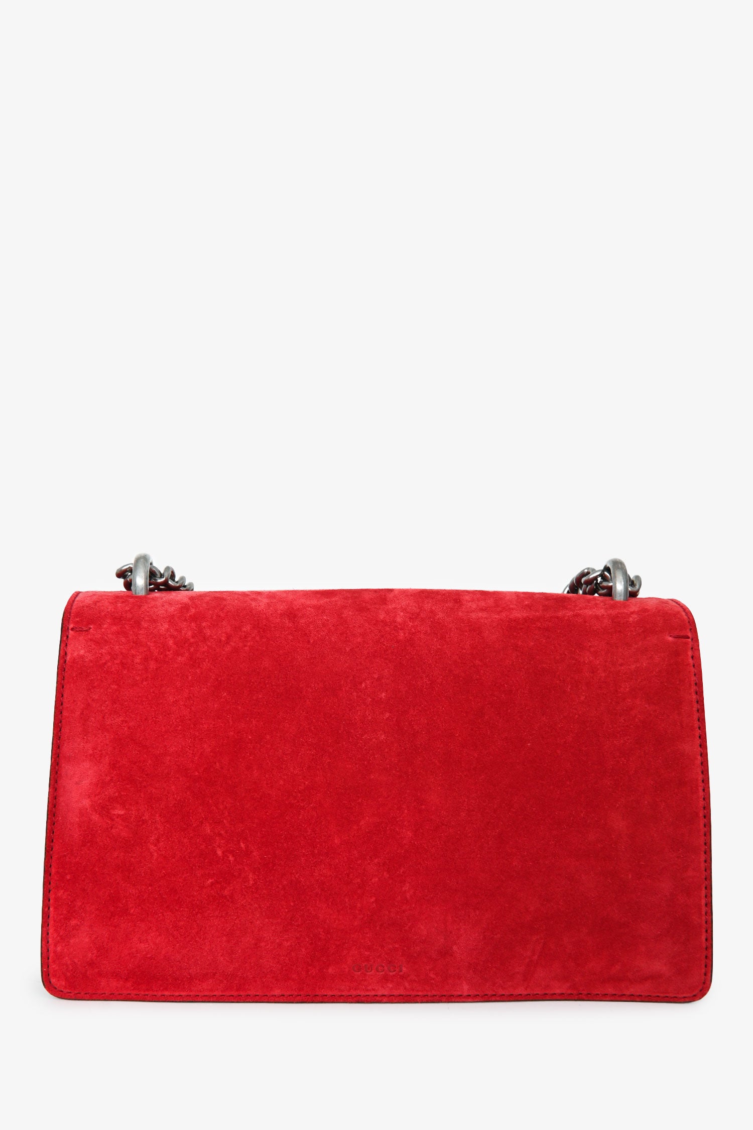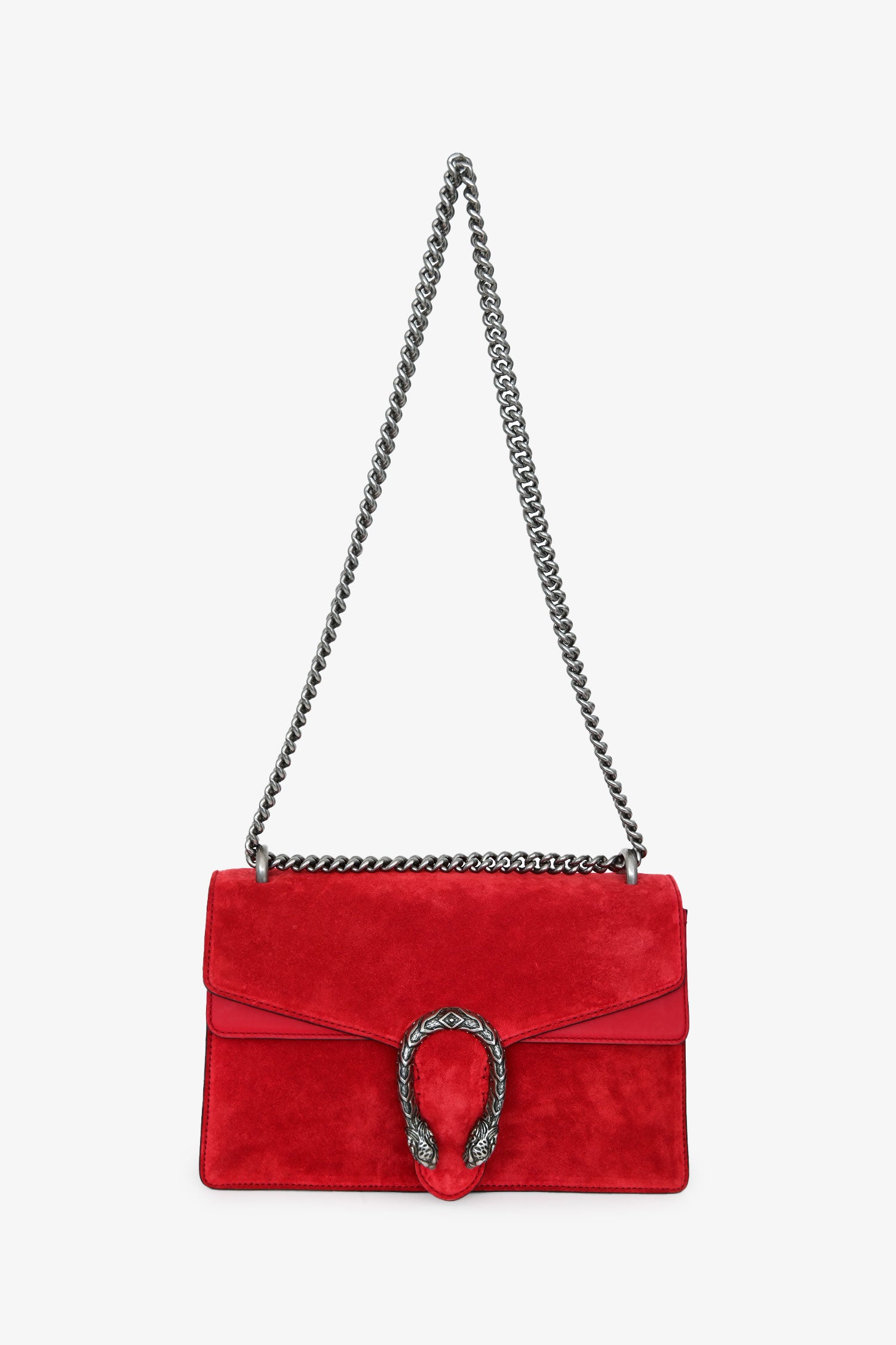 Refresh availabilityGucci Red Suede 'Dionysus' Medium Shoulder Bag. Front fold-over flap with push-lock closure. Slide-around chain. Leather-lined interior. 3 interior compartments; 2 open, 1 with zip closure. Silver-tone hardware. Tonal stitching.