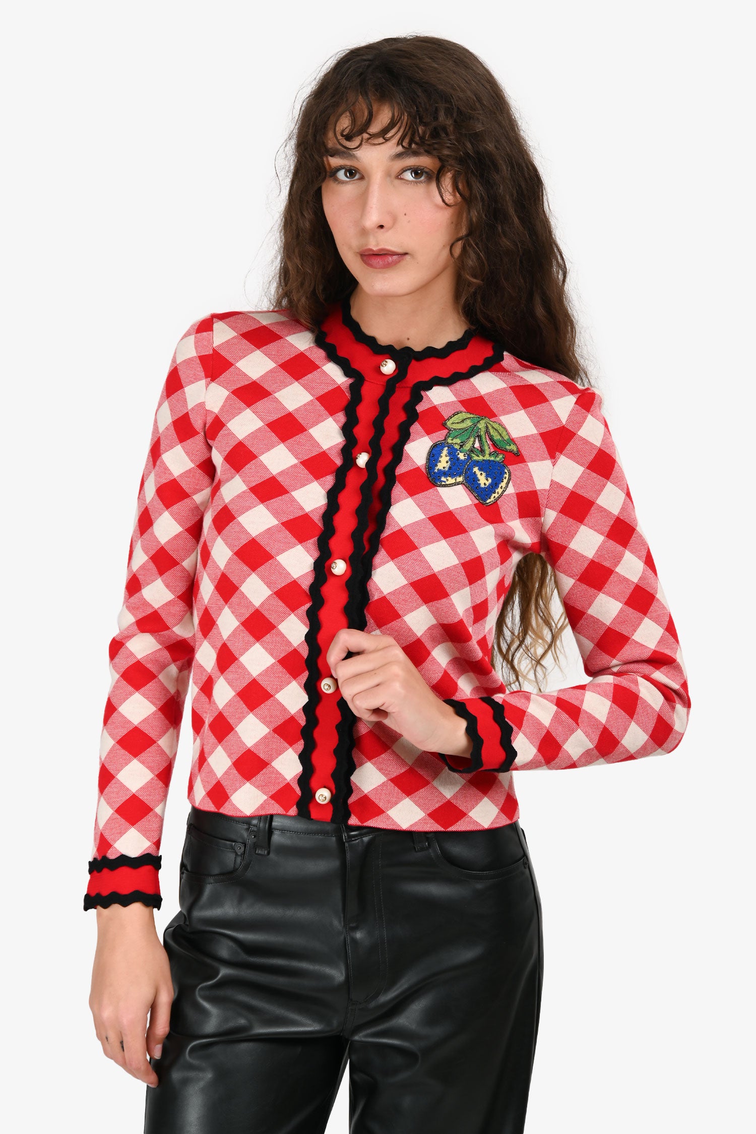 Refresh availabilityGucci Red Wool Patterned Strawberry Embroidered Cardigan. Slip-on. Round neckline. Front button-up closure. Structured shoulders. Gold-tone hardware. Tonal stitching.