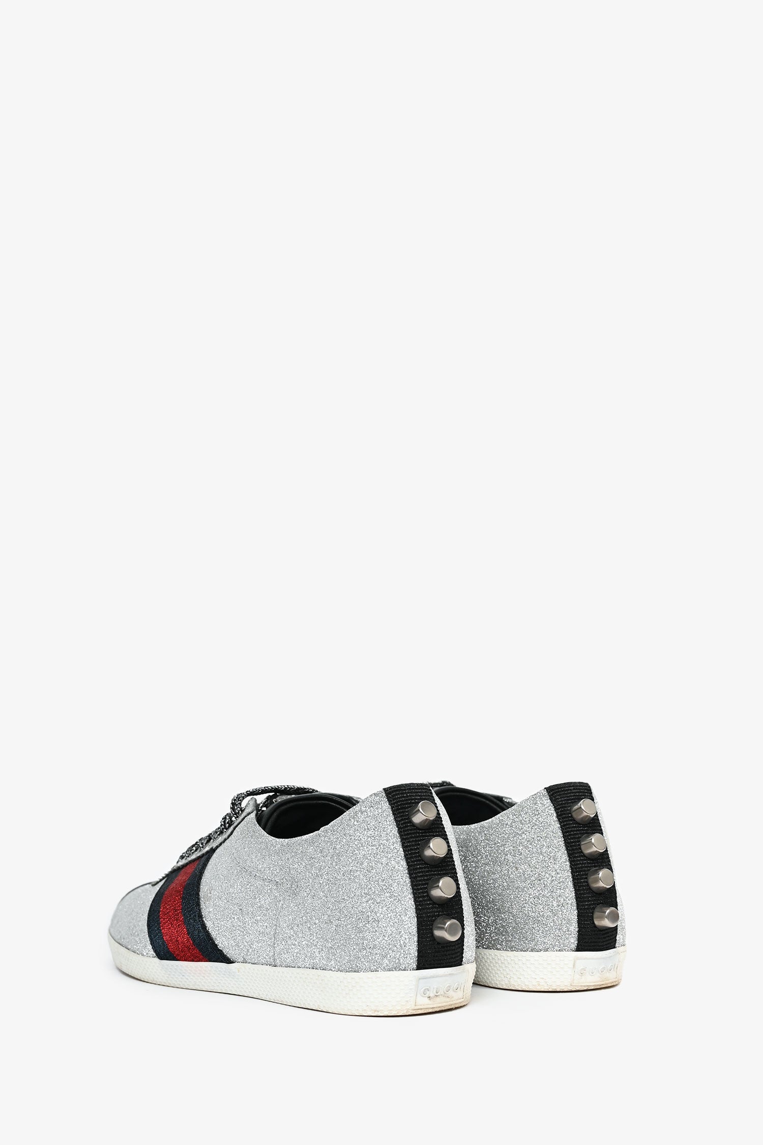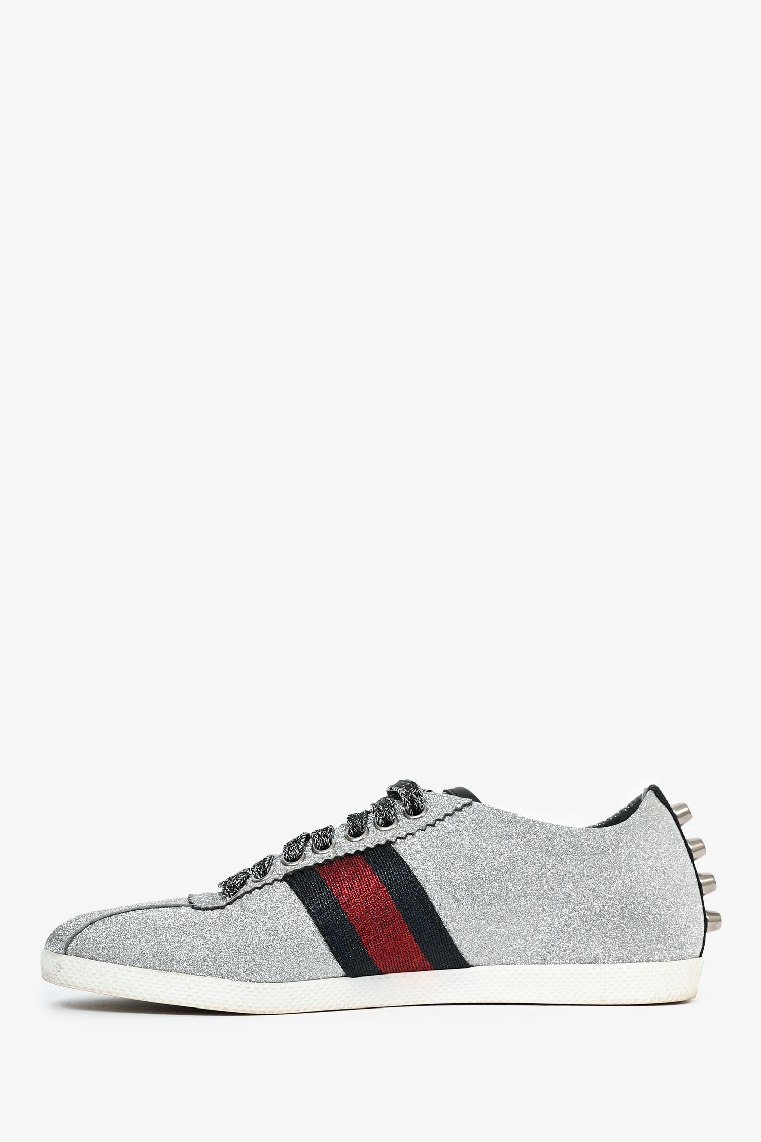 Refresh availabilityGucci Silver Metallic Web/Stud Accent Sneakers. Round toe. Lace-up closure.