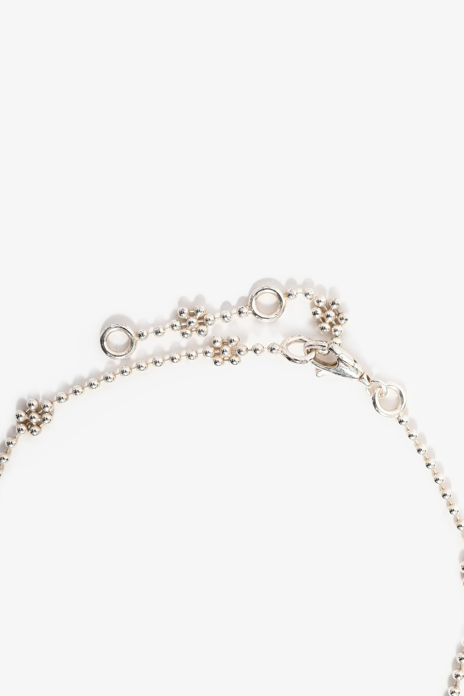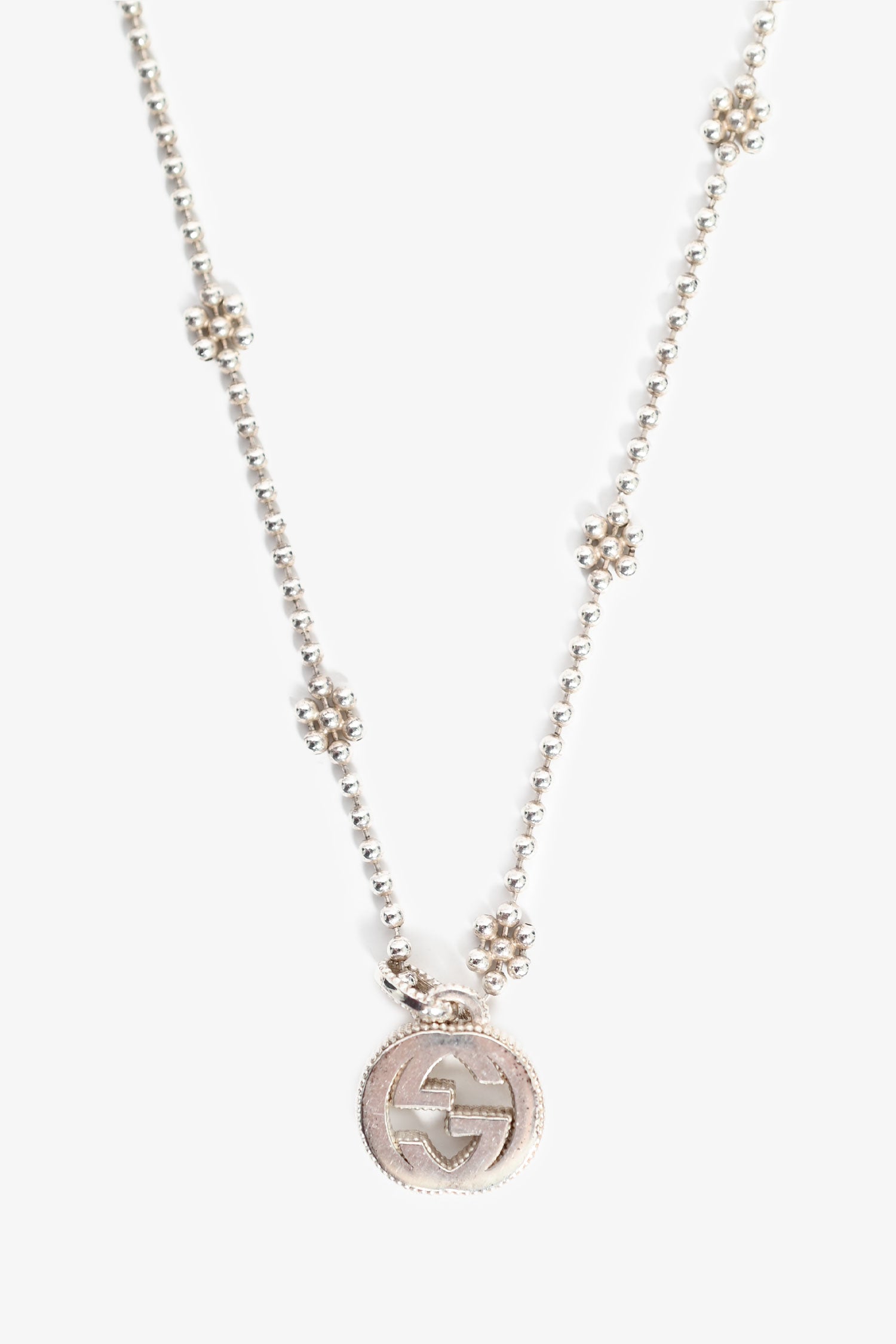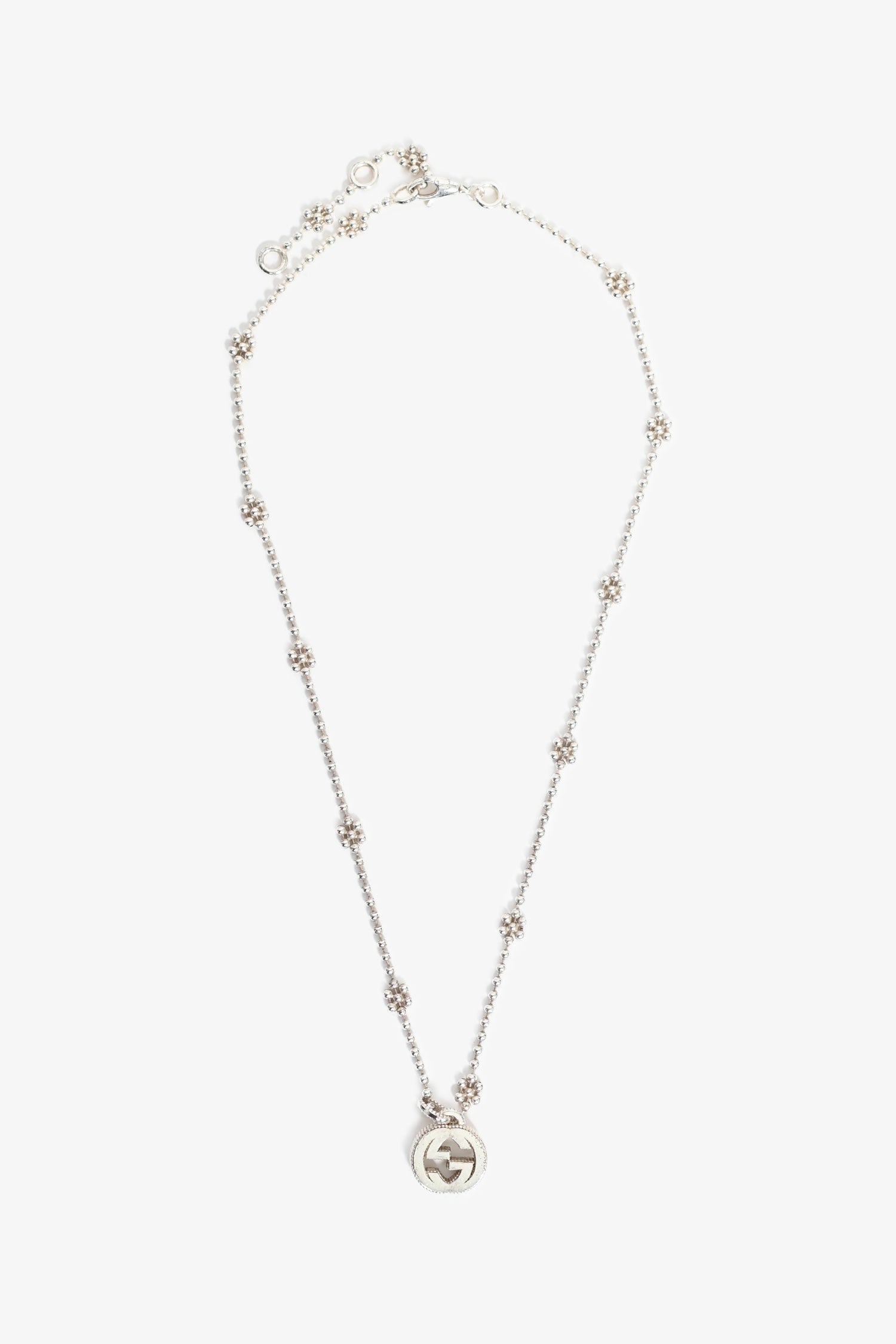 Refresh availabilityGucci Sterling Silver GG Pendant Necklace. Multi-bead chain-link. 'GG' pendant. Lobster clasp closure.