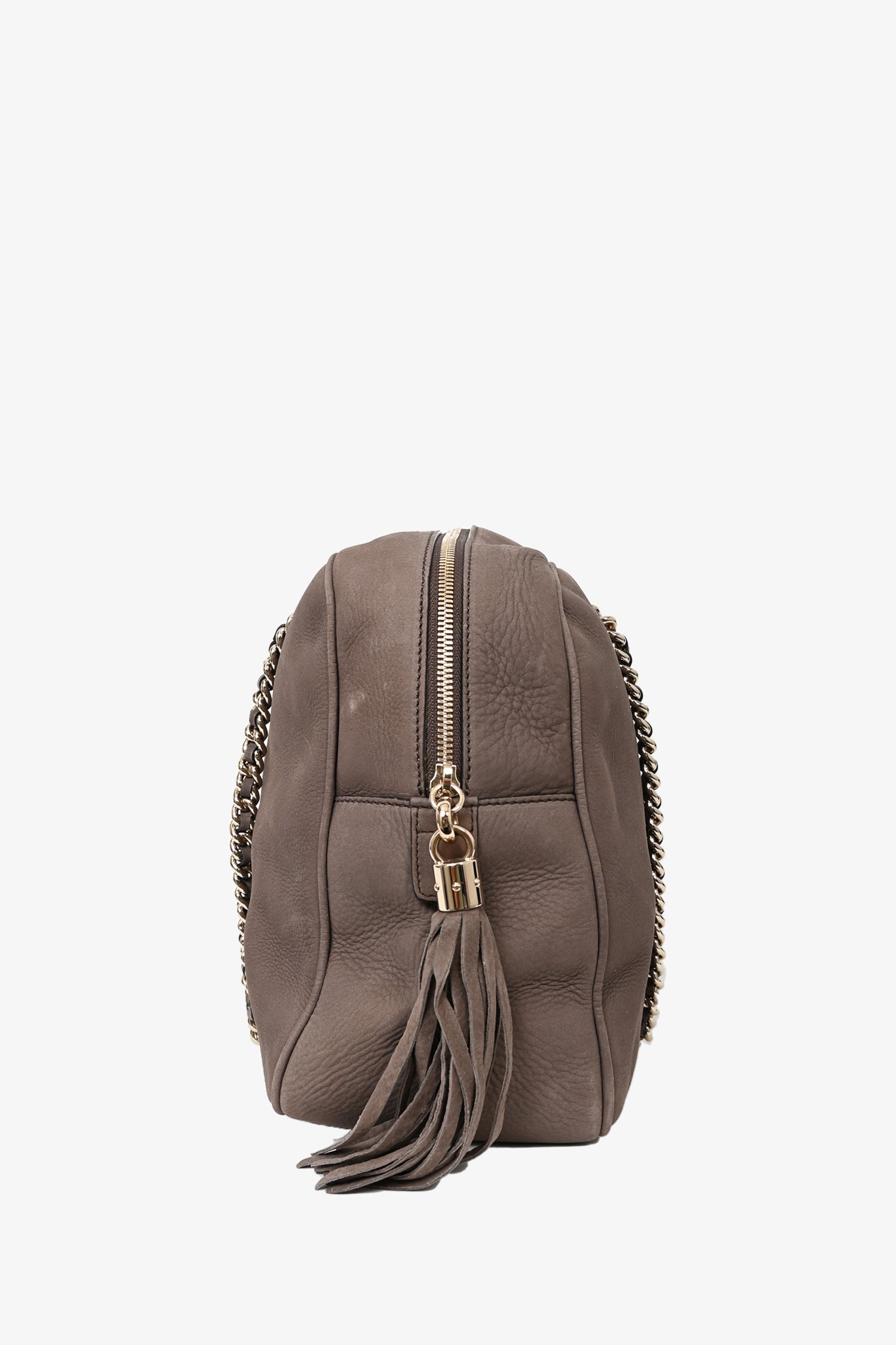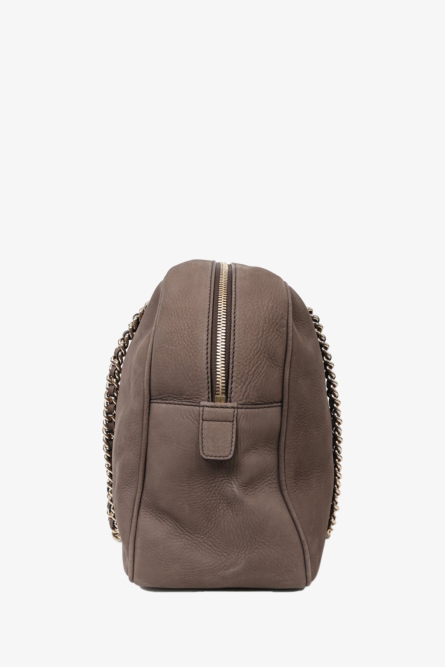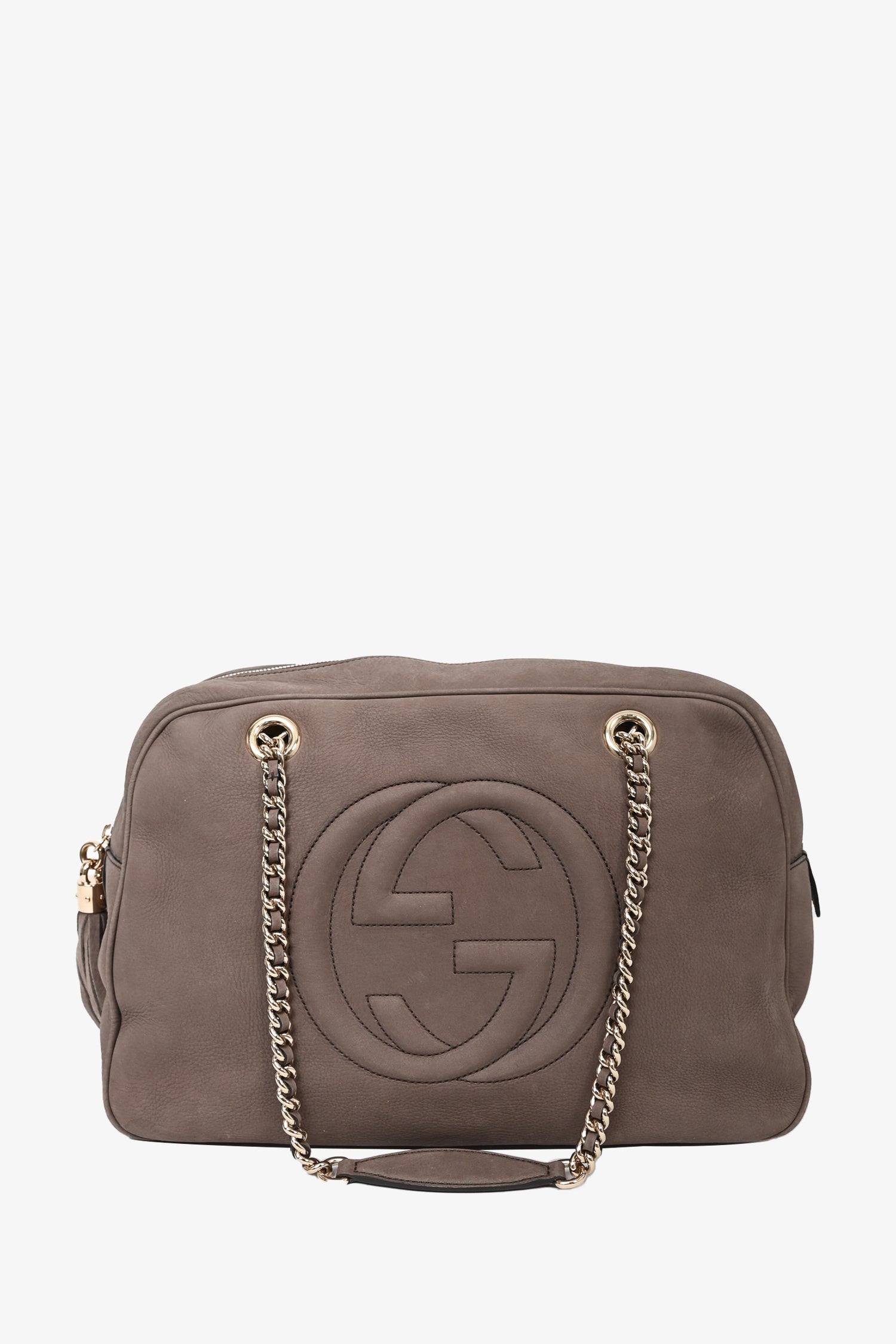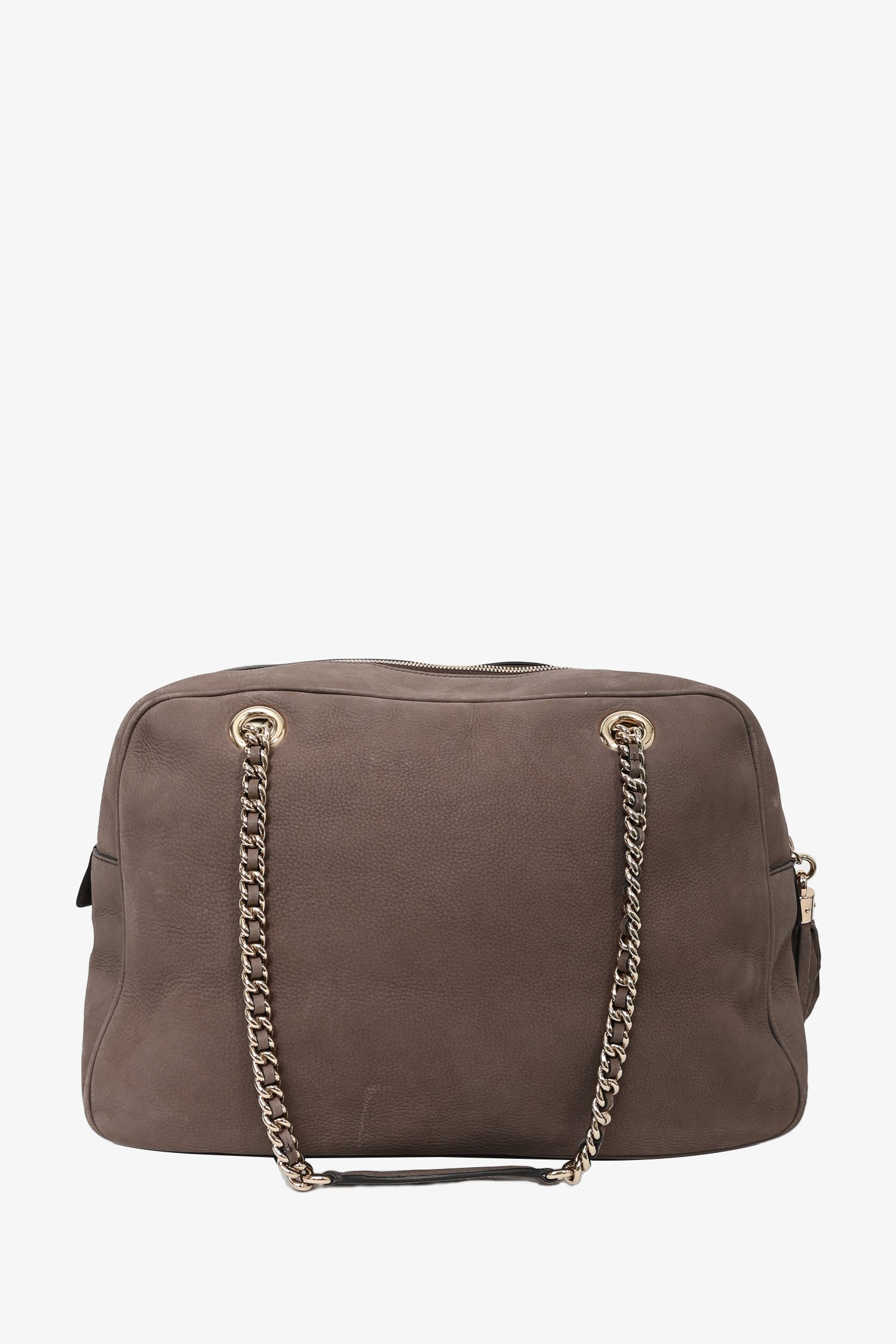 Refresh availabilityGucci Taupe Suede Soho Medium Chain Shoulder Bag. 2 interior slip pockets. 1 interior zip pocket. Top zip closure. Silver-tone hardware. Tonal stitching.