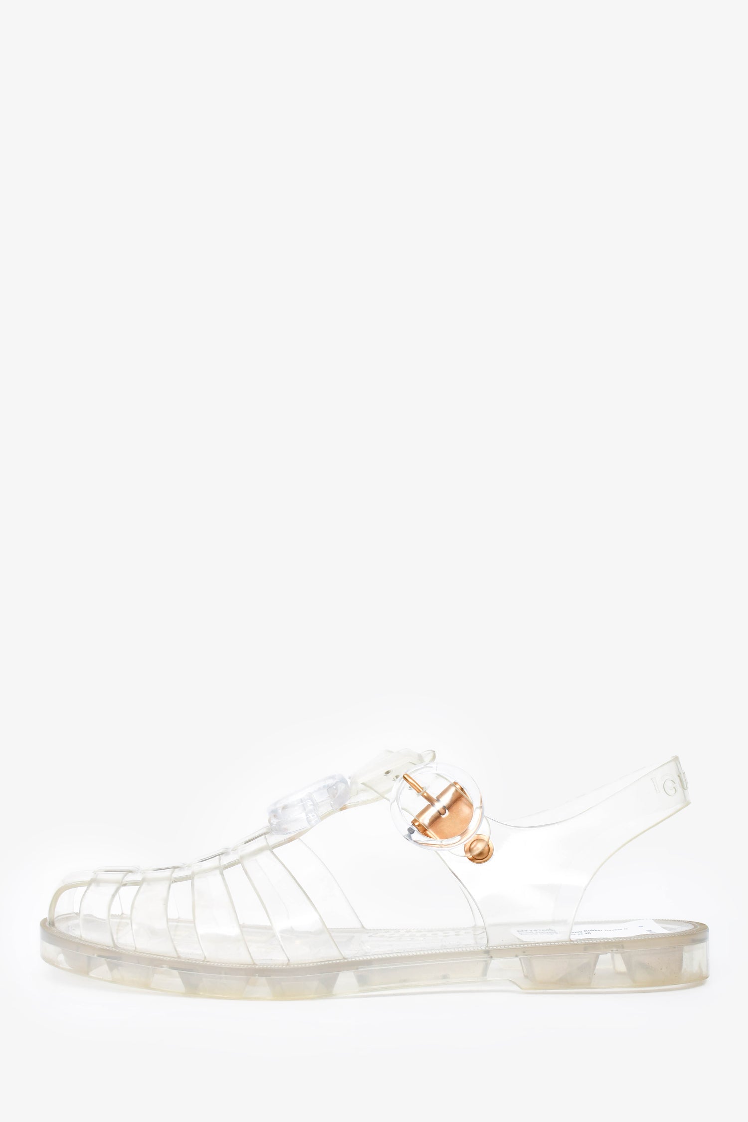 Refresh availabilityGucci Transparent Shiny Rubber Double G Buckle Strap Sandals. Ankle buckle strap. Gold-tone hardware.