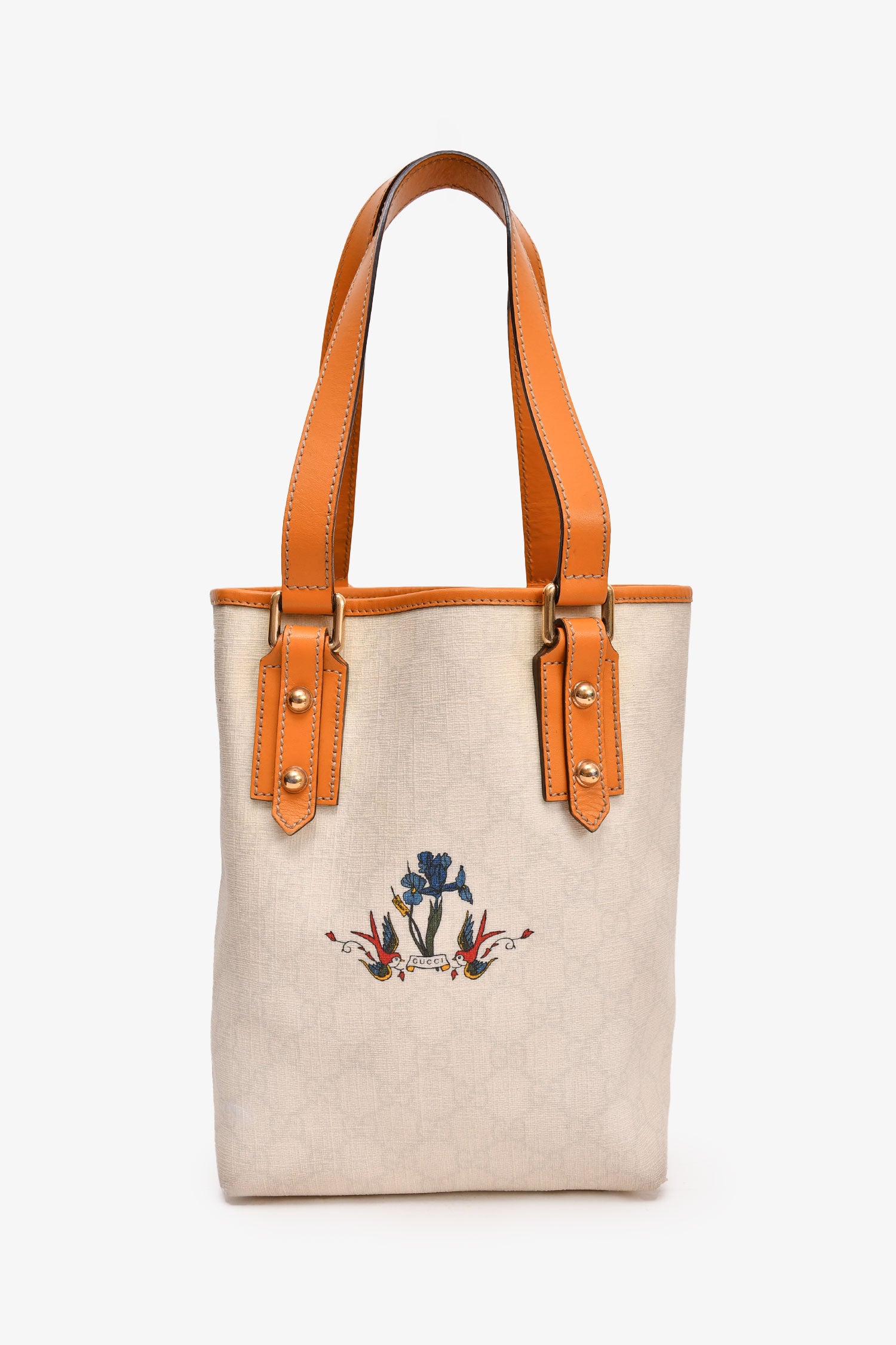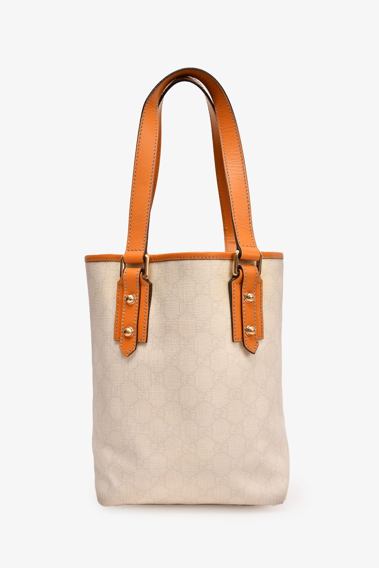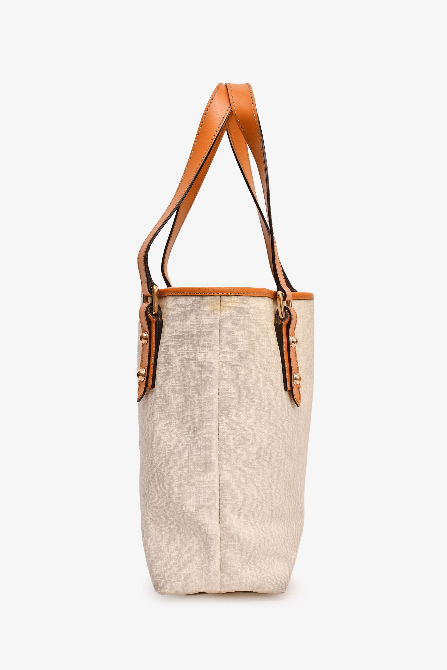 Refresh availabilityGucci White/Brown Canvas/Leather GG Supreme Tote. Dual handles. Open top. Brown logo'd textile interior lining. Single interior wall zip pocket. Gold-tone hardware.