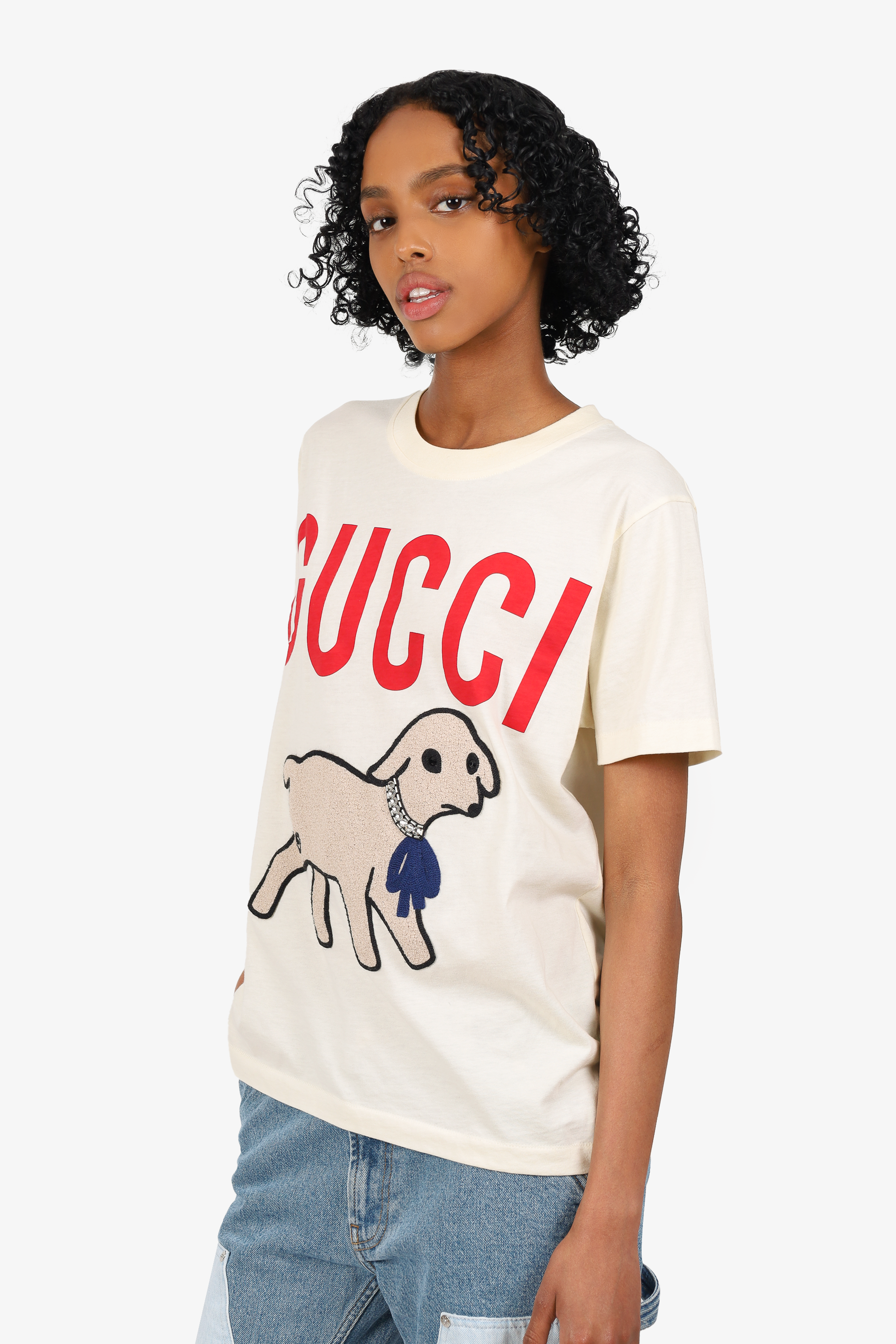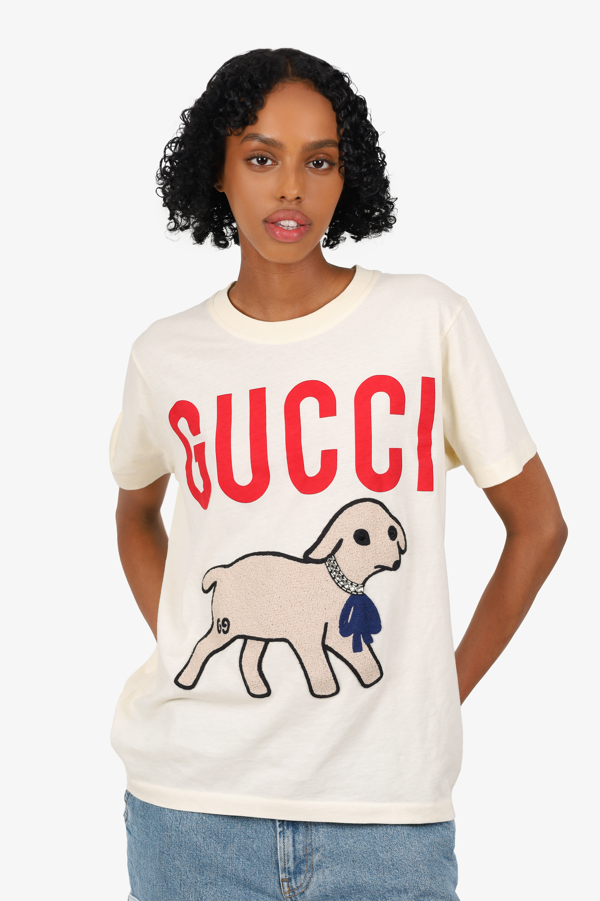 Gucci White Embellished Lamb Logo Graphic T-Shirt Size S