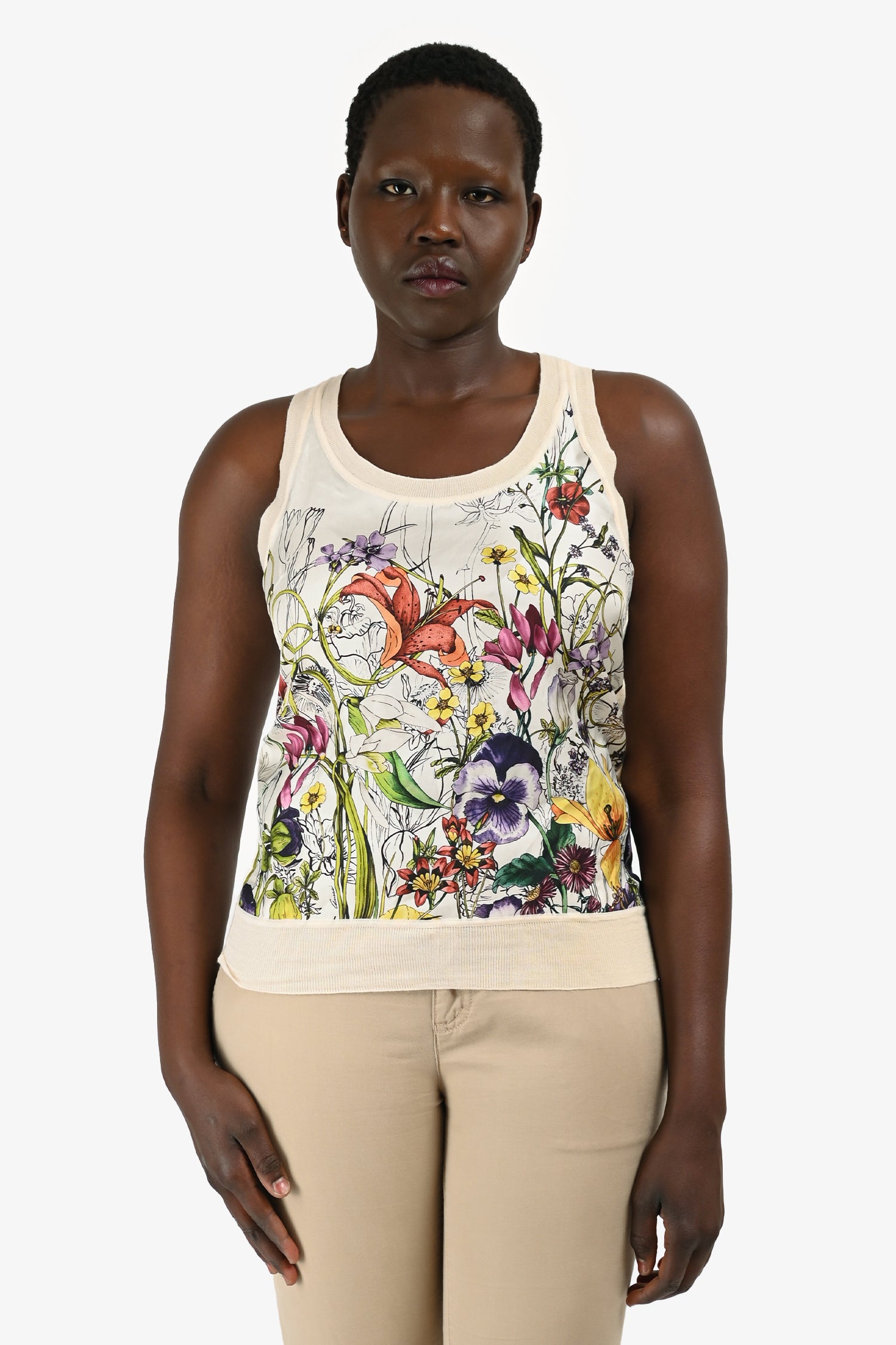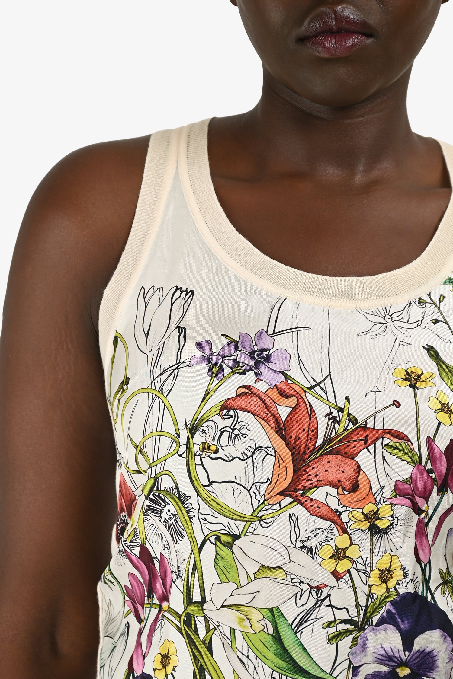 Refresh availabilityGucci White Garden Floral Silk Tank Top. Ribbed trimming. Floral motif print on silk. Wool and cashmere rear and ribbing. Tonal stitching.