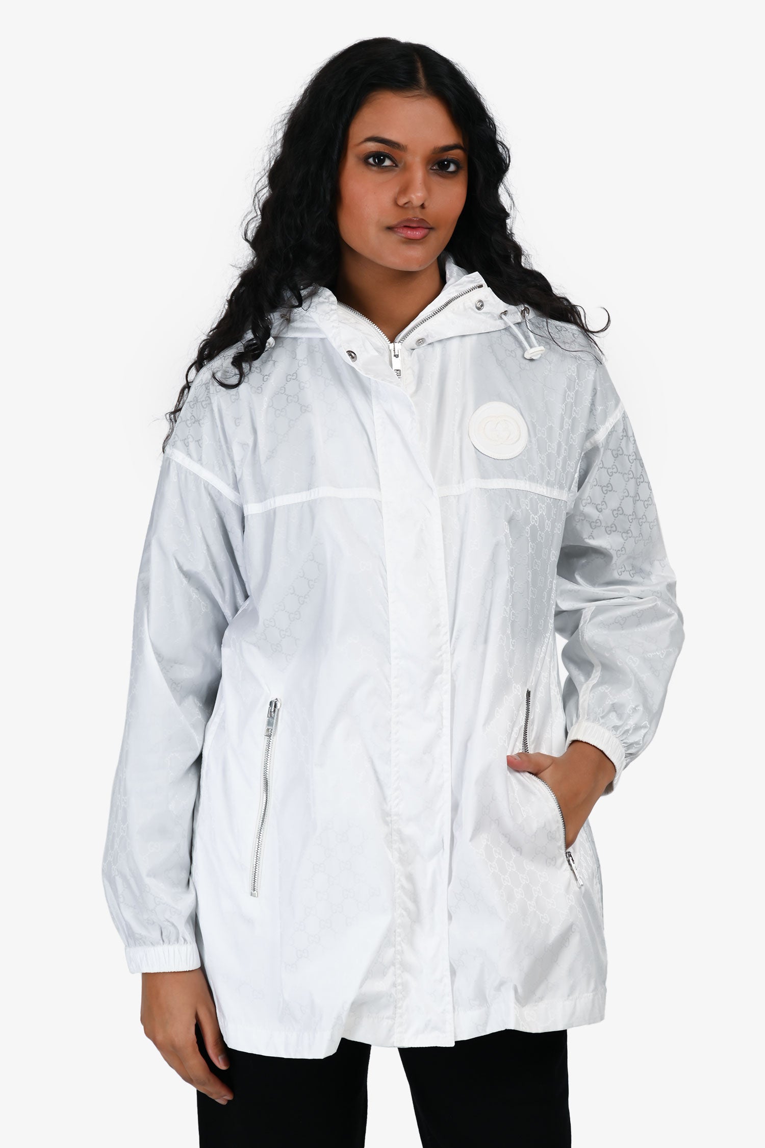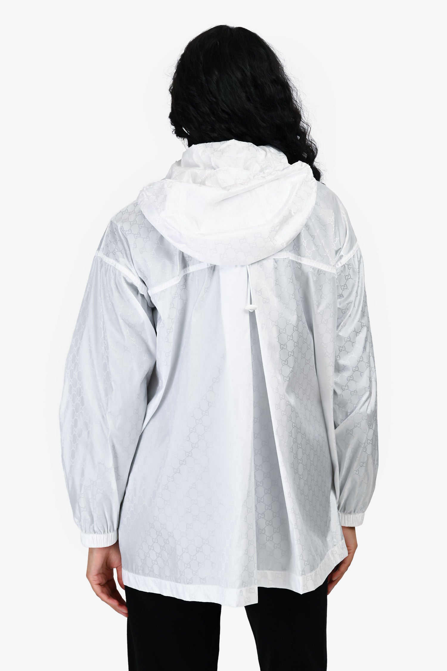 Refresh availabilityGucci White GG Monogram Windbreaker. Slip-on. Front 2-way zip closure. Cinch cord on the collar. 2 front zip pockets. Elasticized cuffs. Silver-tone hardware. Tonal stitching.