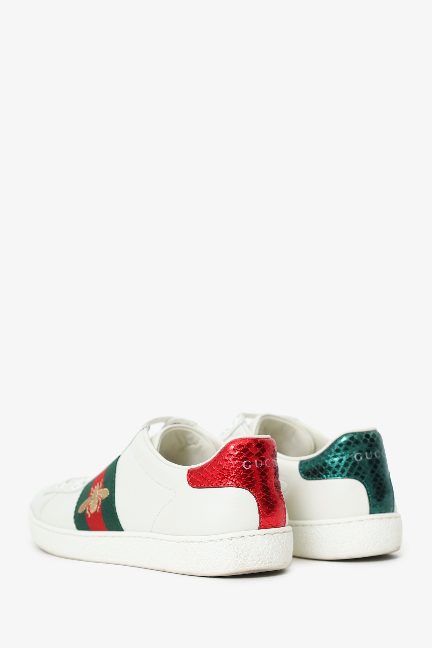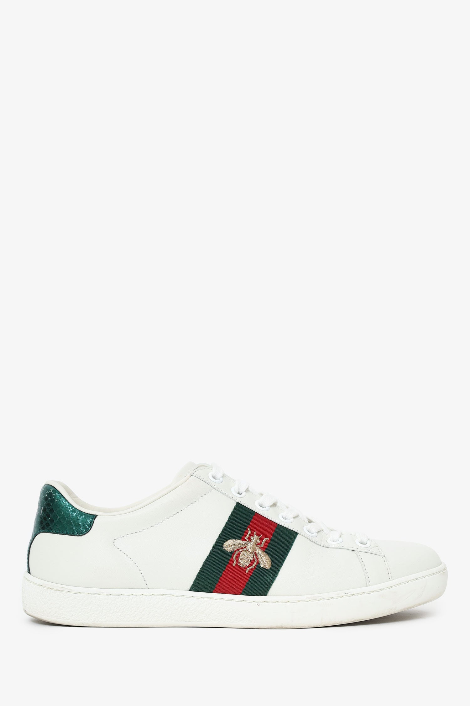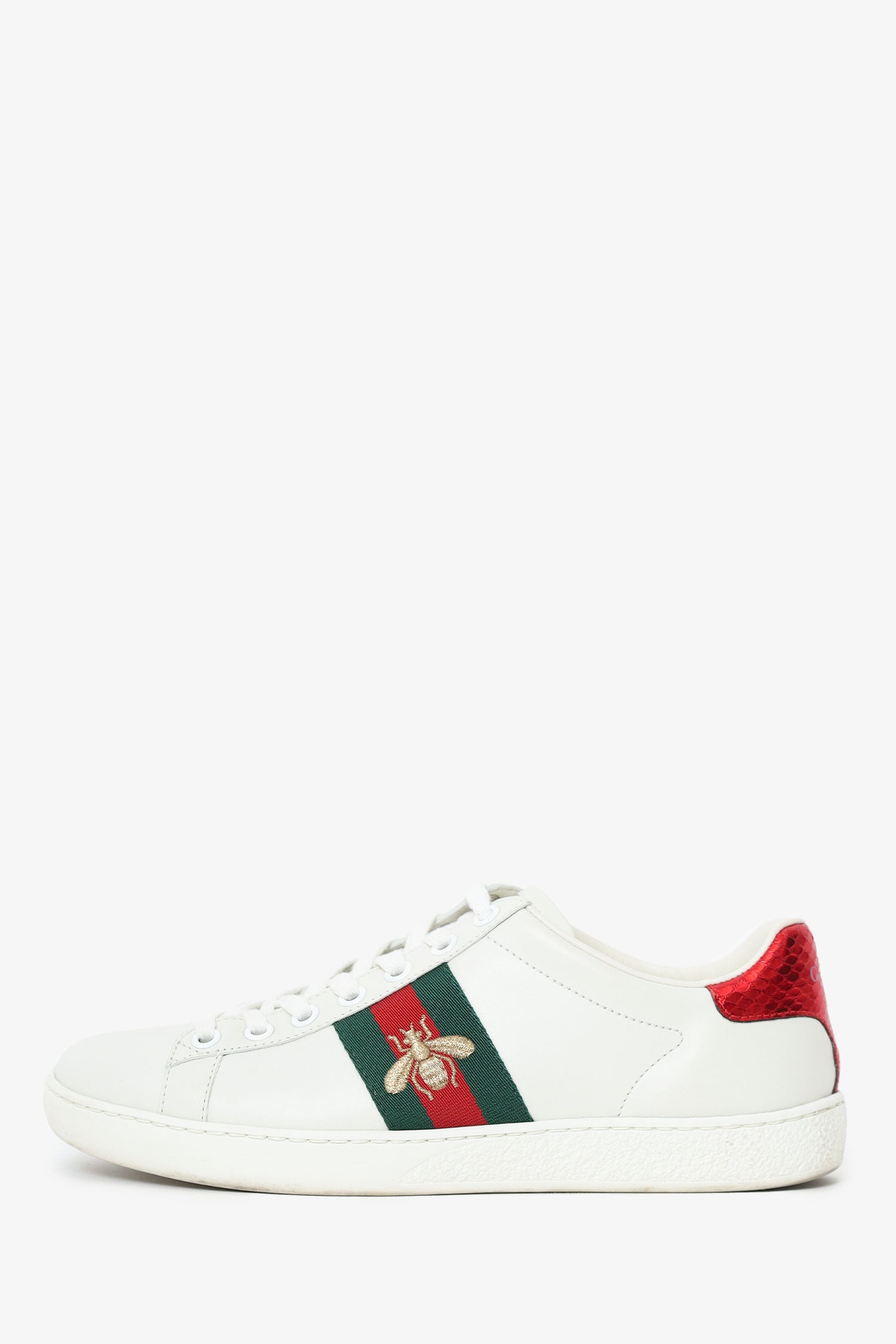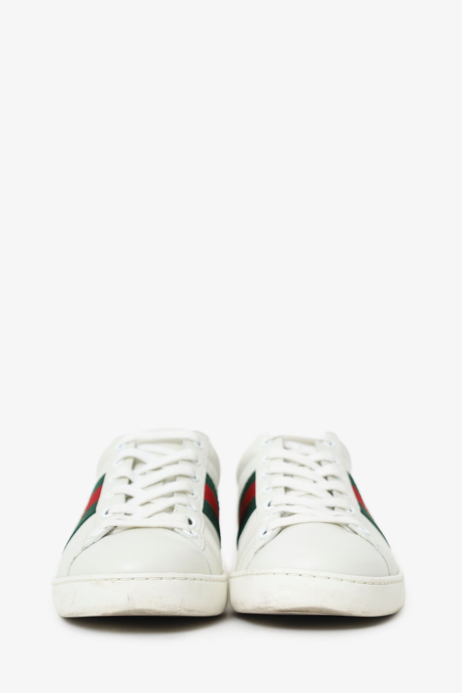 Refresh availabilityGucci White Leather Ace Sneakers. Slip-on. Round toe. Front lace-up closure. Side embellishment Gold-tone hardware. Tonal stitching.
