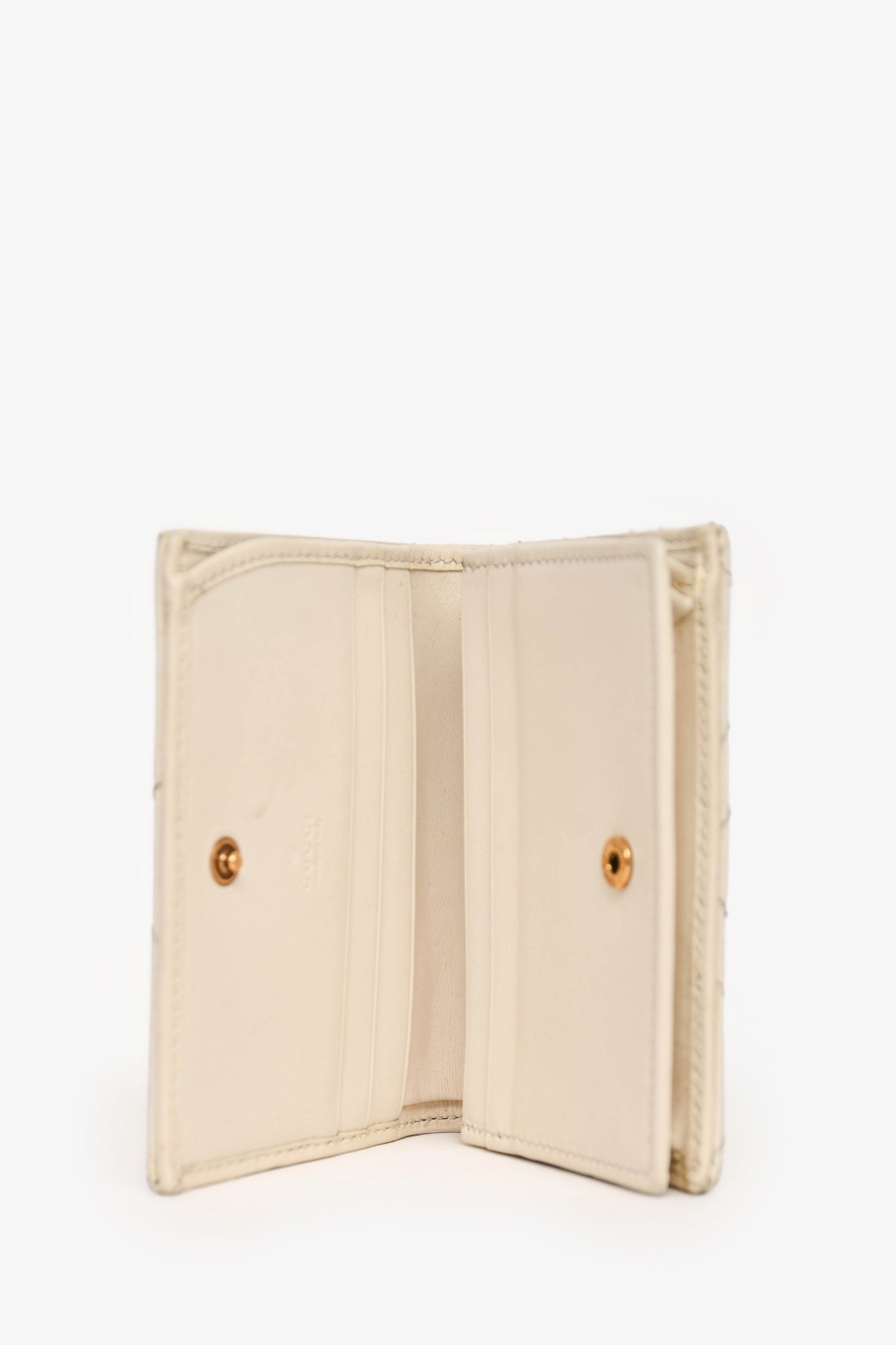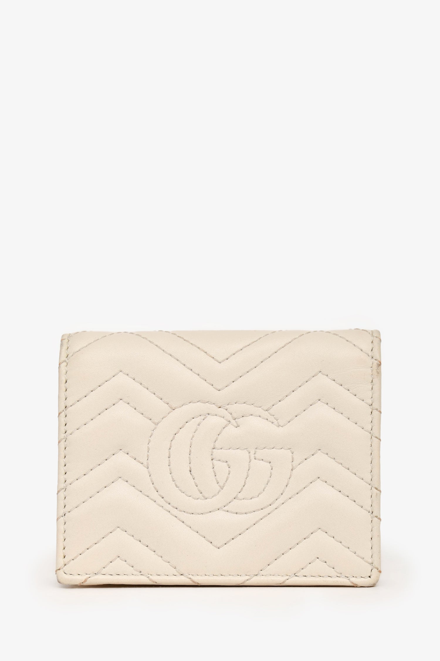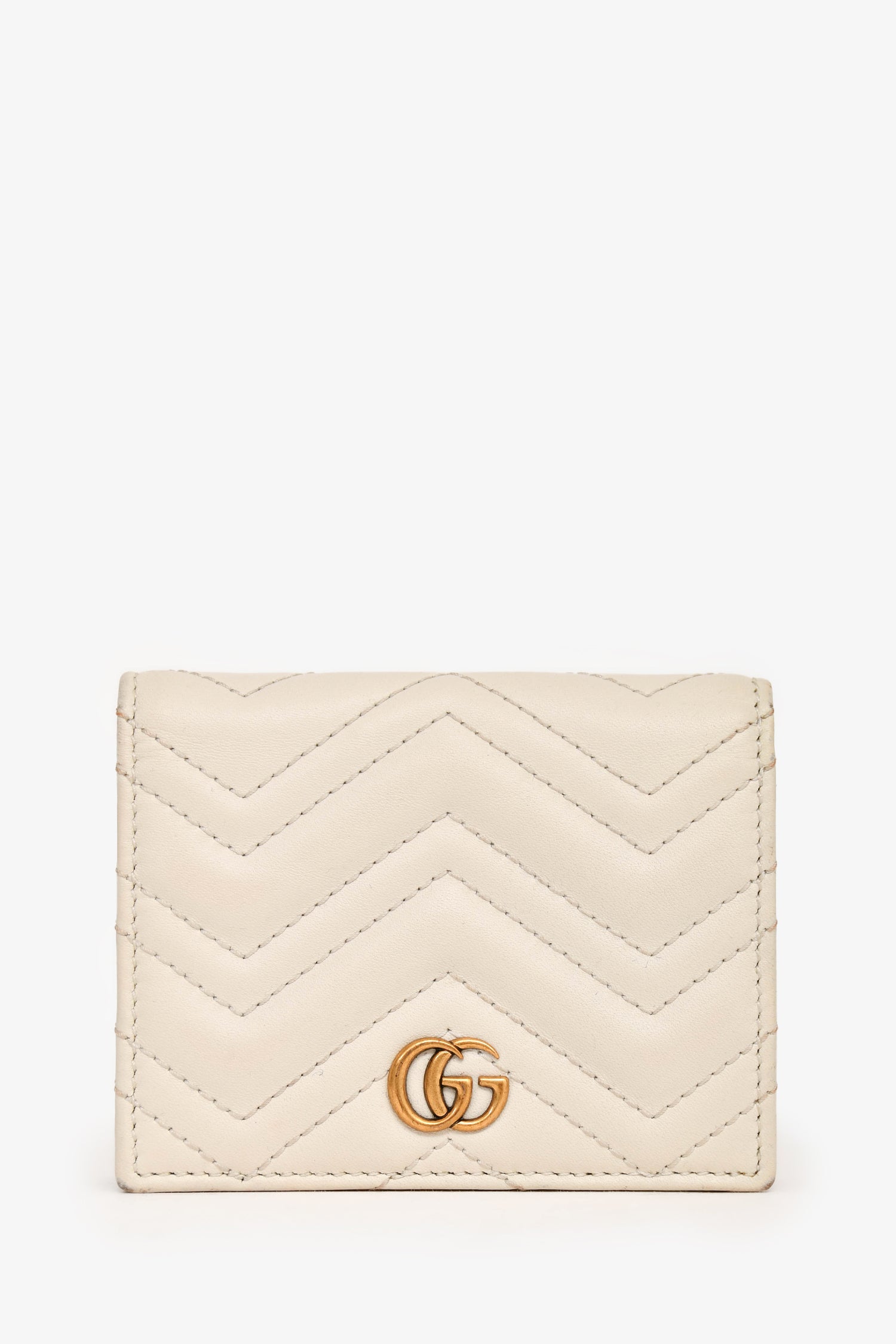 Refresh availabilityGucci White Leather Chevron Quilted GG Marmont Wallet. Fold with snap button closure. One bill compartment. Seven interior slip pockets. Gold-tone hardware. Tonal stitching.