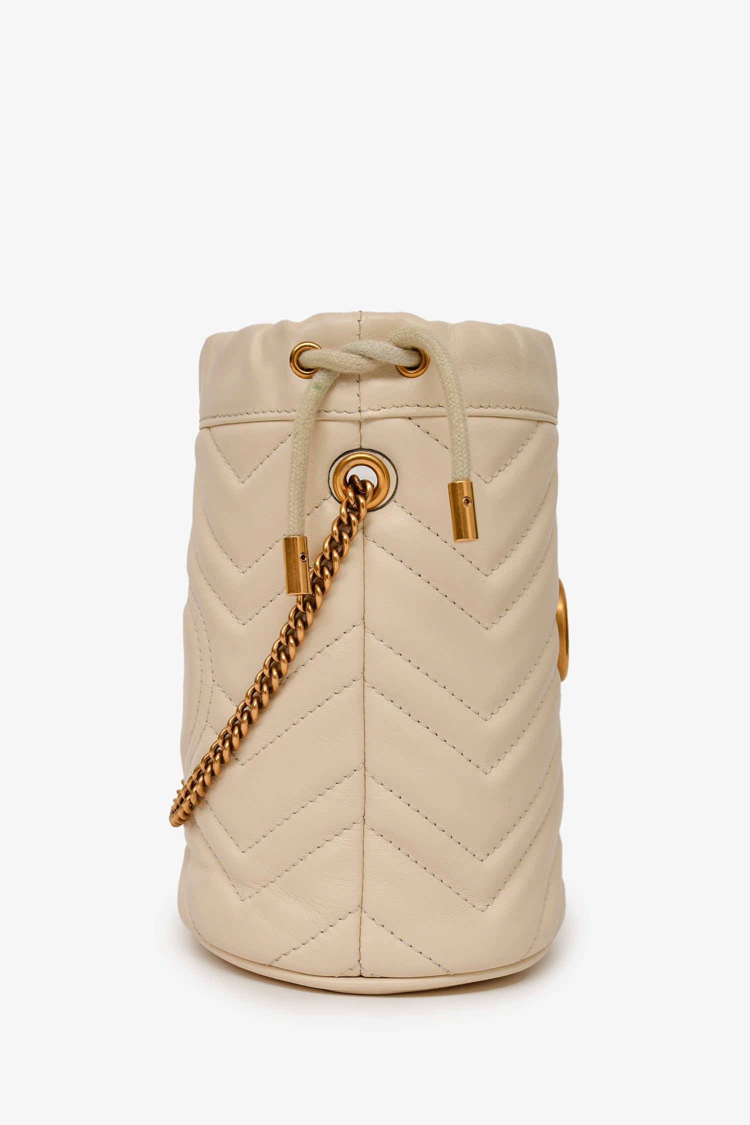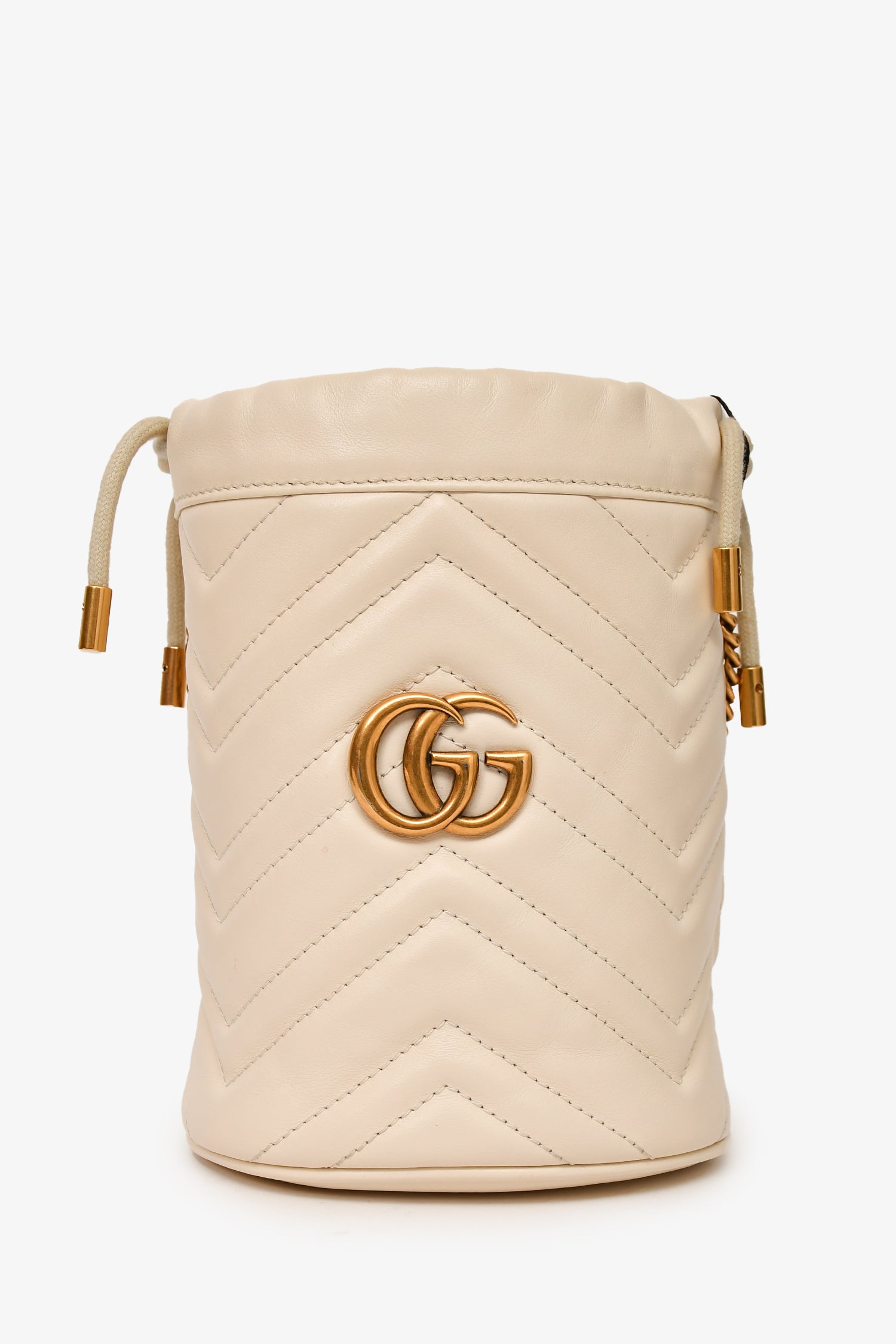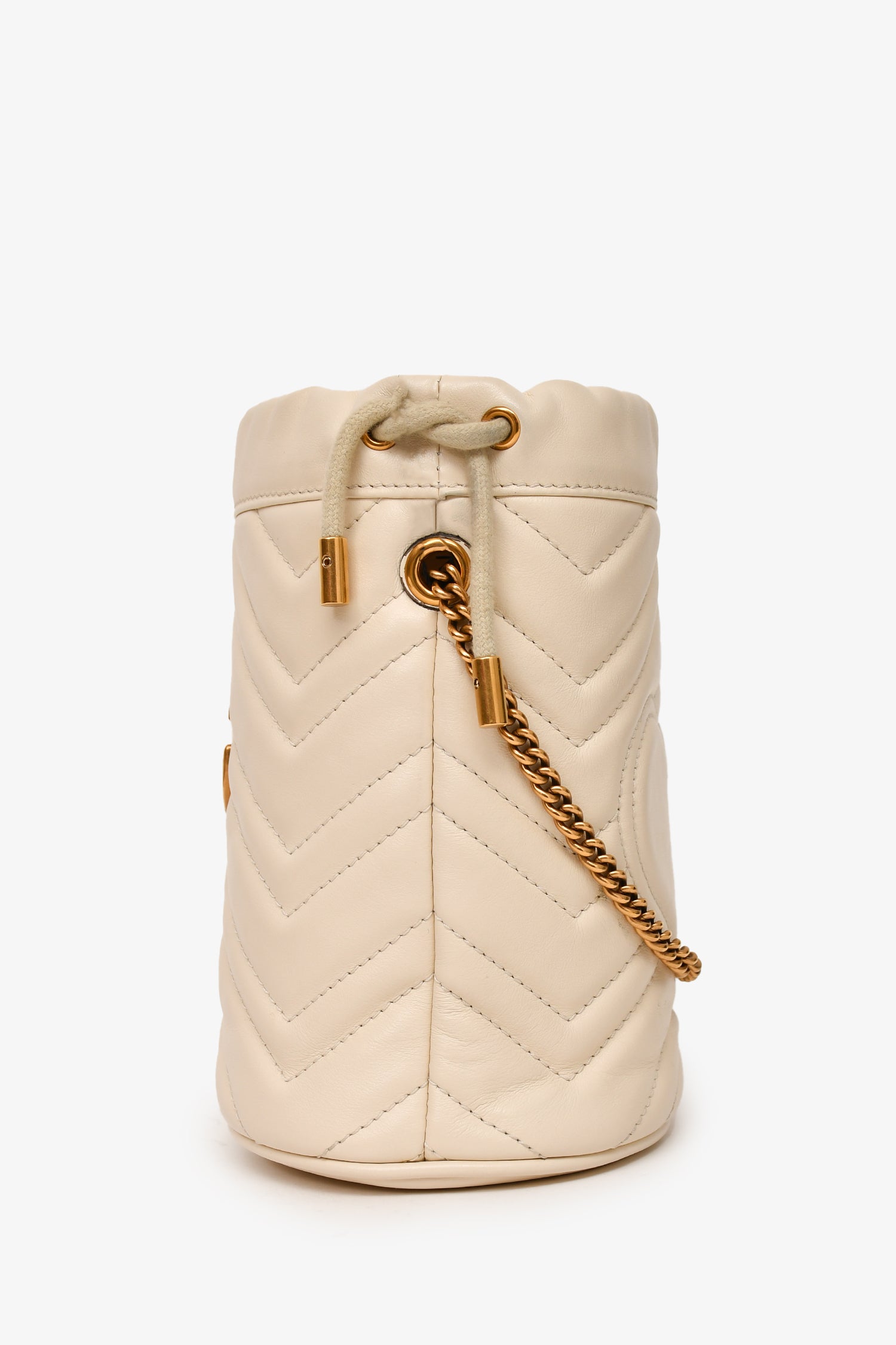 Refresh availabilityGucci White Leather Chevron Quilted Marmont Bucket Bag. Antiqued gold-tone hardware. Suede-lined interior with an interior card pocket. Chain-link strap. Drawstrings. Tonal stitching.