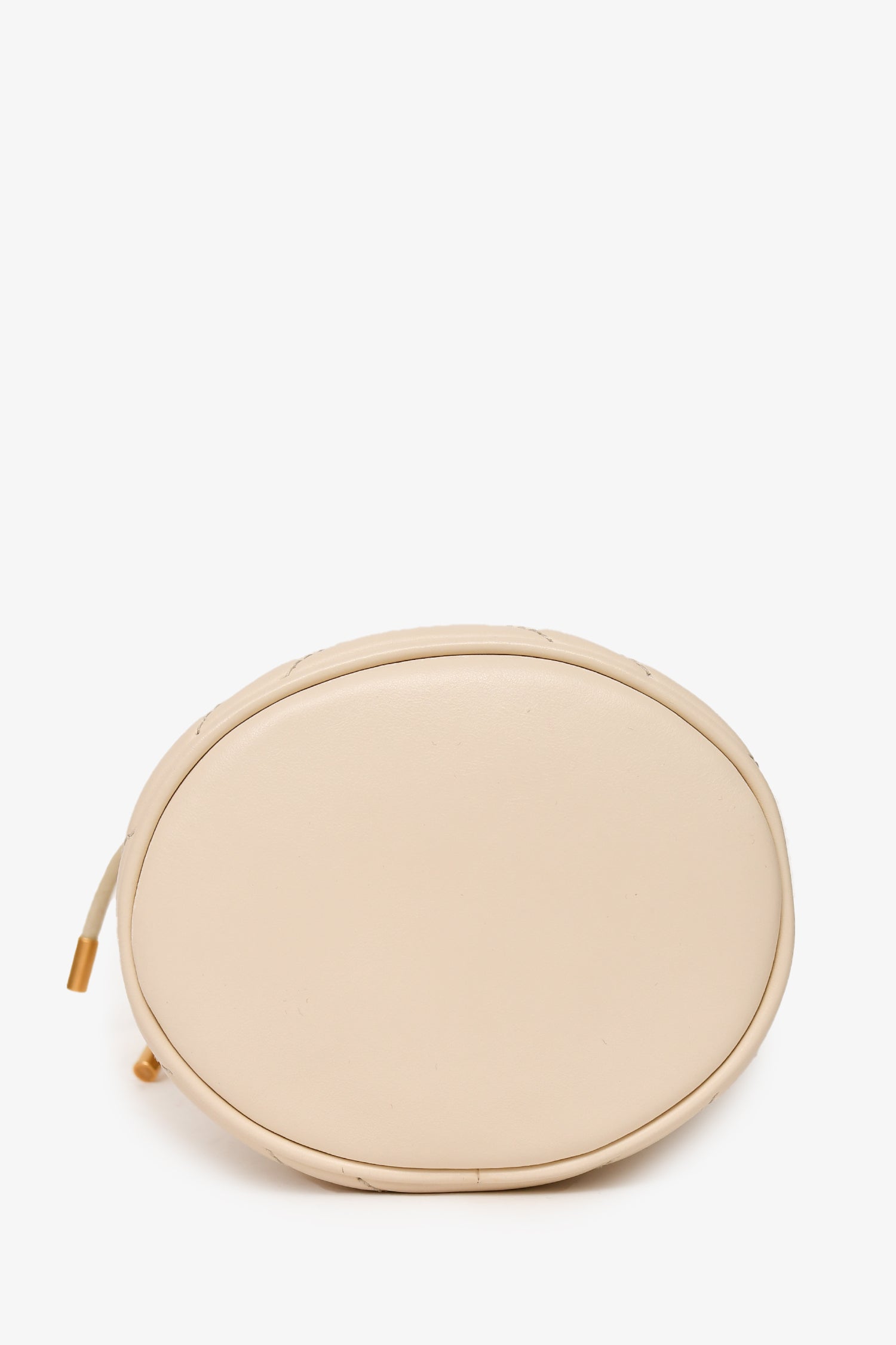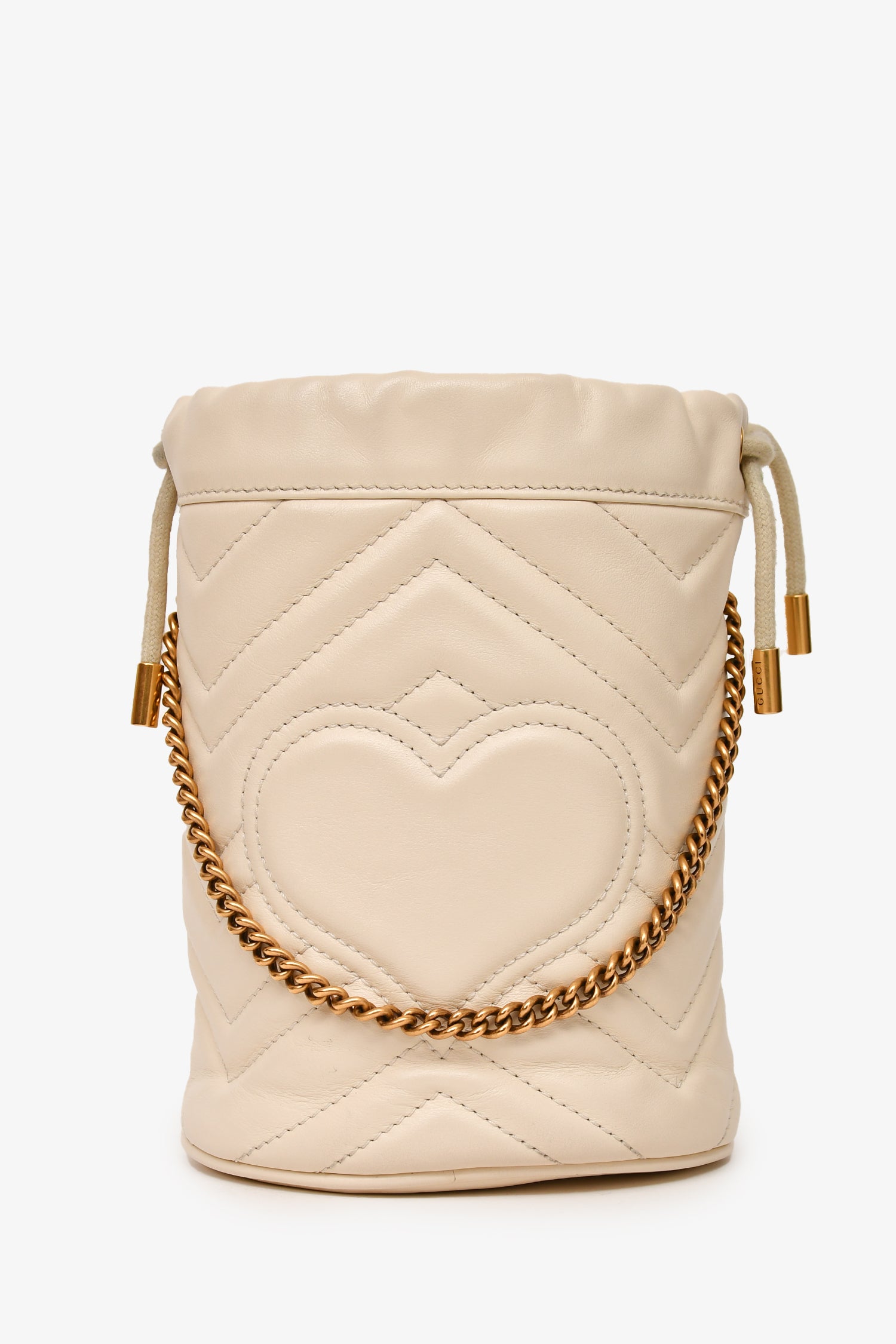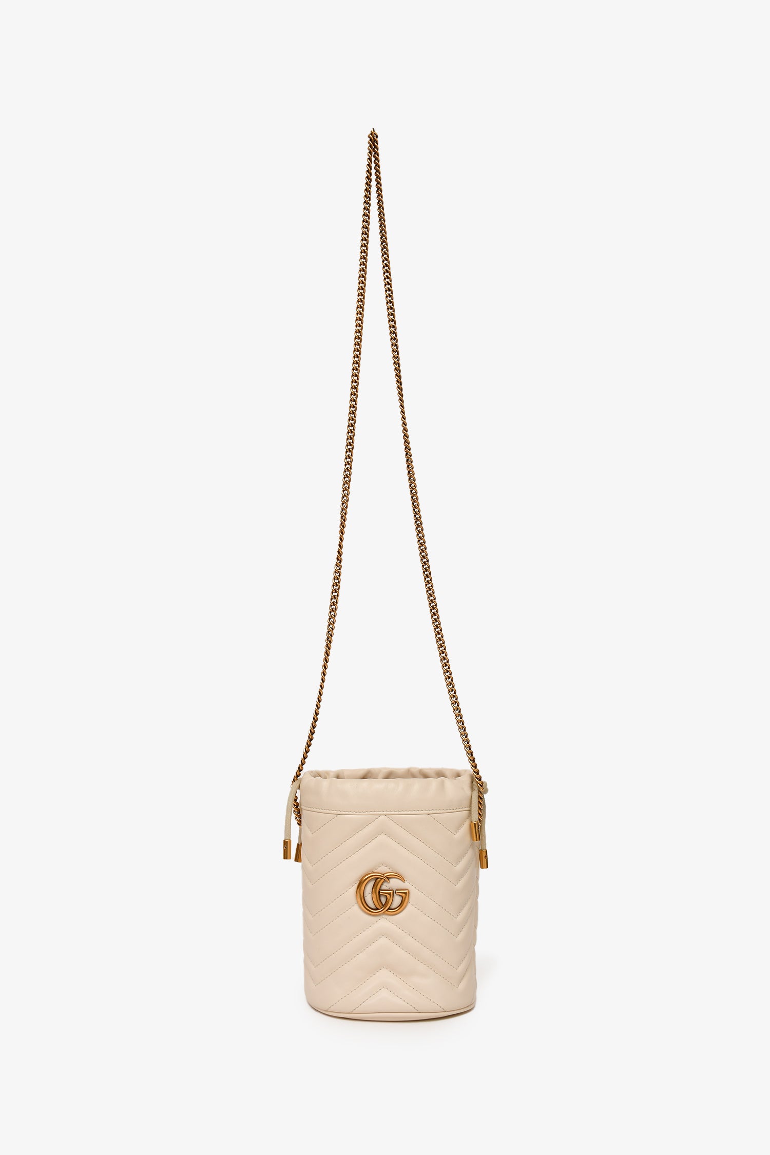 Refresh availabilityGucci White Leather Chevron Quilted Marmont Bucket Bag. Antiqued gold-tone hardware. Suede-lined interior with an interior card pocket. Chain-link strap. Drawstrings. Tonal stitching.