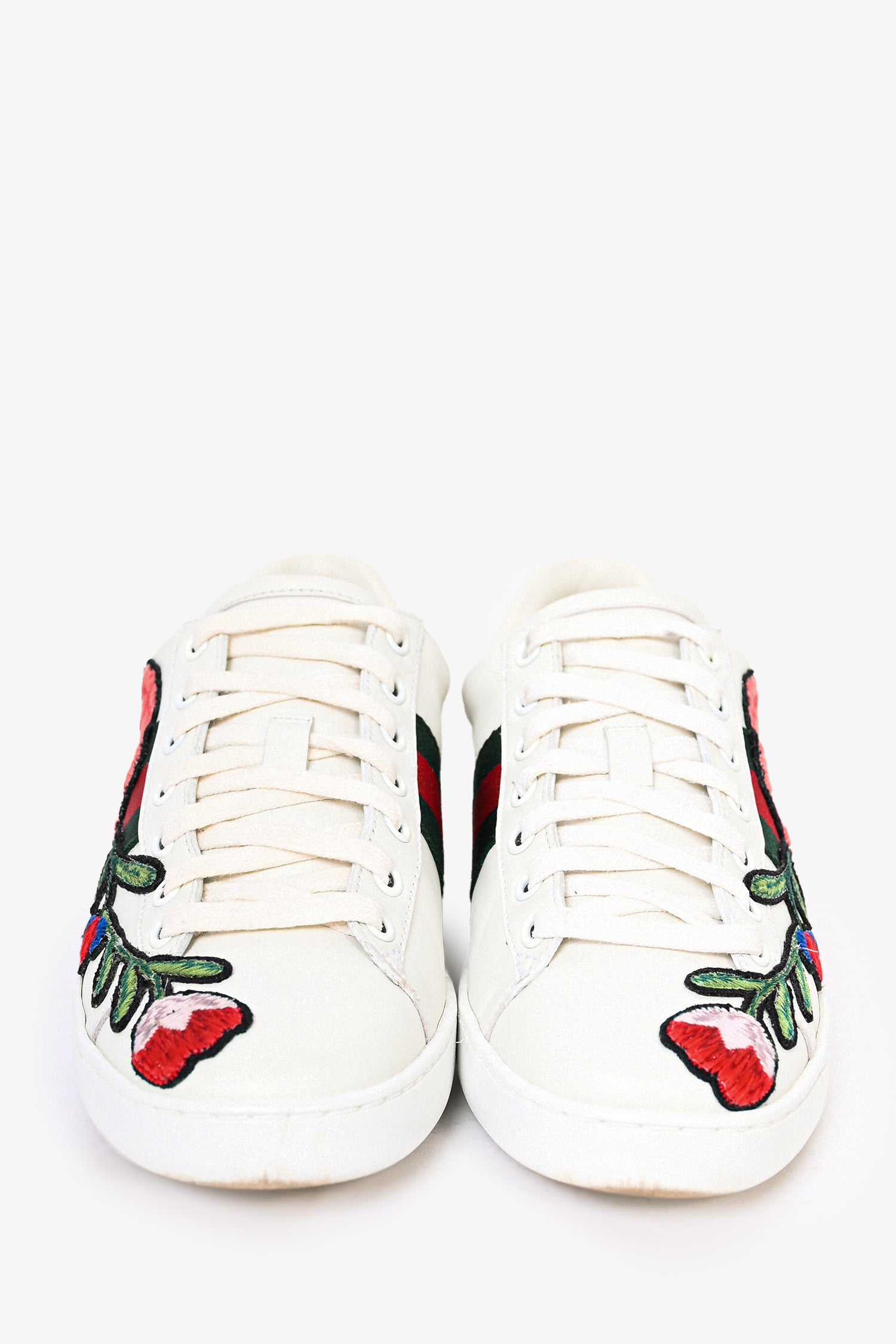 Refresh availabilityGucci White Leather Flower Embroidered Ace Sneakers. Round toe. Lace-up closure.