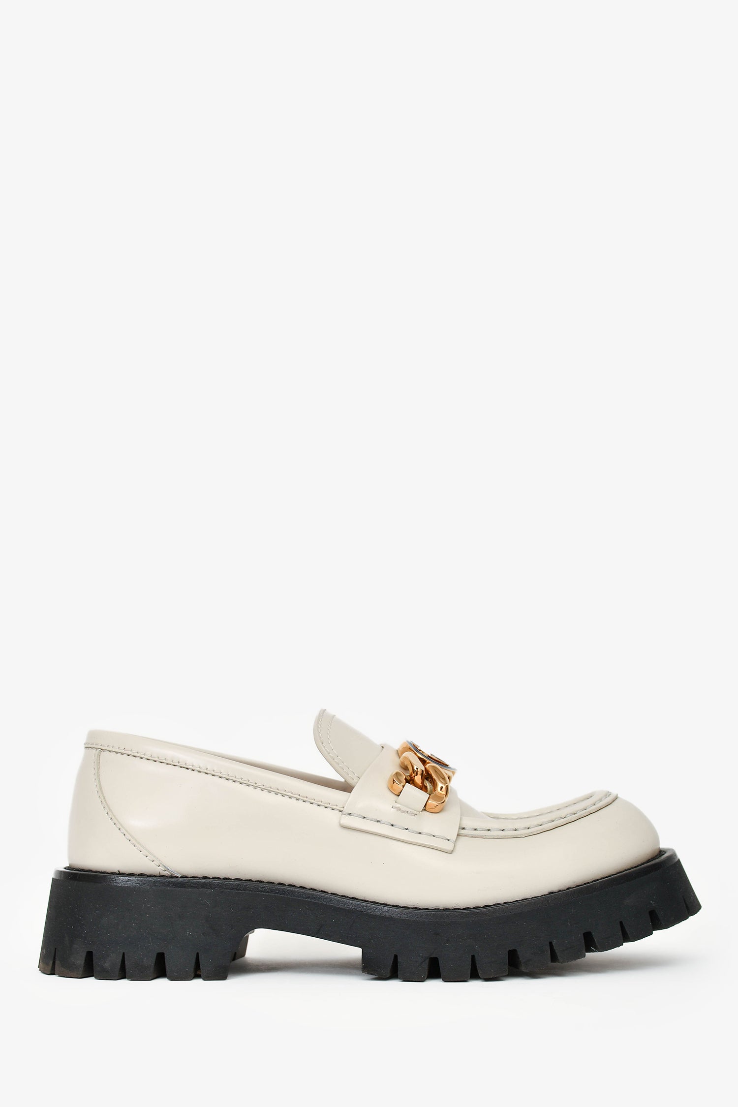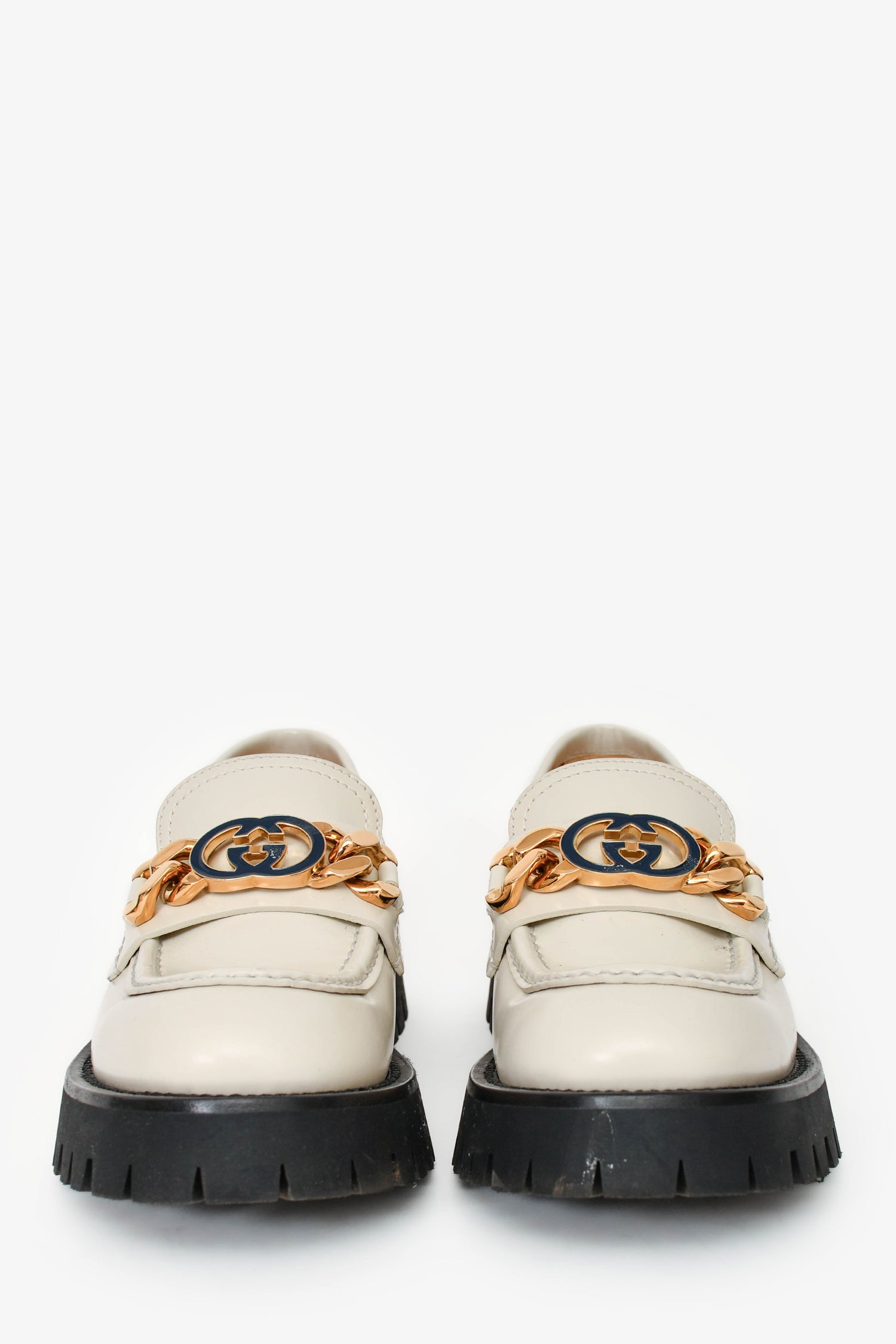 Refresh availabilityGucci White Leather GG Chain Embellished Platform Loafers. Gold-tone GG chain detail across vamp. Round toe. Chunky platform sole. Slip-on style. Tonal stitching.