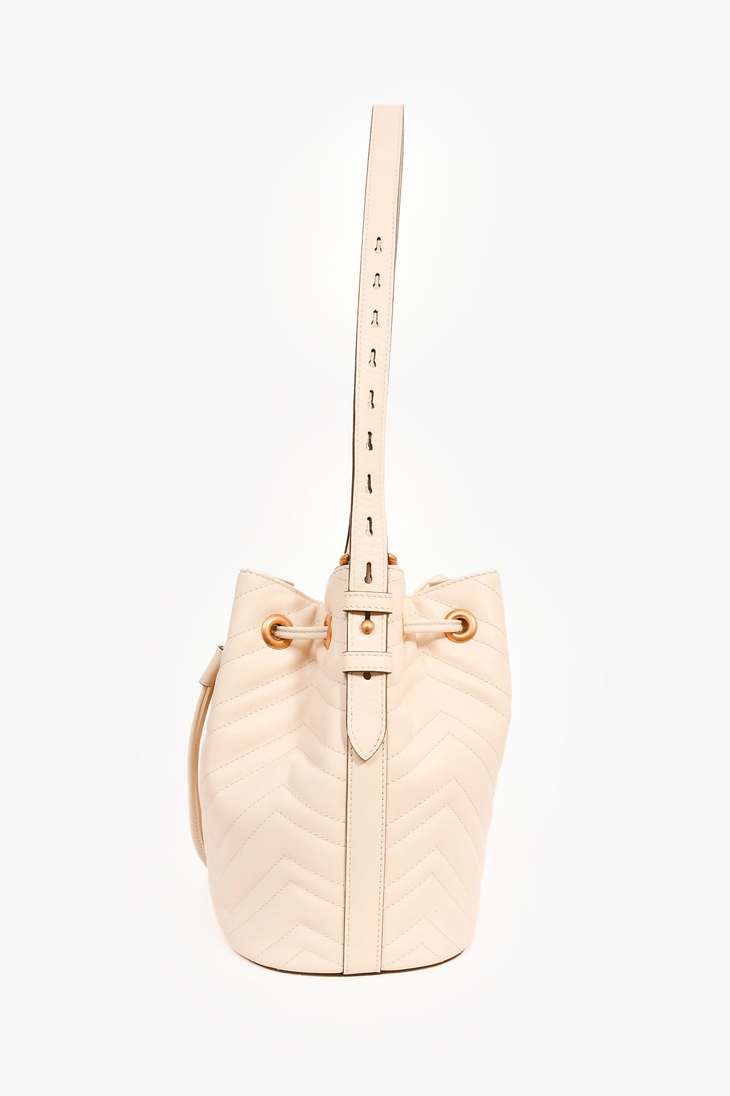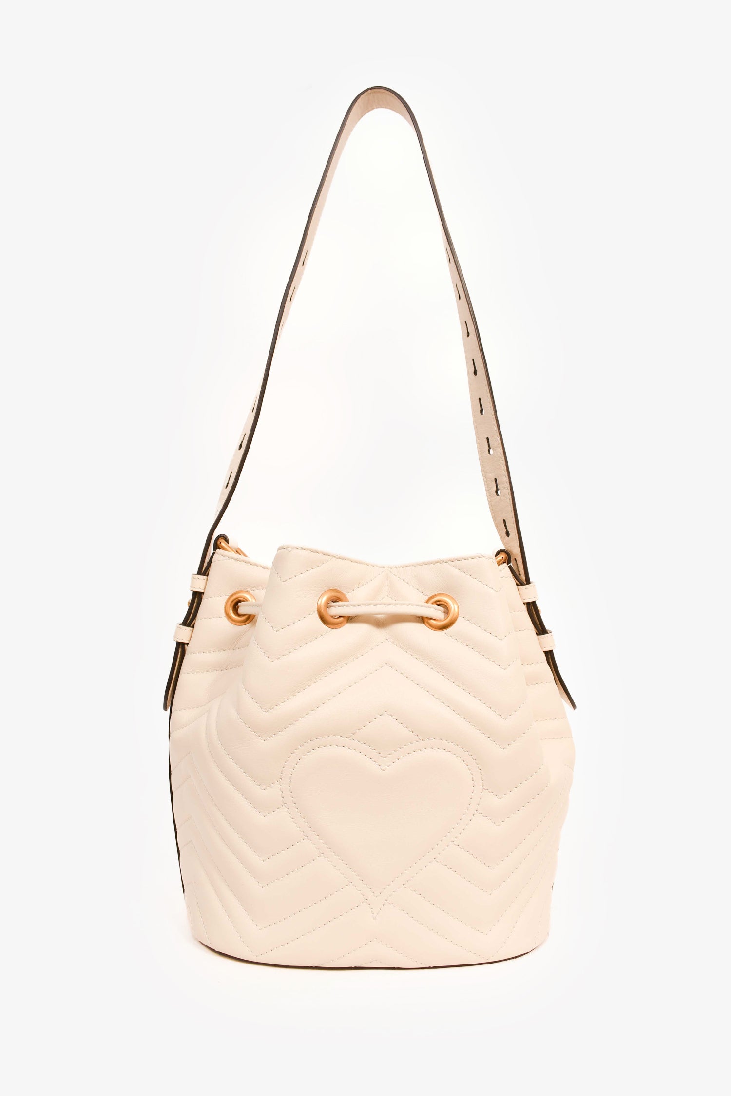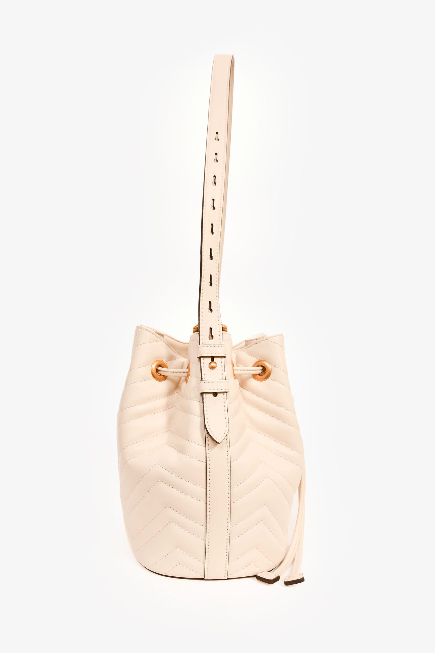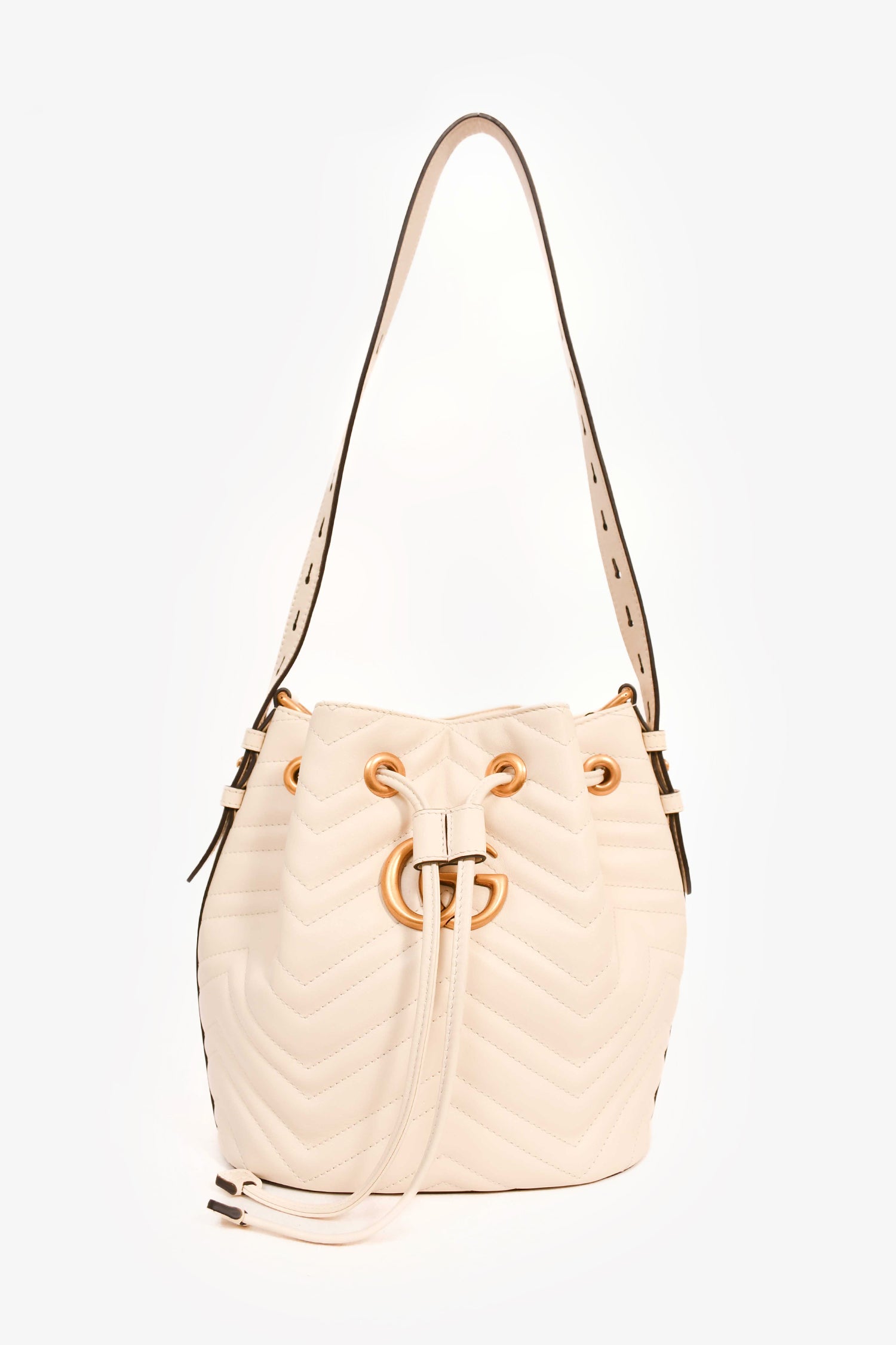Refresh availabilityGucci White Leather GG Marmont Medium Bucket Bag. Leather pull-tab closure. Adjustable shoulder and attachable webbed straps. Suede-lined interior with 2 slip compartments. Coated trim. Gold-tone hardware. Tonal stitching.