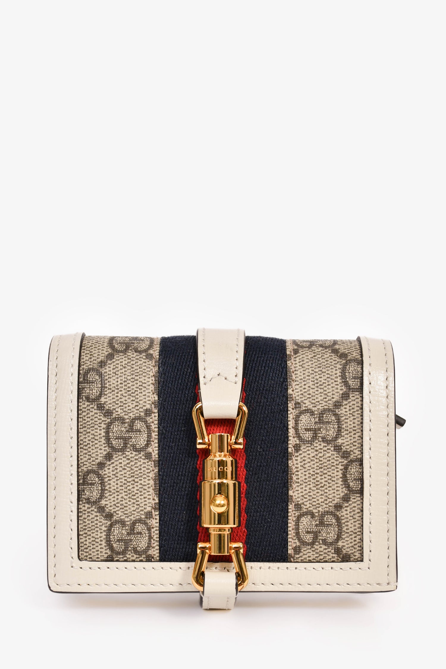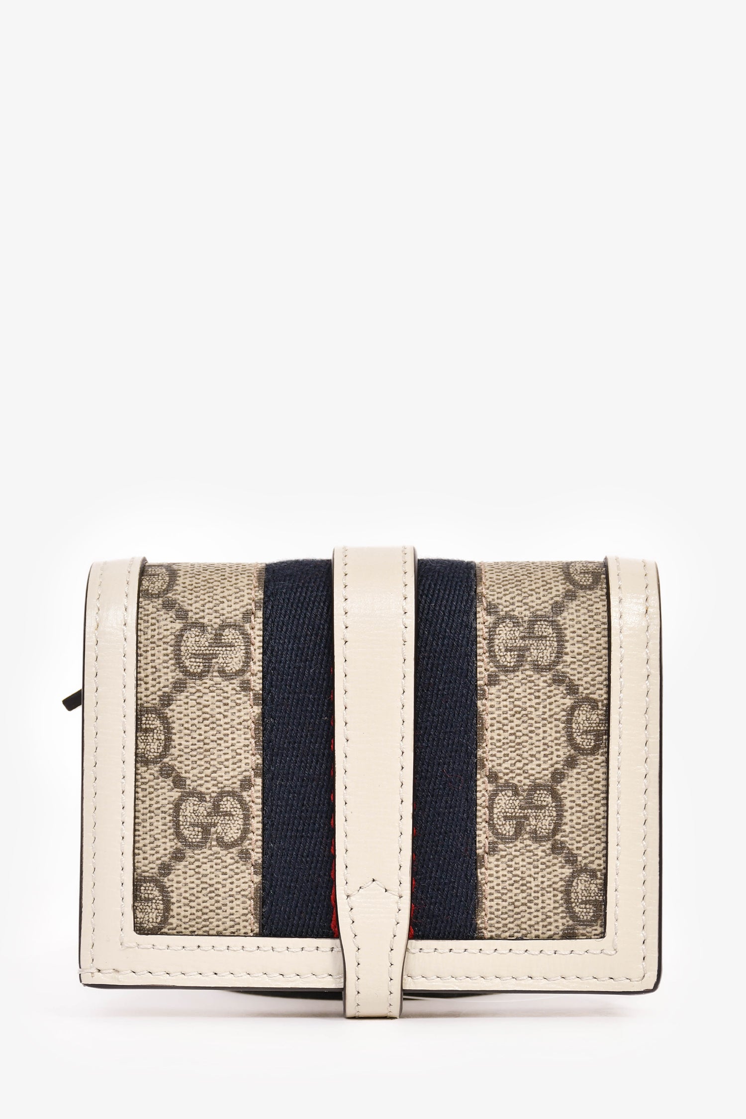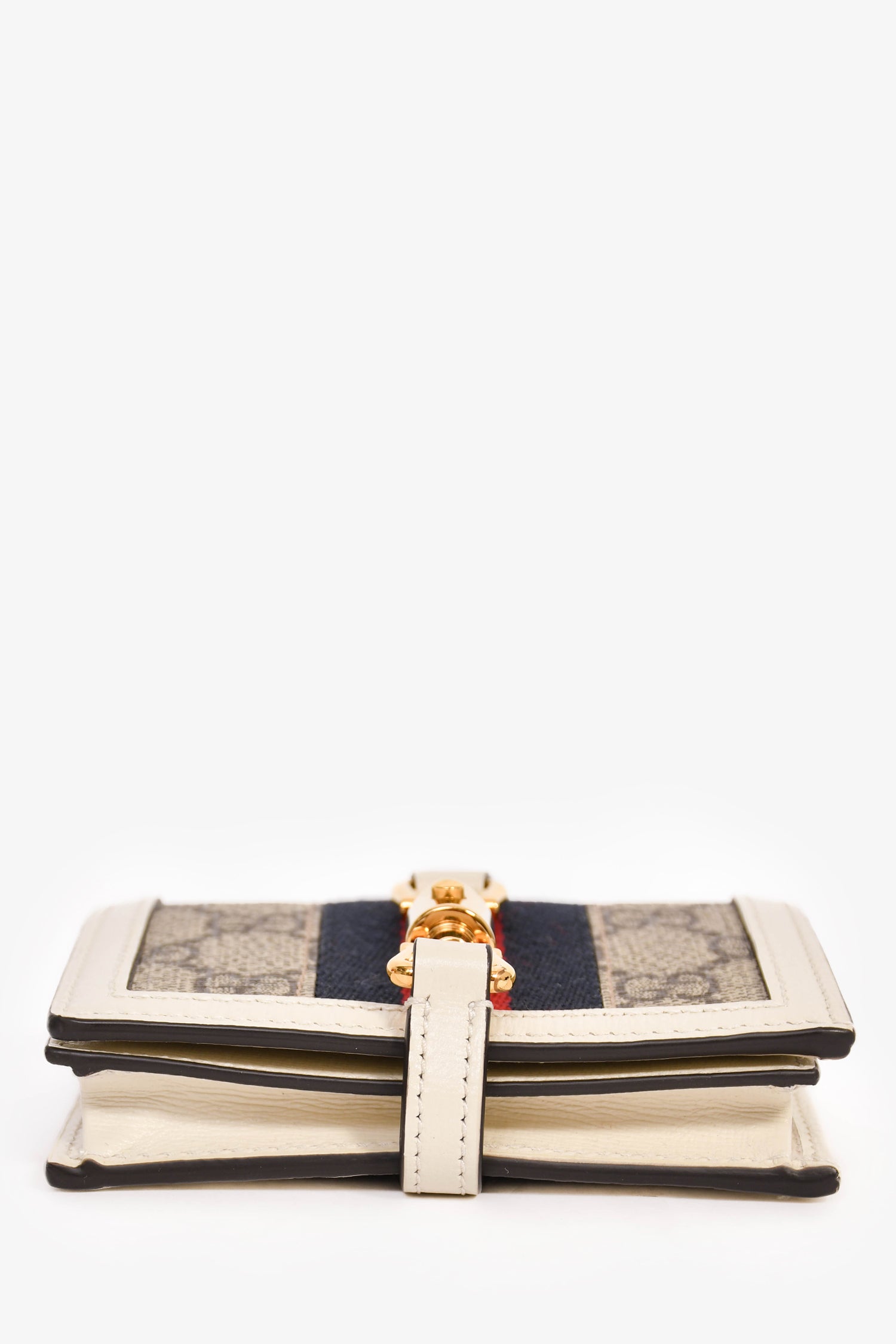 Refresh availabilityGucci White Leather GG Supreme Jackie 1961 Compact Wallet. Bi-fold opening with push-lock closure. 6 interior card slots, 1 bill compartment and 1 zip coin pocket. Grosgrain strip. Gold-tone hardware. Tonal stitching.