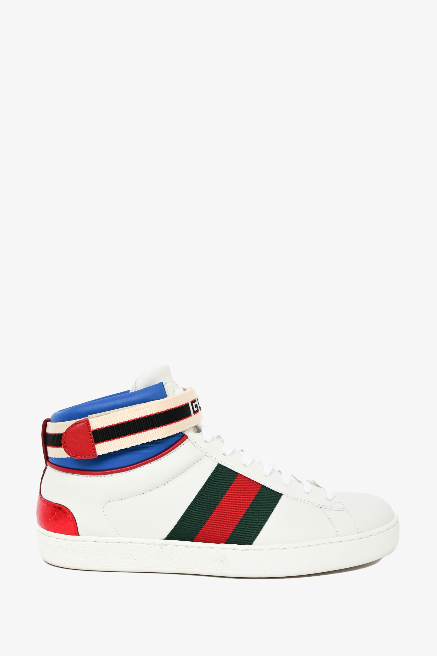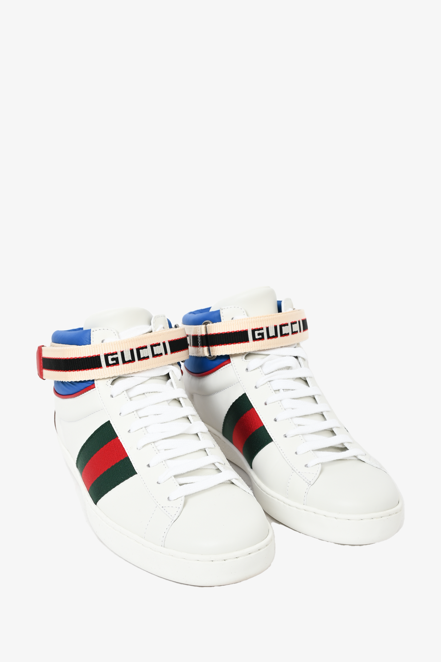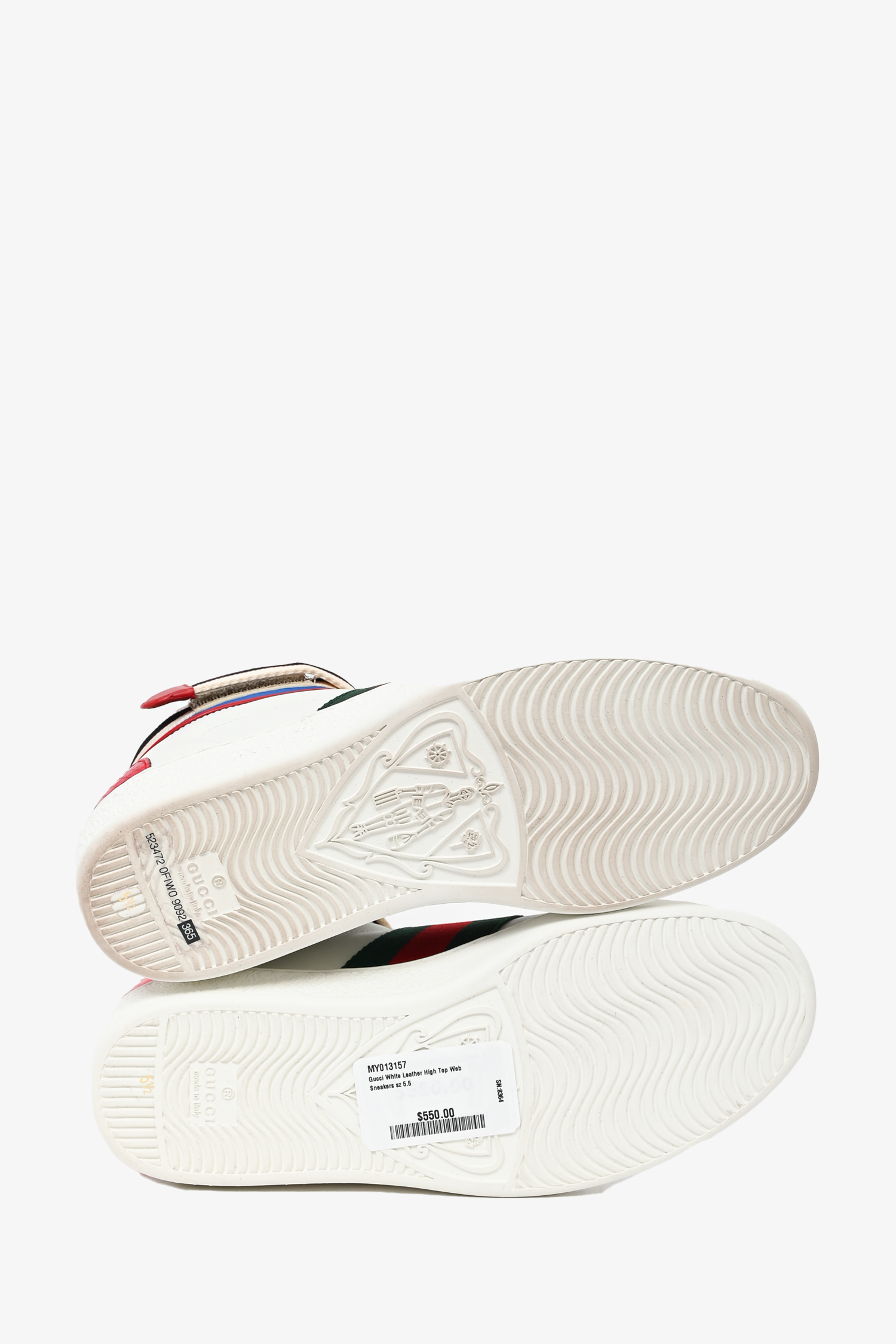 Refresh availabilityGucci White Leather High Top Web Sneakers. Lace-up. Velcro ankle strap. Round toe. Tonal stitching.