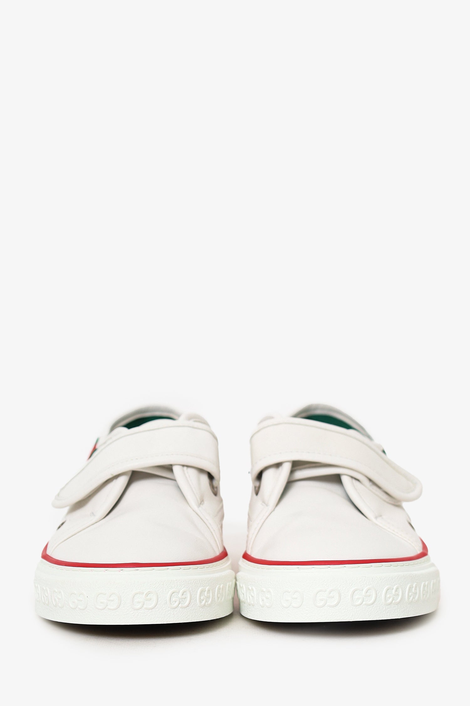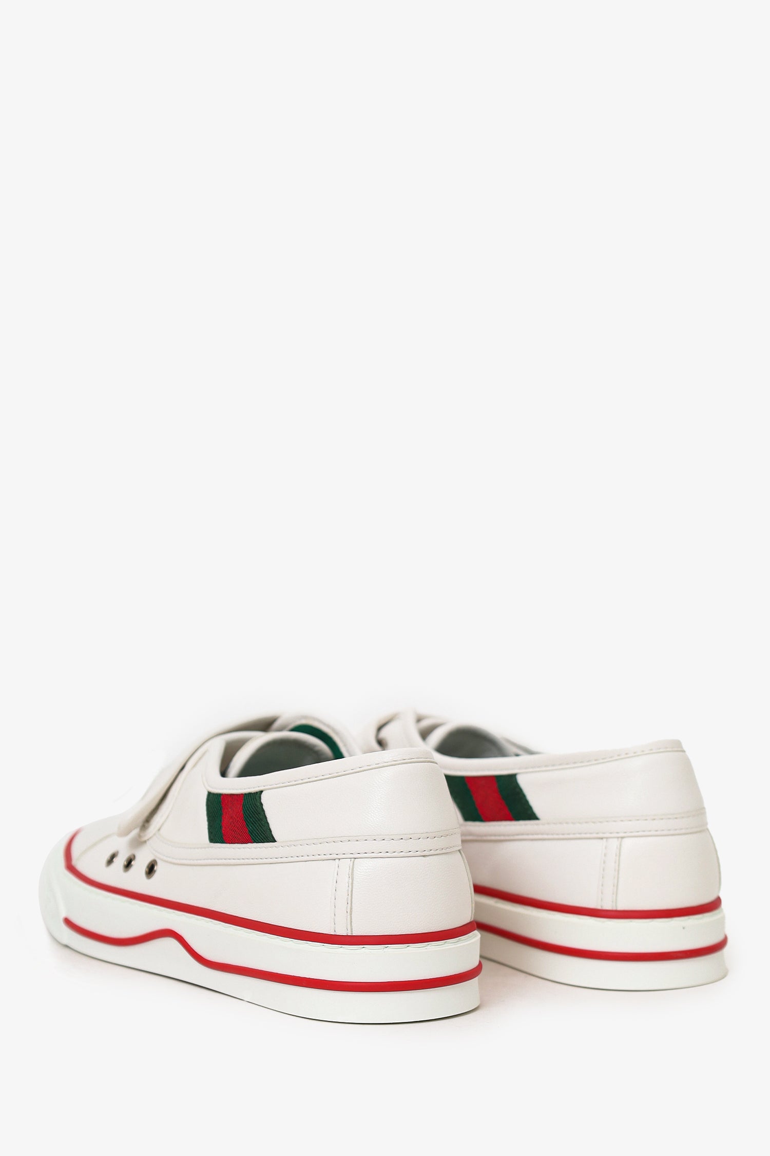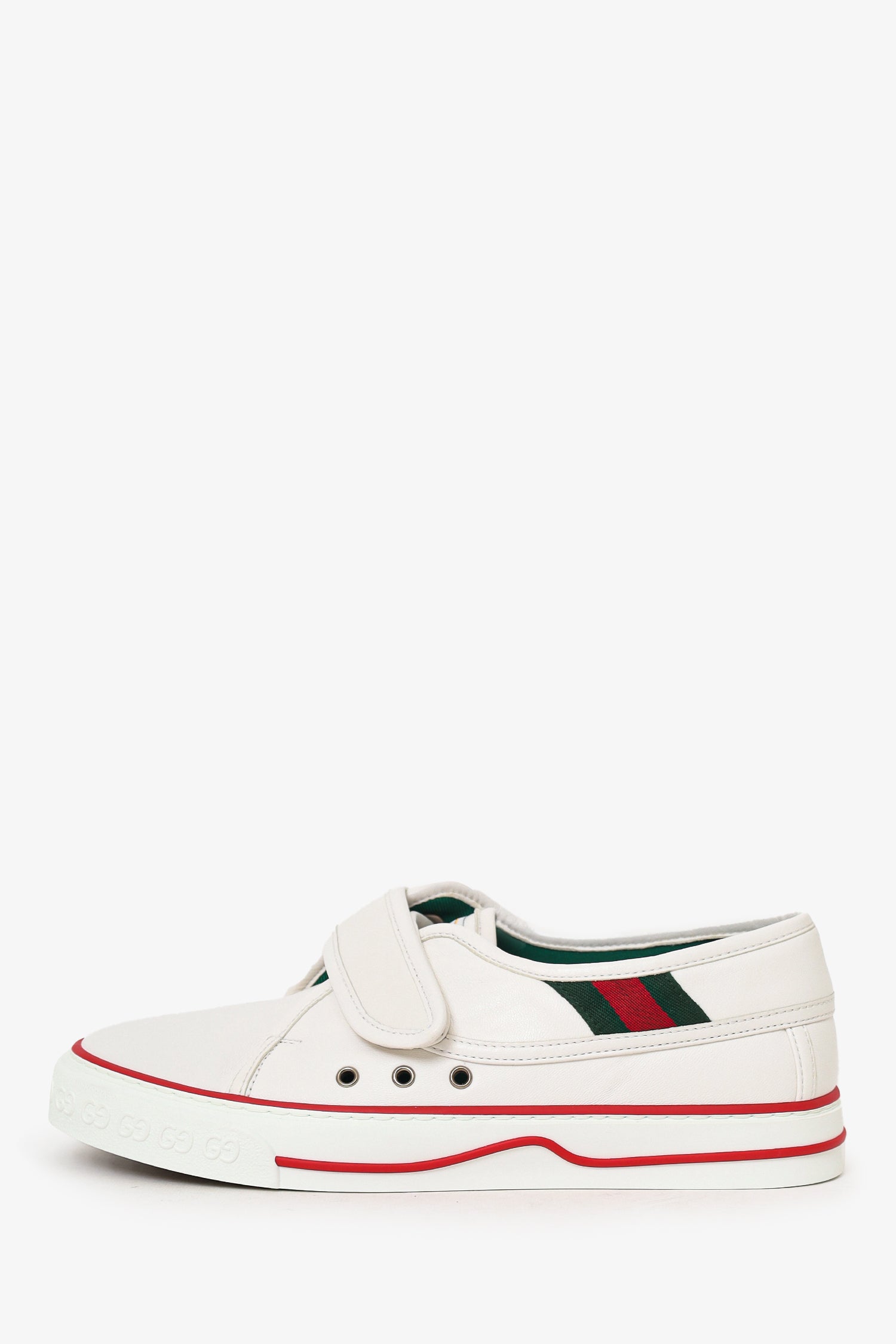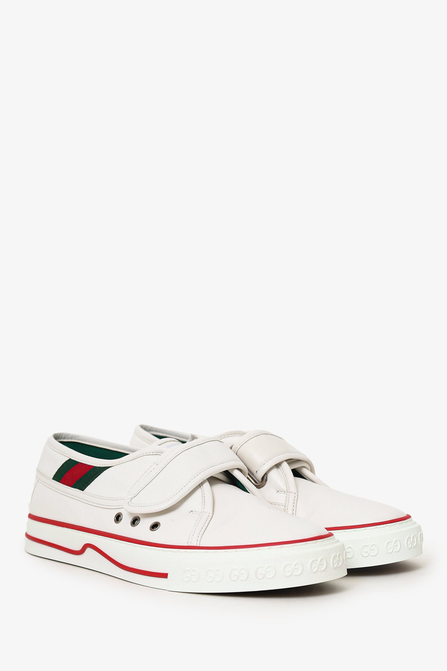 Refresh availabilityGucci White Leather Low Top Tennis Sneakers. Front velcro strap closure. Round toe. Tonal stitching. Silver-tone hardware.