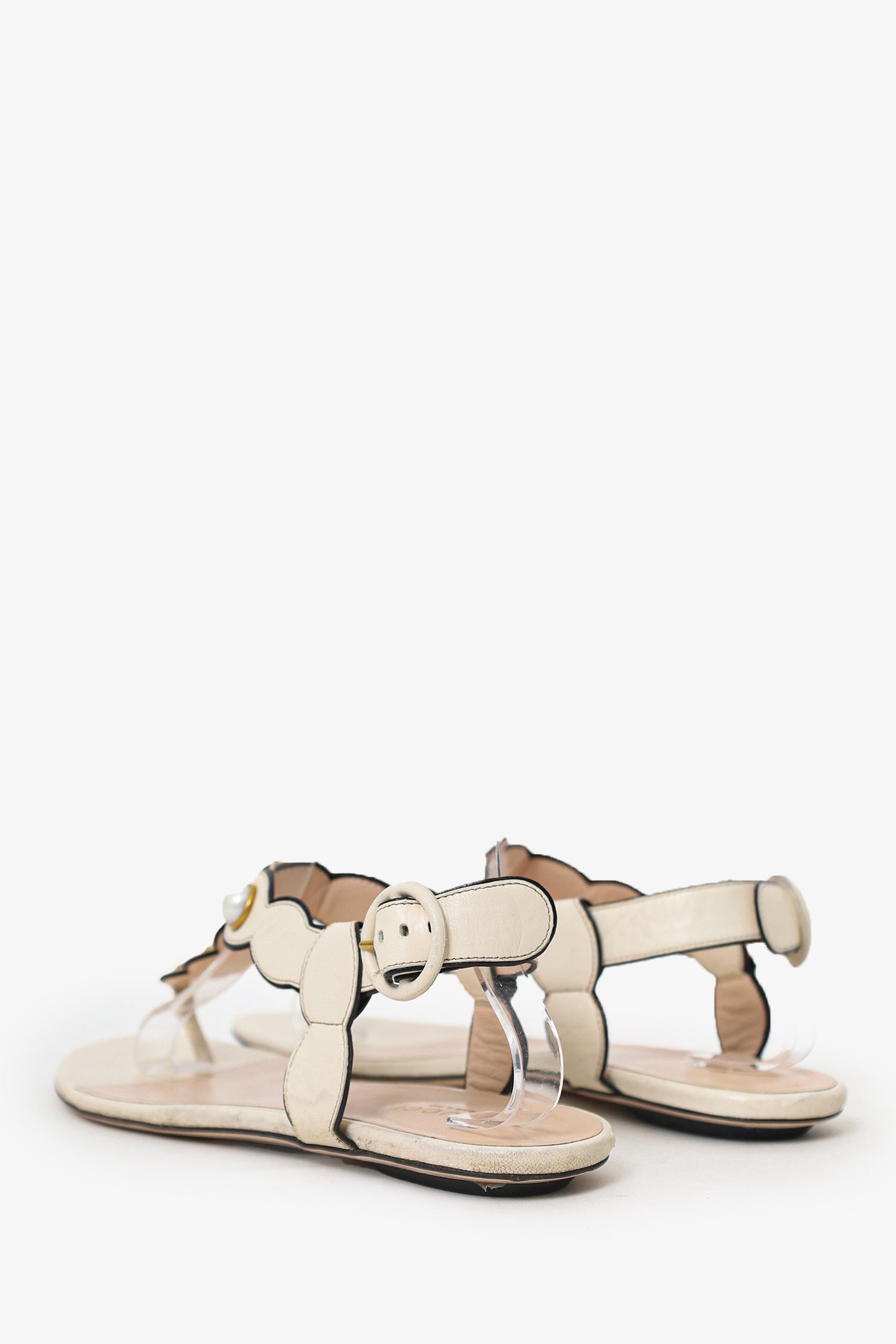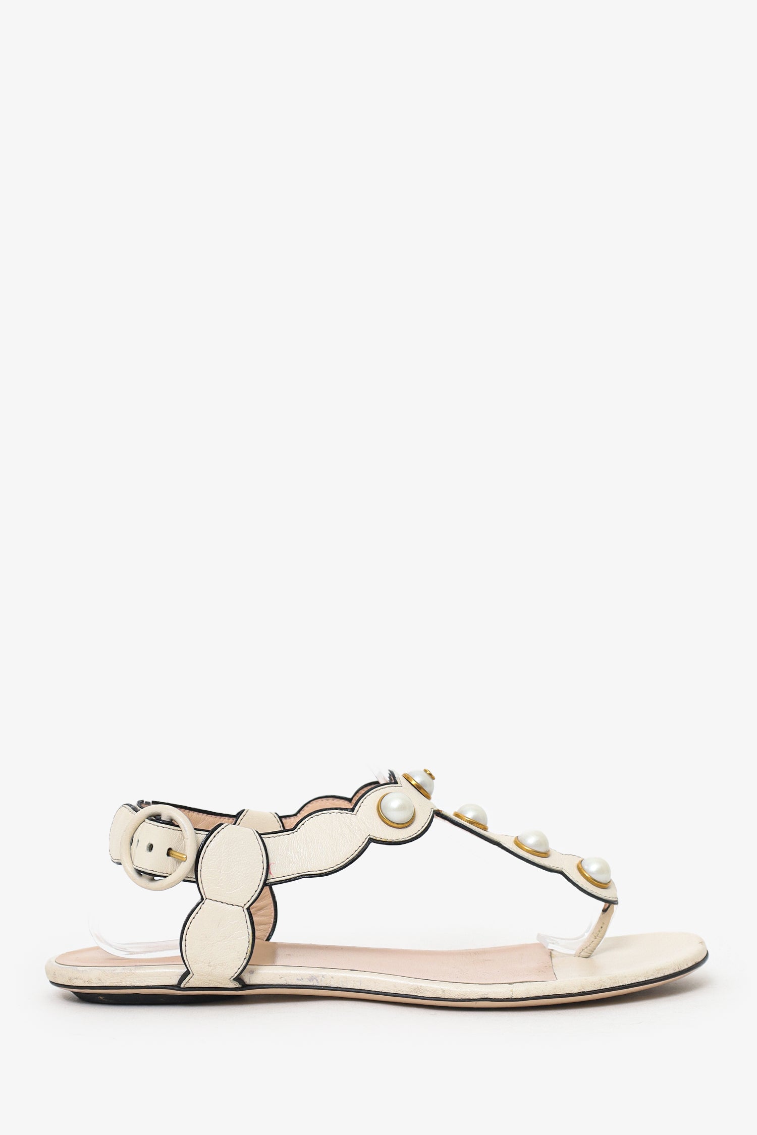 Refresh availabilityGucci White Leather Pearl Detail Sandals. Slip-on. Round-toe. Adjustable pull-through rear buckle closure. Gold-tone hardware. Tonal stitching.