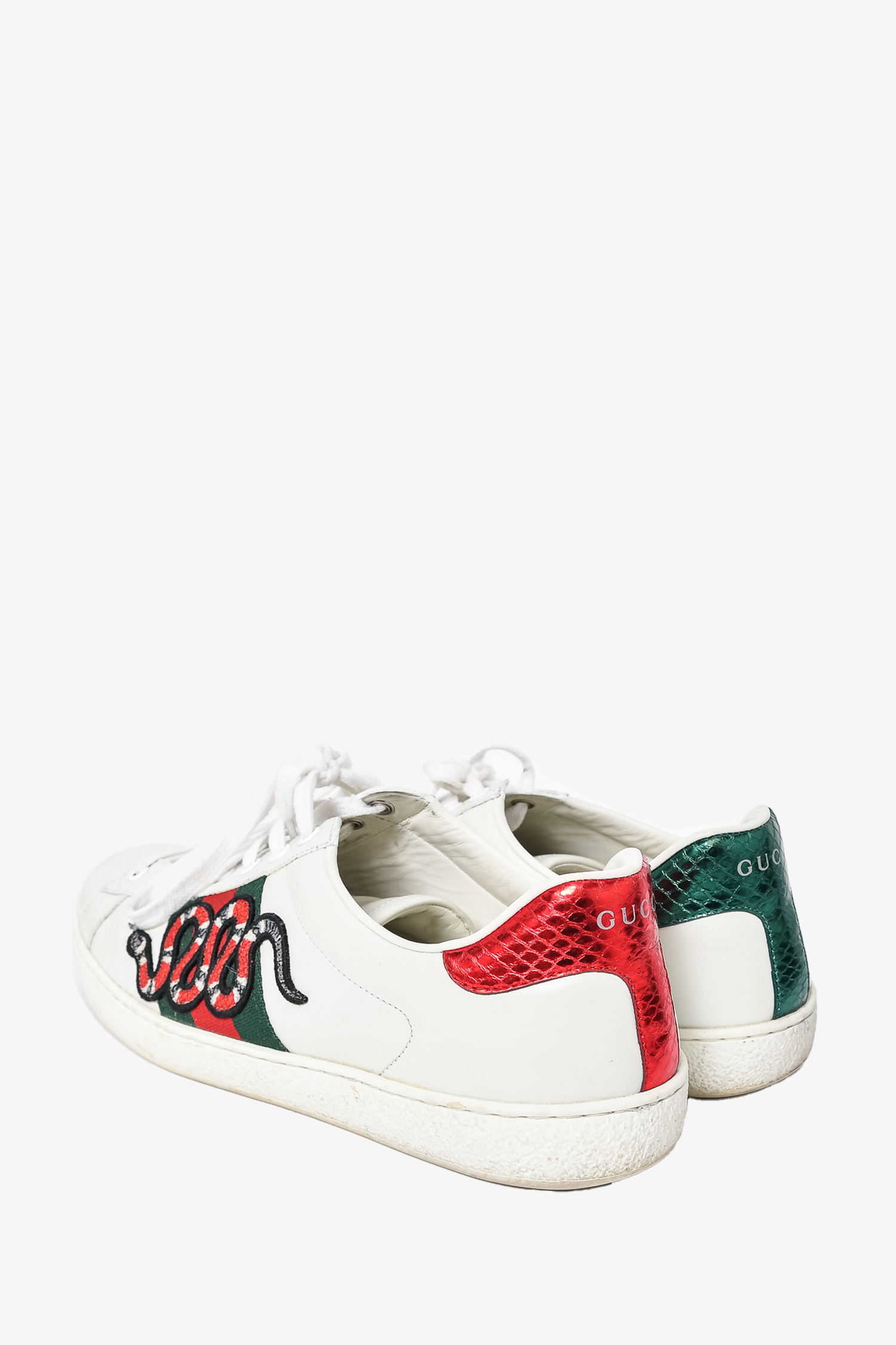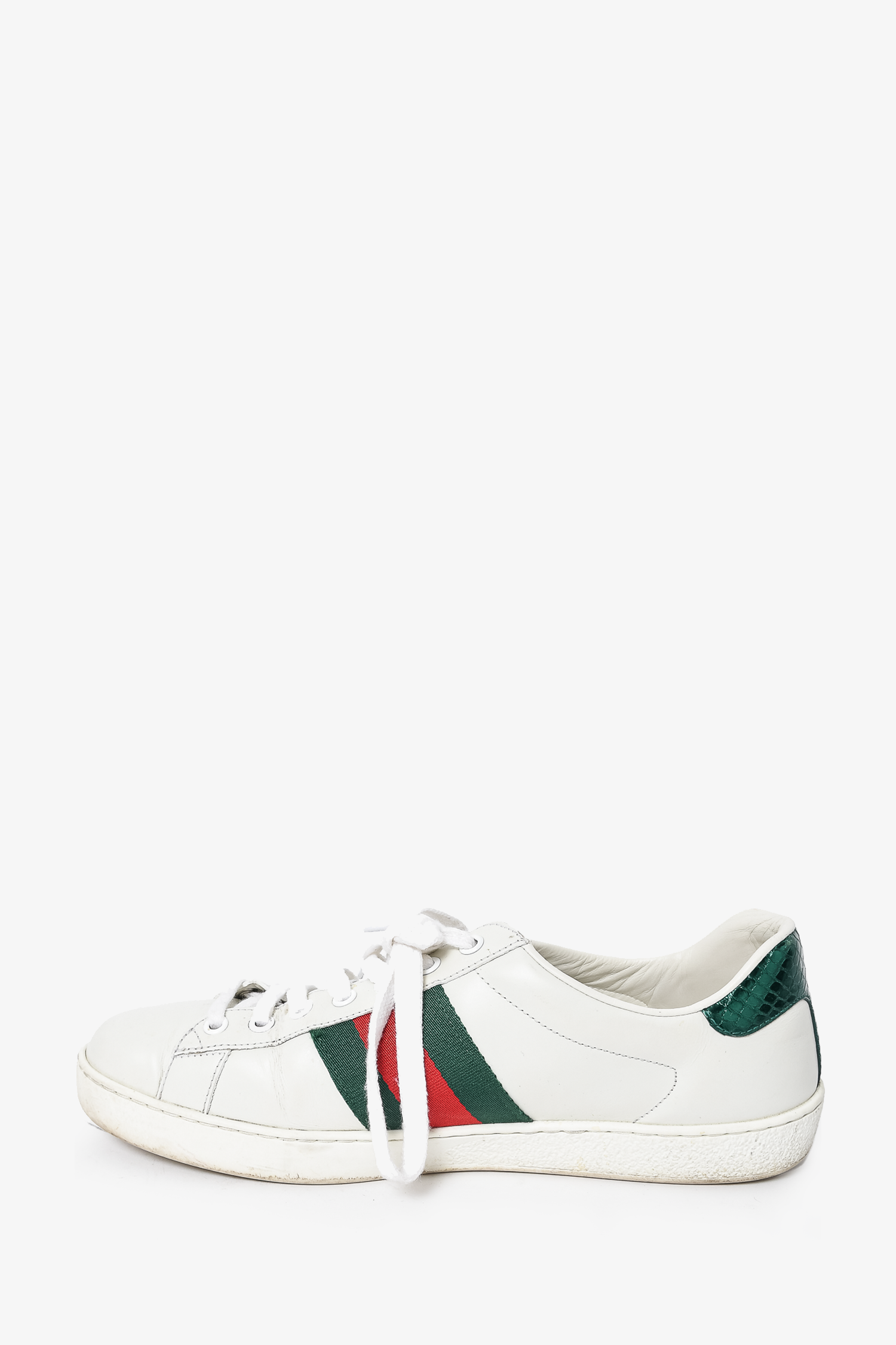Refresh availabilityGucci White Leather Web Ace Snake Embroidered Sneakers. Round toe. Lace-up closure. Tonal stitching.