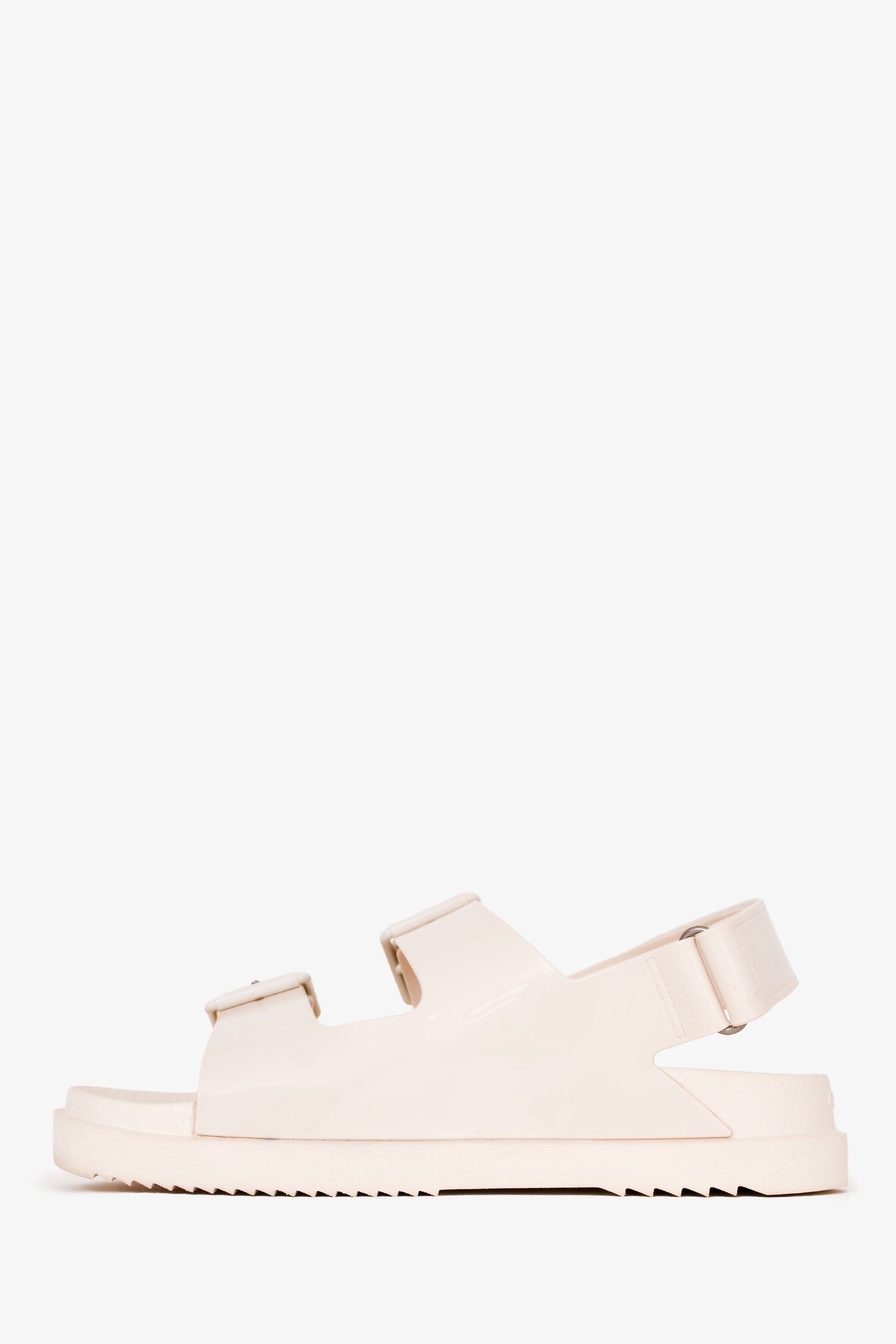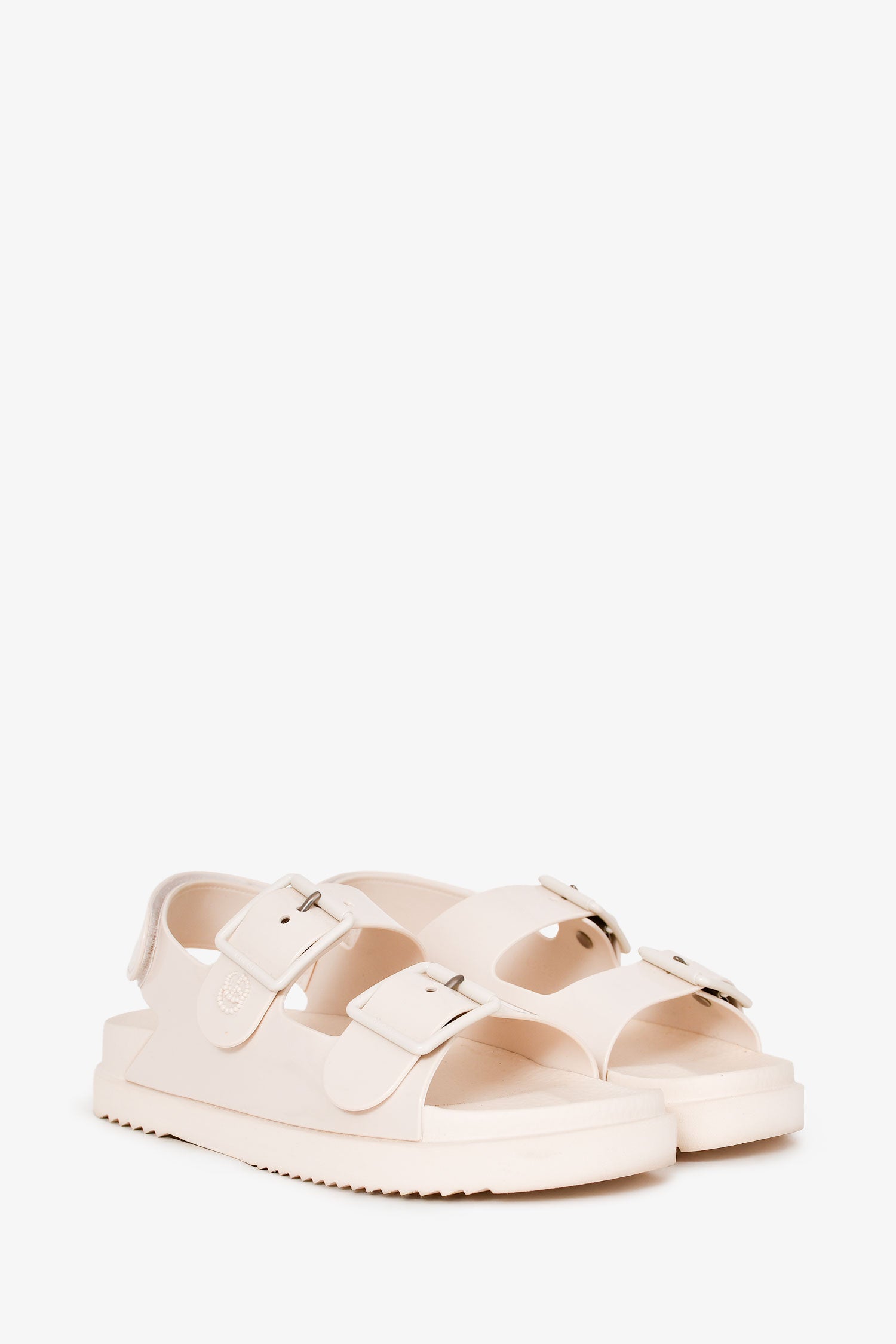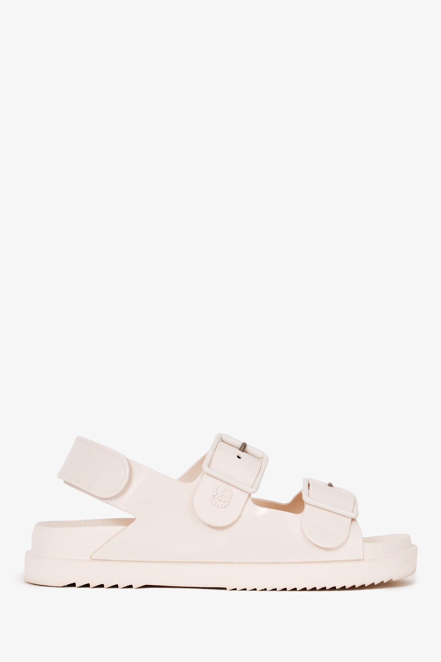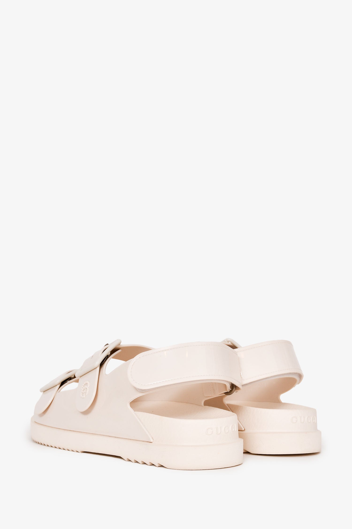 Refresh availabilityGucci White Rubber Mini Double GG Buckle Sandals. Features adjustable straps with buckle detail. Adjustable ankle strap with velcro closure. Open toe design. Tonal stitching.