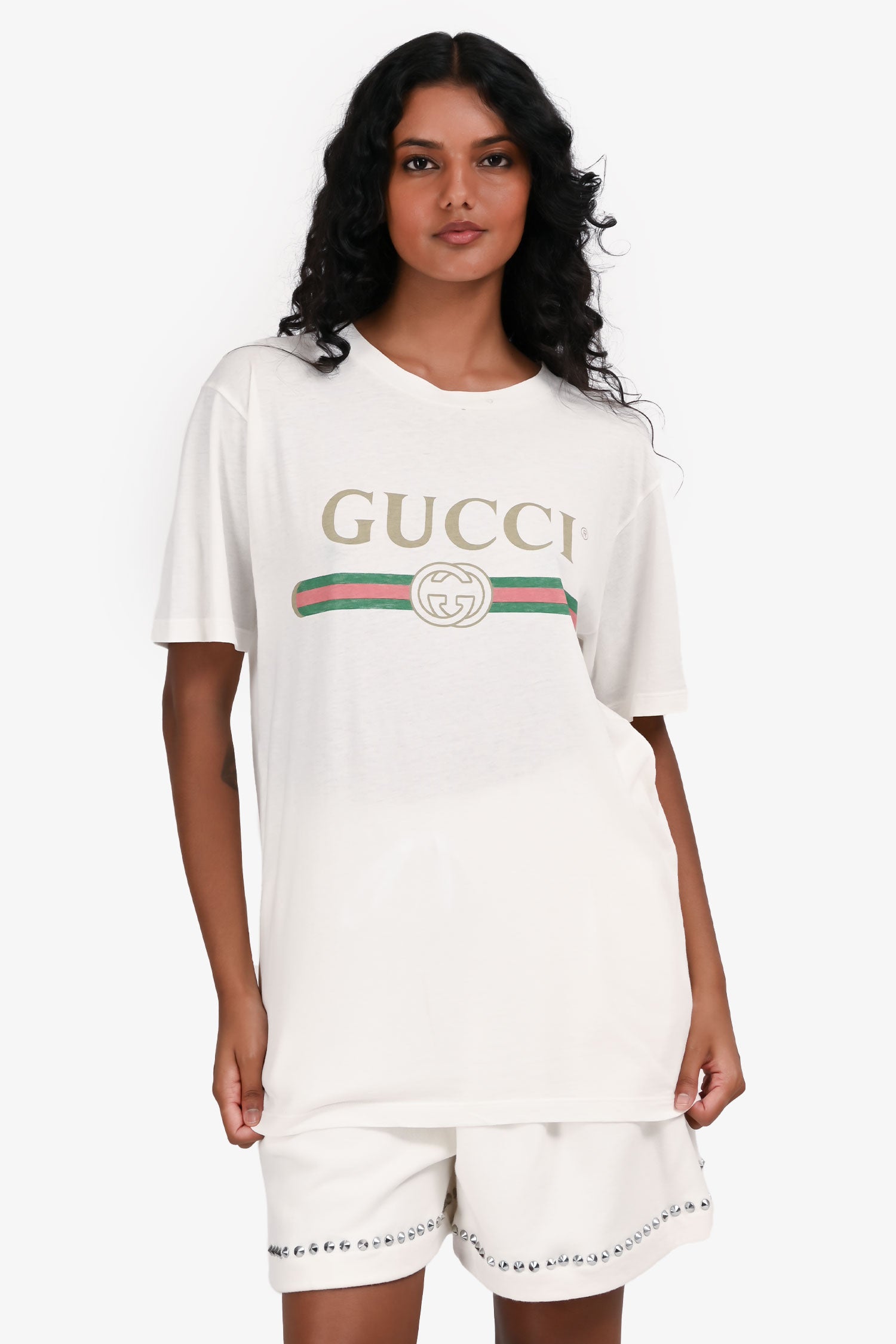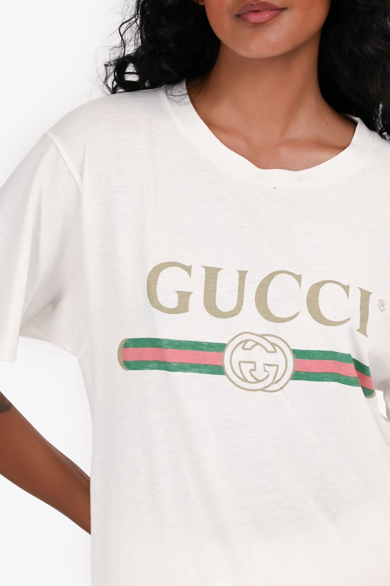 Refresh availabilityGucci White Thin Jersey Distressed Logo T-Shirt. Crew neckline. Short sleeves. Distressed detailing throughout. Pull-on style. Tonal stitching.