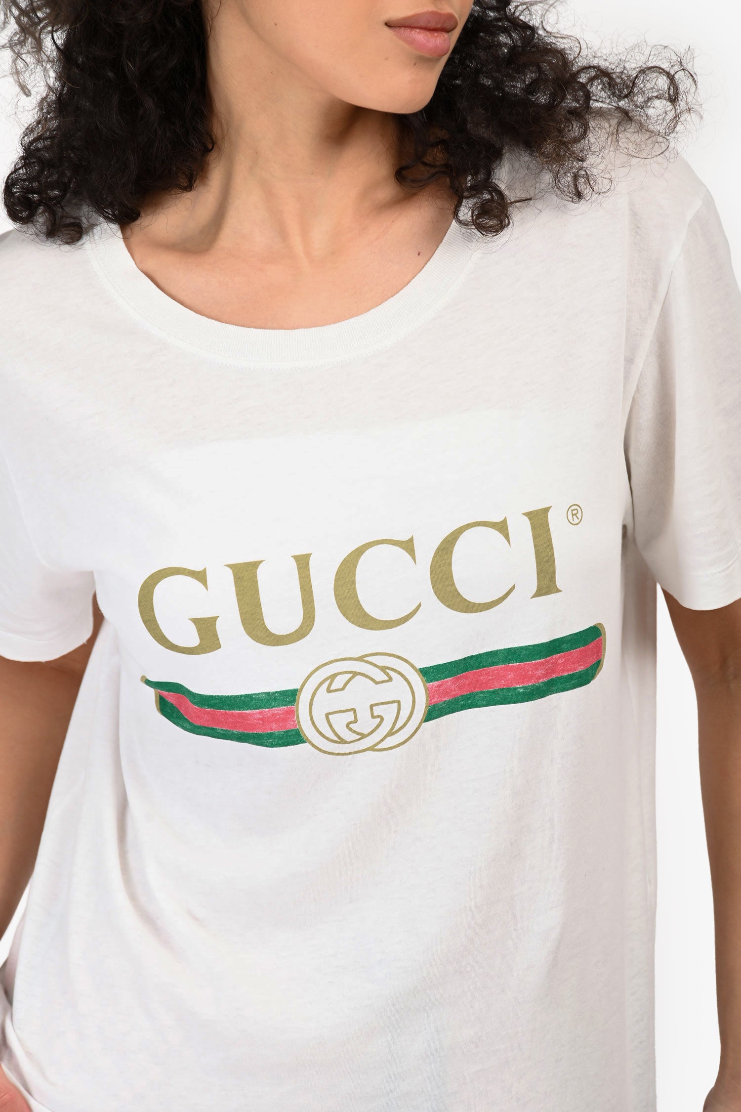 Refresh availabilityGucci White Thin Jersey Distressed Logo T-Shirt. Slip-on. Round neckline. Distressed details at the neckline, cuffs, and hem. Tonal stitching.