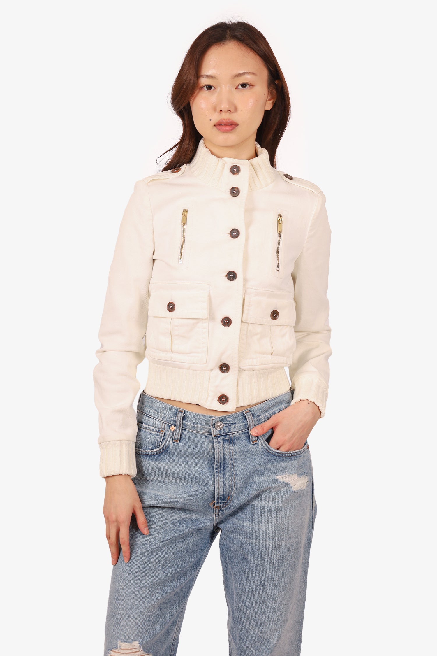 Refresh availabilityGucci White Twill Cropped Zip Details. Front zip closure. Front zip and button pockets. Lined. Elasticated hem. Tonal stitching.