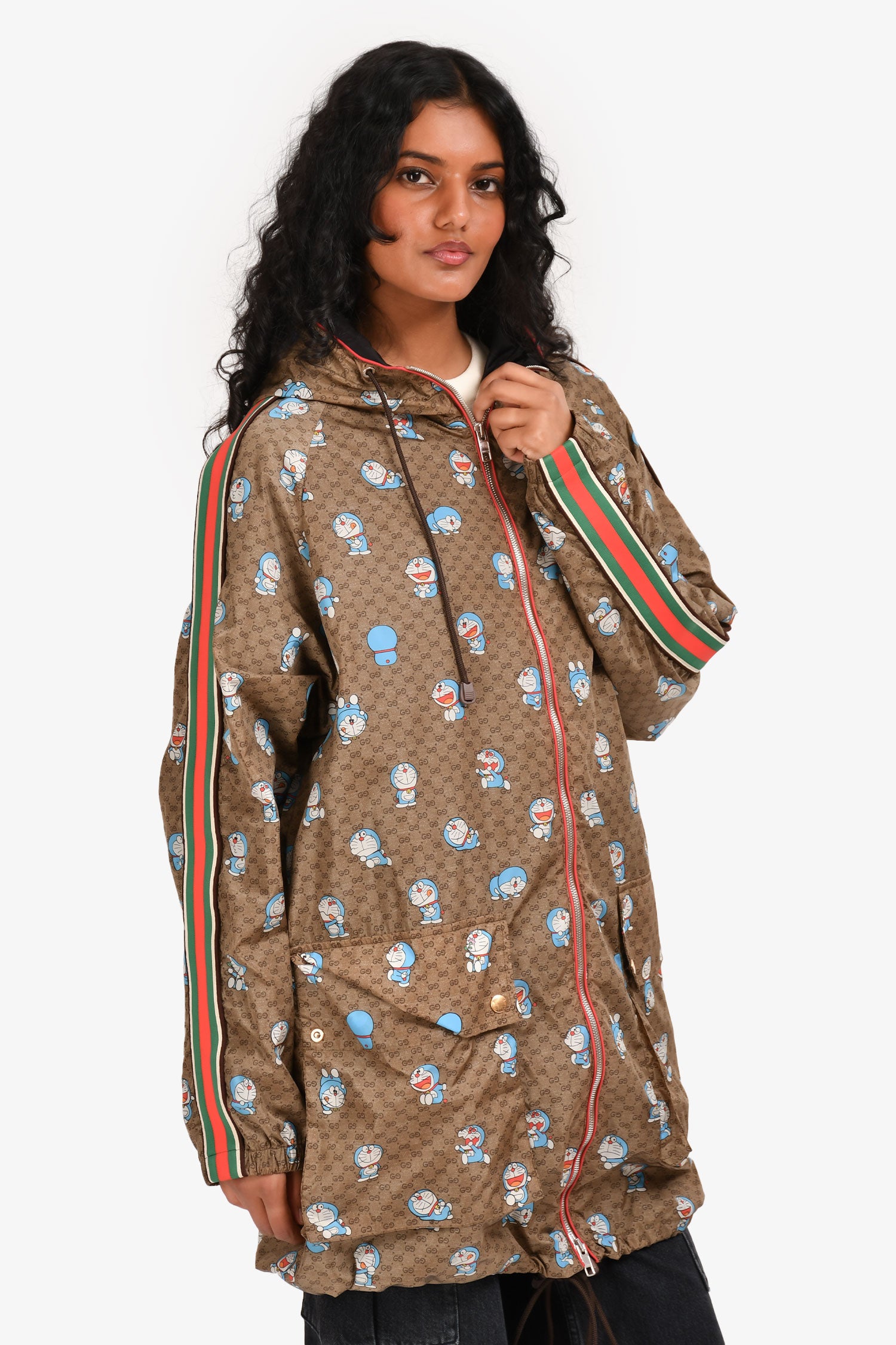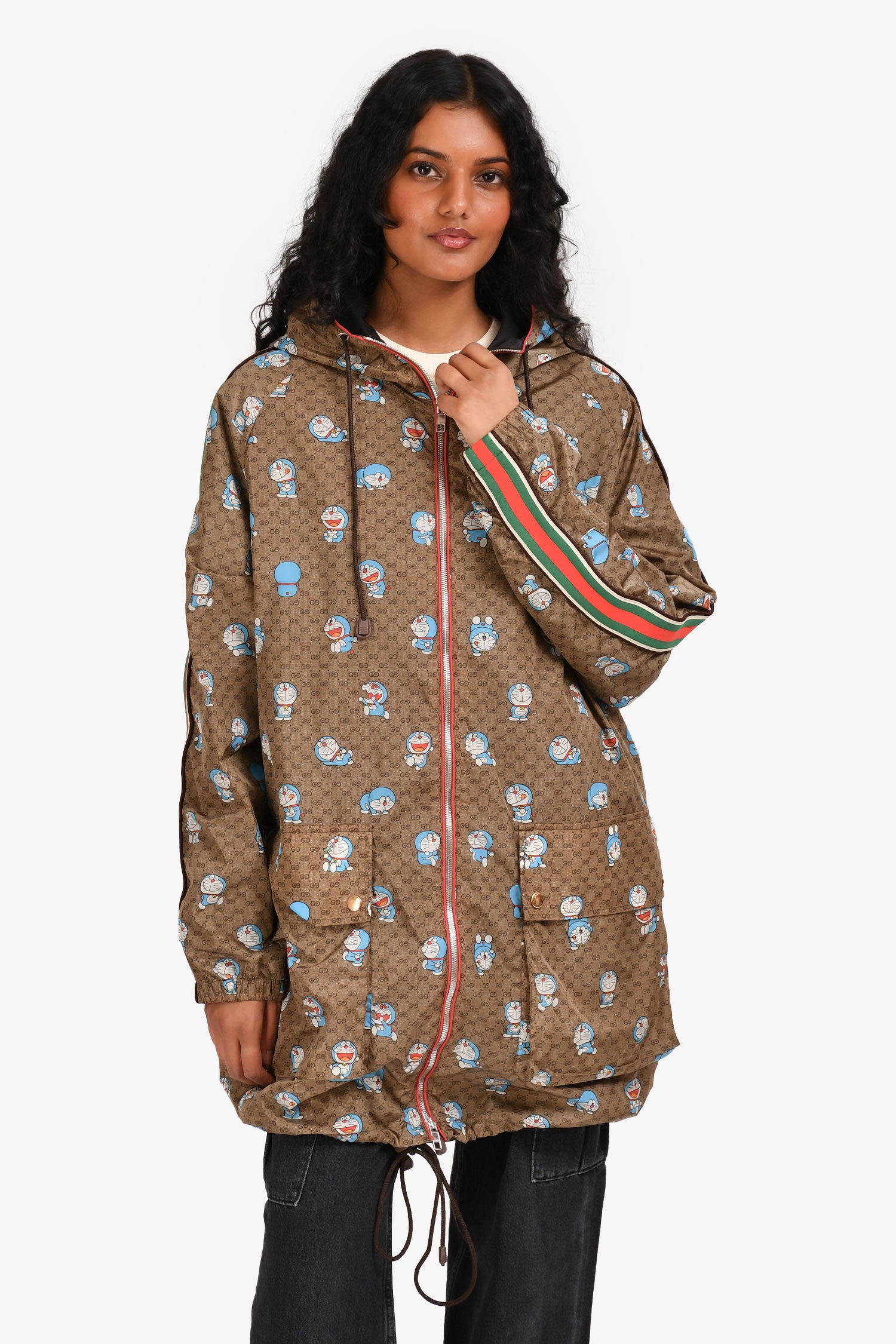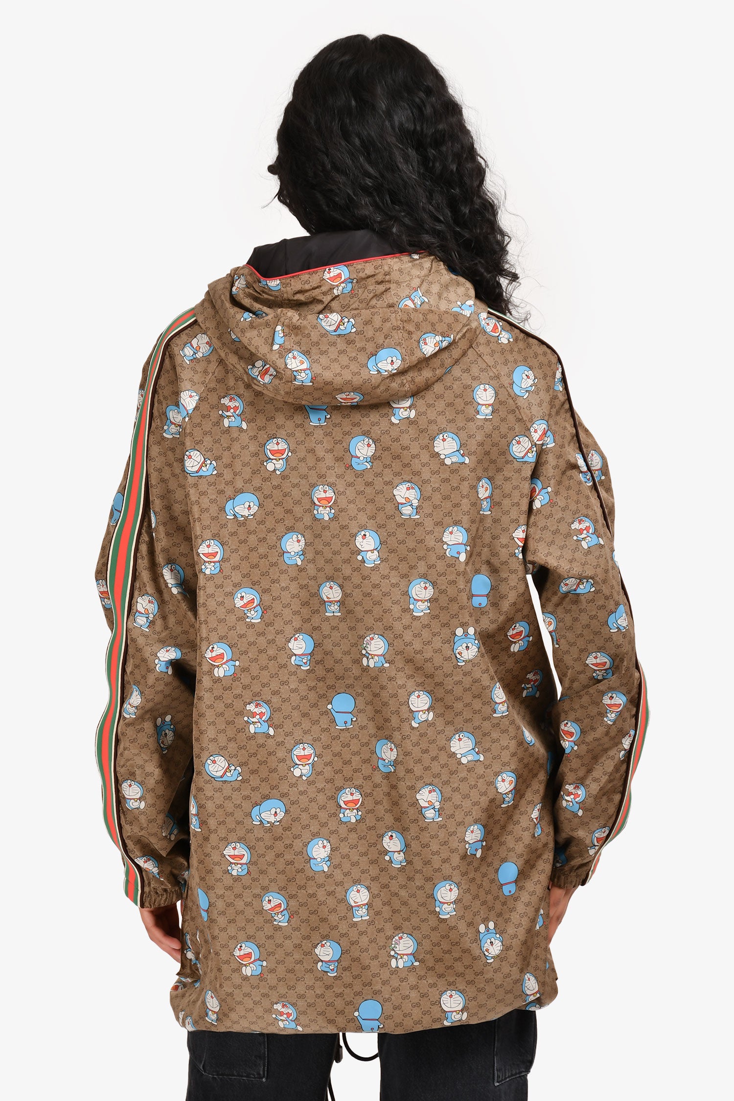 Refresh availabilityGucci x Doreamon Brown GG Supreme Zip Up Hooded Jacket. Front zip closure. Drawstring hood. Elasticized cuffs and hem. Front flap pockets with button closure. Tonal stitching.