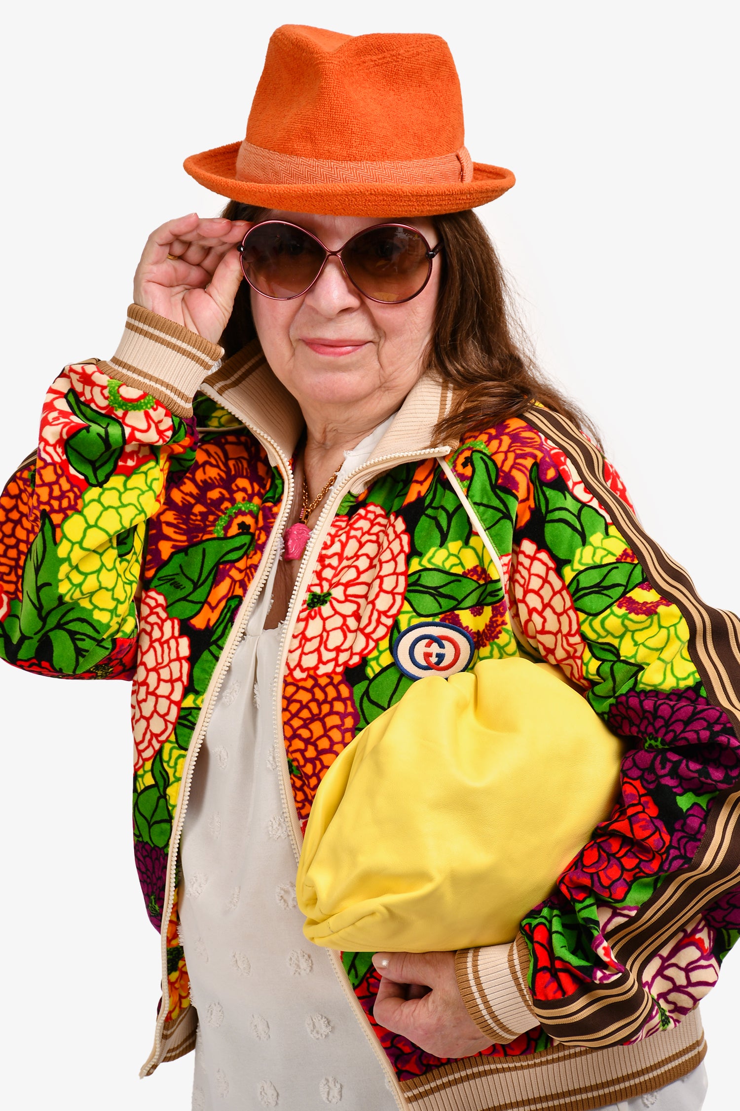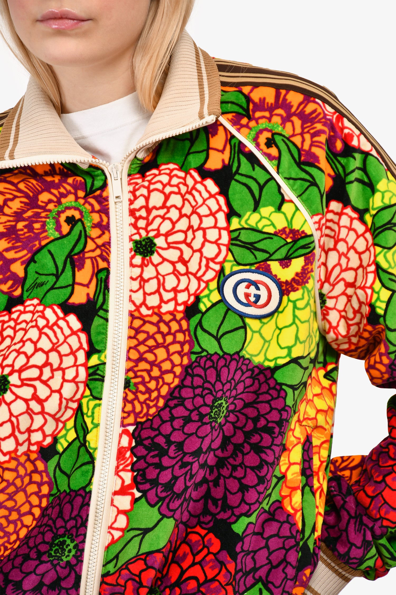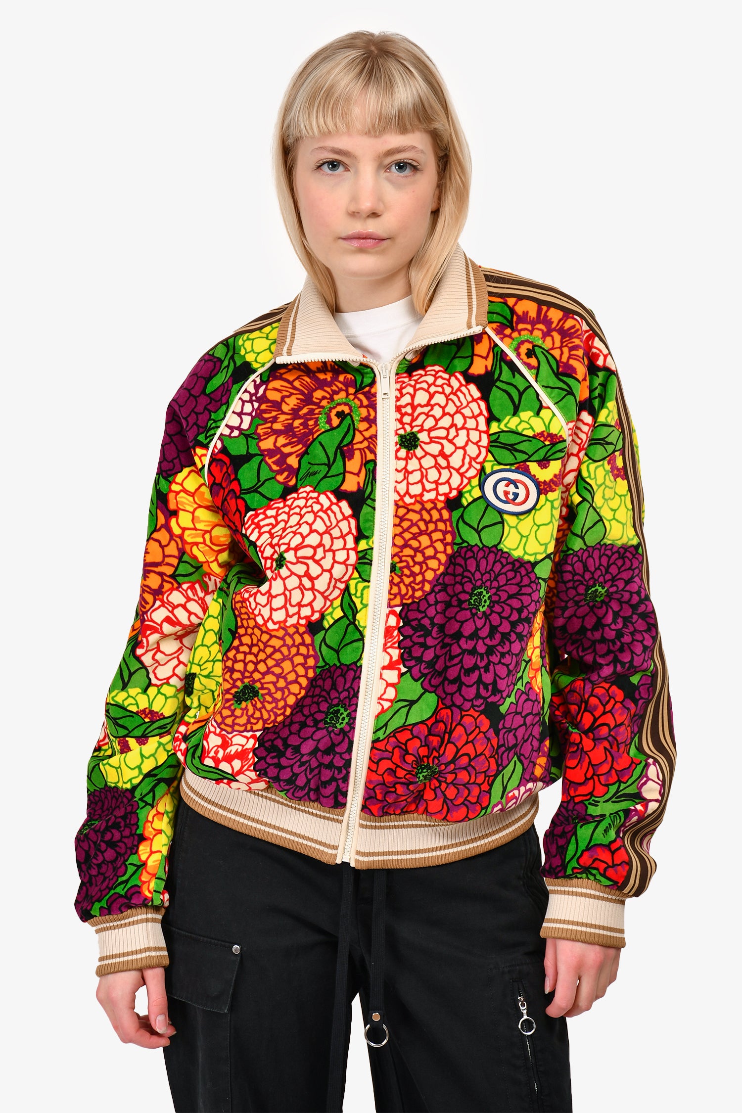 Refresh availabilityGucci x George Kenneth Scott Green/Purple Floral Velour Zip-Up Jacket. Front white-tone zip-up. Ribbed collar, cuffs, and waistband. Mesh lining. Contrast stitching.