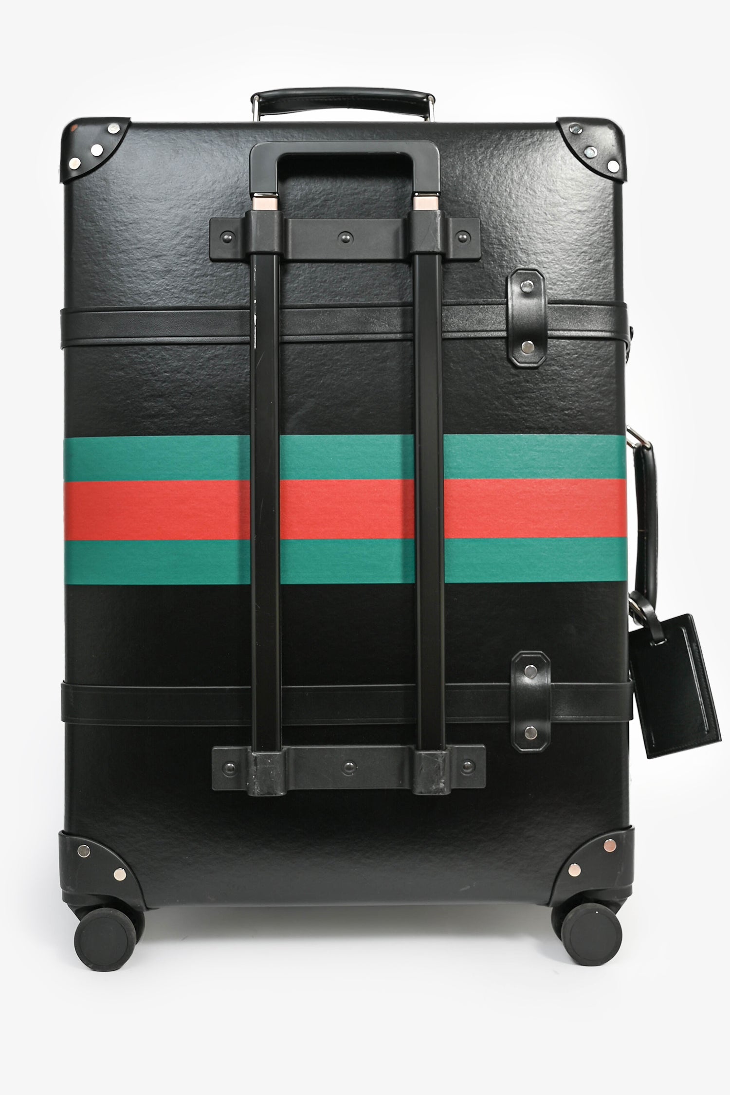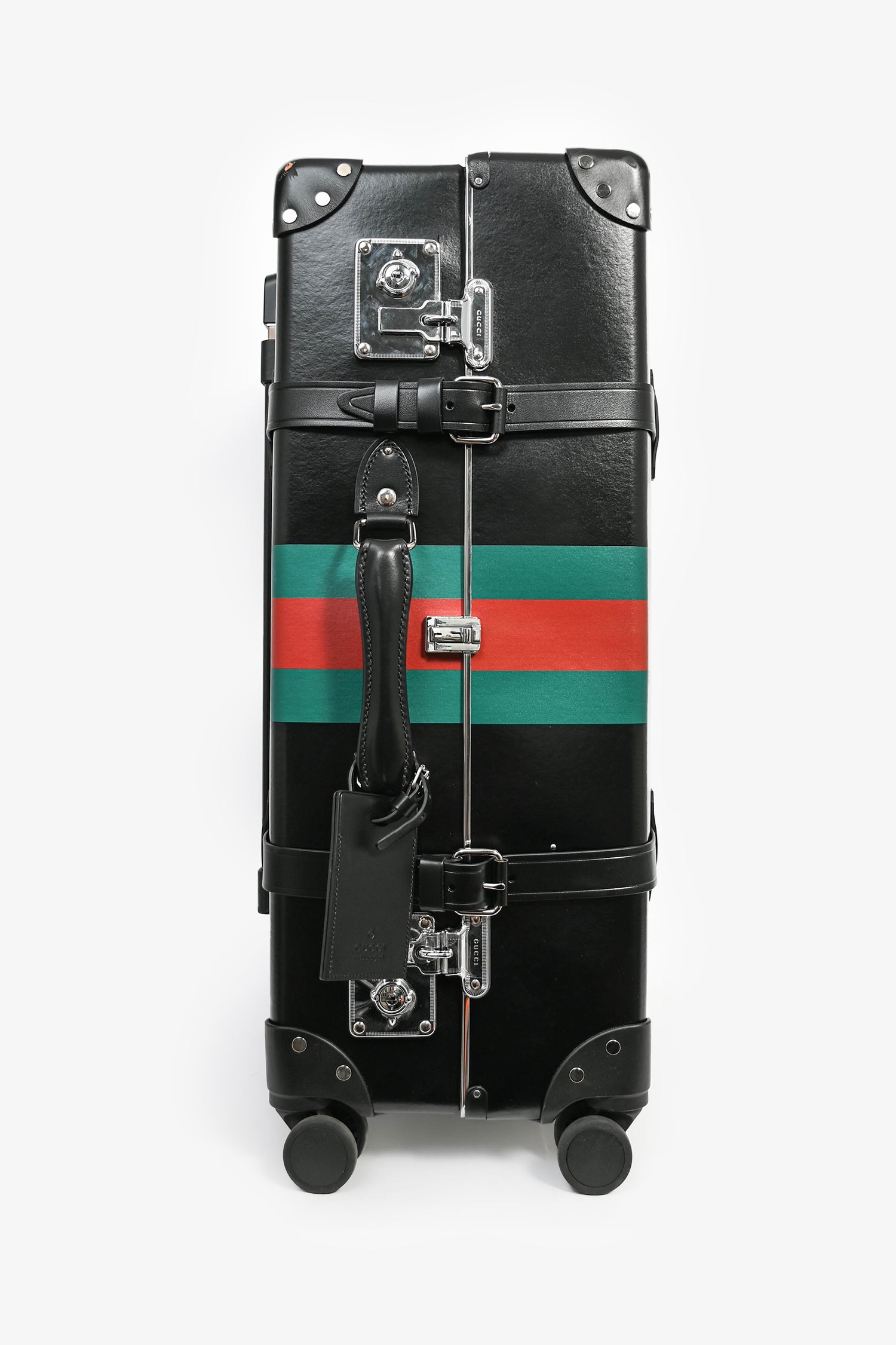 Refresh availabilityGucci X Globe Trotter Black Web Suitcase 65. Leather trimming. Silver-tone hardware. 2 front straps. Single top handle. Pull-up handle. Side closure. Lined interior. 2 interior straps. Wheeled. Tonal stitching.