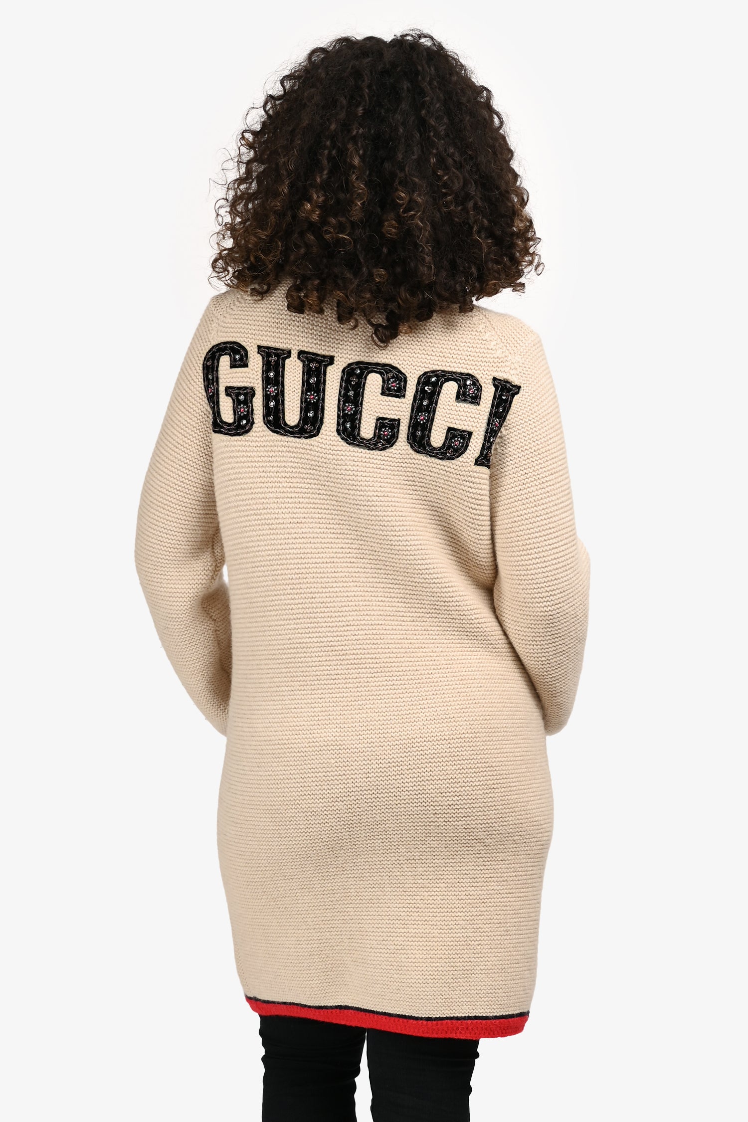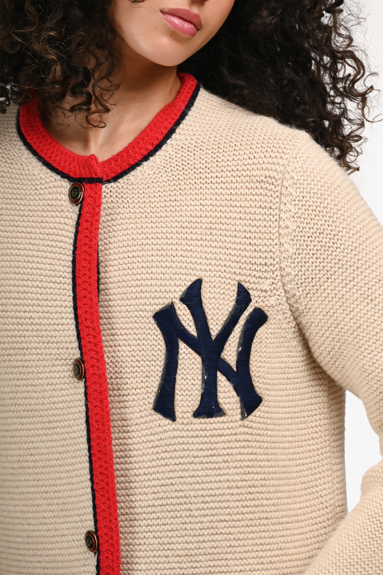 Refresh availabilityGucci x NY Yankees Beige Alpaca/Wool Embellished Patchwork Long Cardigan. Pull-on. Round neckline. Front button-up closure. Gold-tone hardware. Tonal stitching.