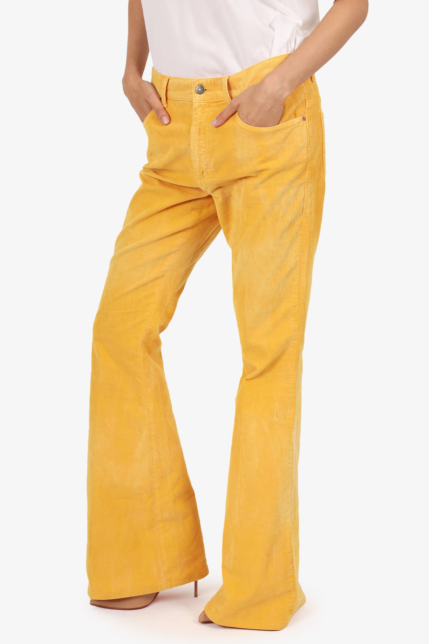 Refresh availabilityGucci Yellow Corduroy Flared Leg Pants. Front zip with button closure. Waistband belt loops. 5 exterior pockets; 2 front side slip and 1 mini compartment, 2 rear slip. Copper-tone hardware. Tonal stitching.