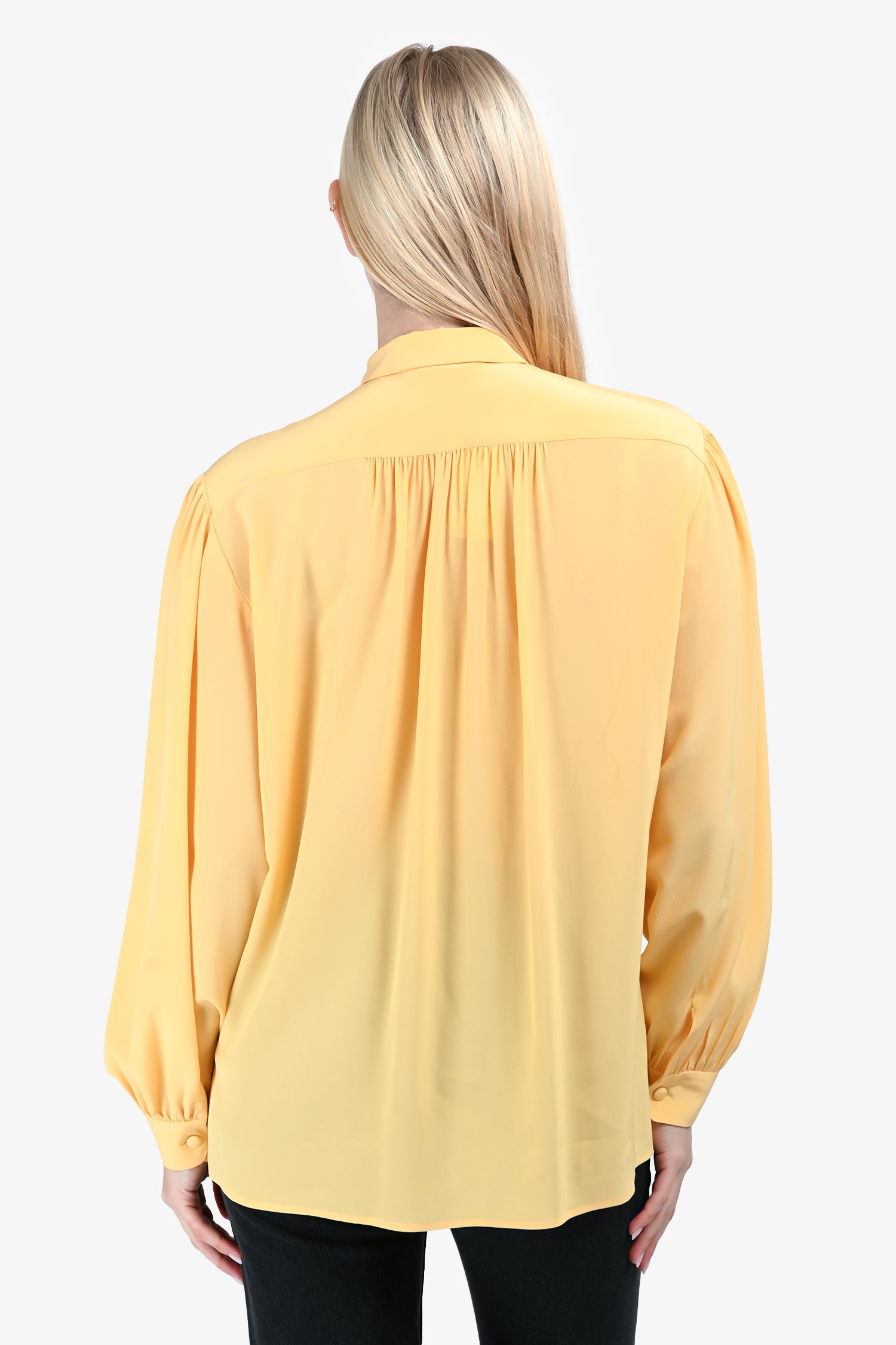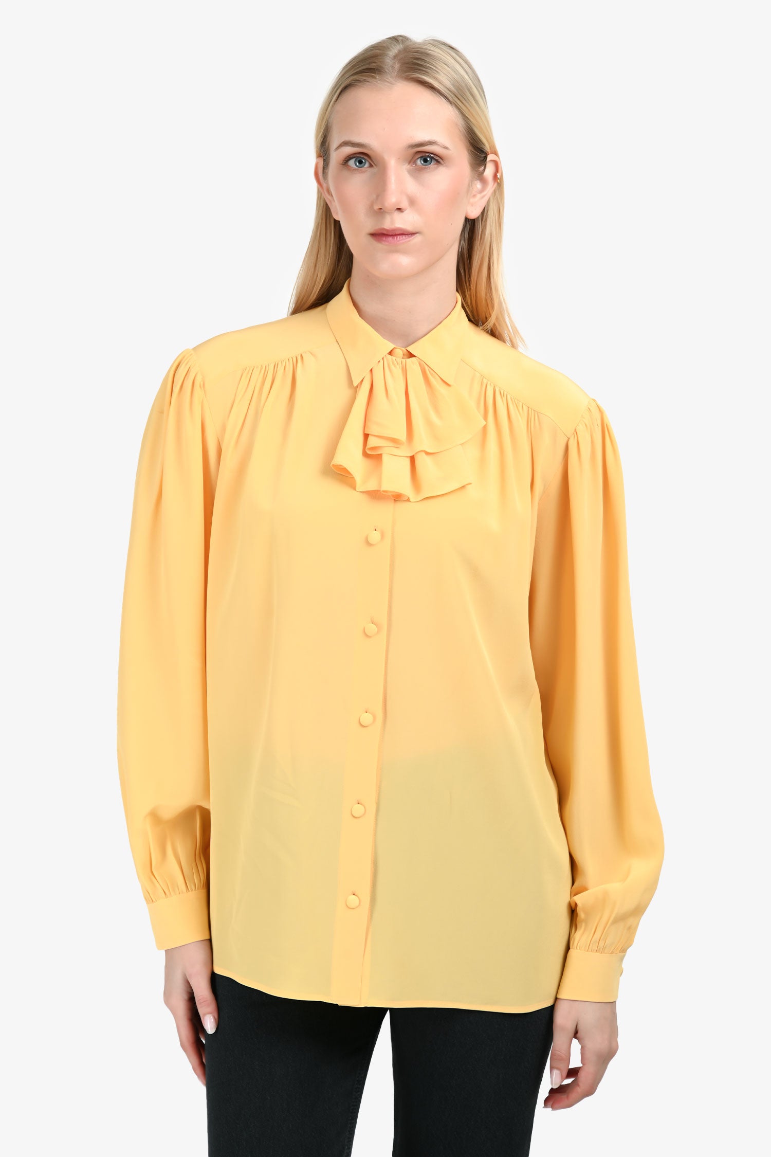 Refresh availabilityGucci Yellow Silk Ruffle Blouse. High neckline with ruffle trim. Front button-up closure. Cuffs with button-up closures. Unlined interior. Tonal stitching.