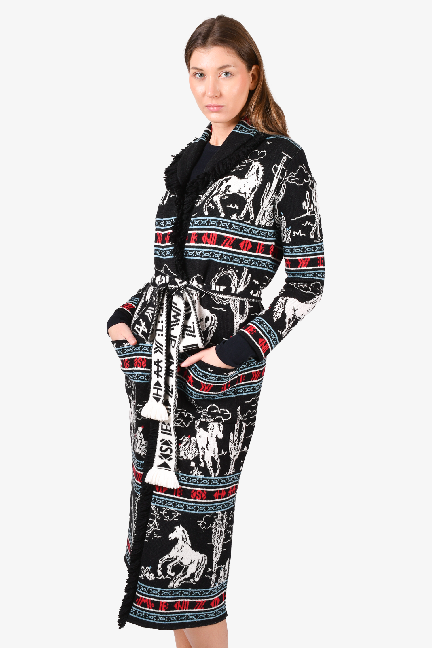 Refresh availabilityHayley Menzies Black/Red/White Wool Graphic Fringe Cardigan Sweater with Belt. Open front. Tie-up waist belt closure. Unlined. Front pockets. Tonal stitching.