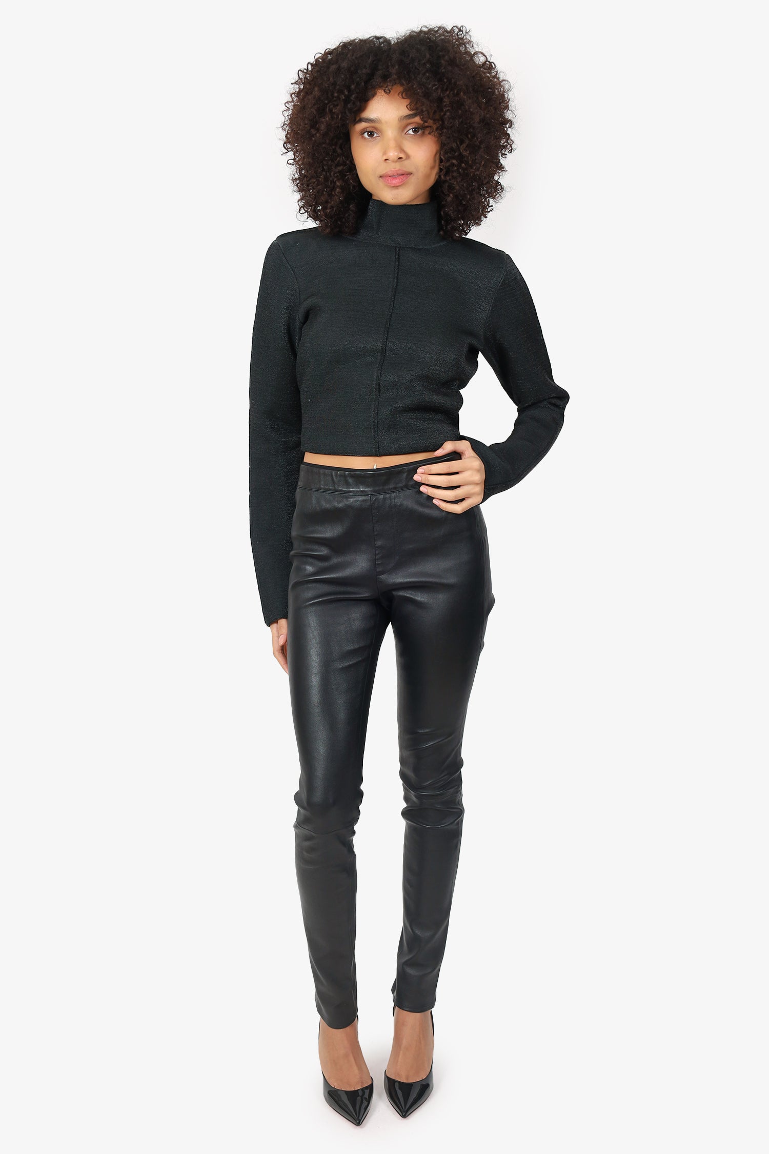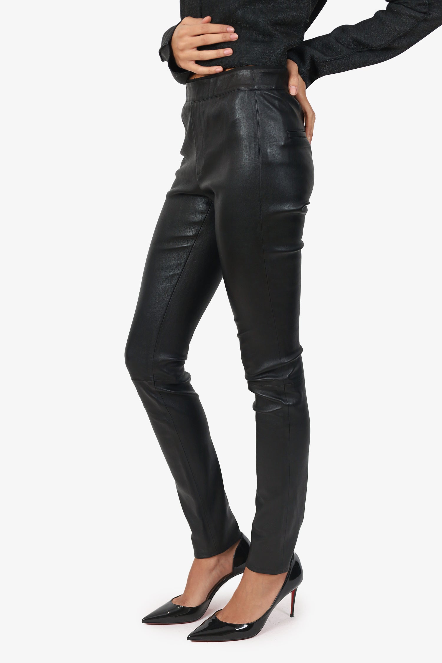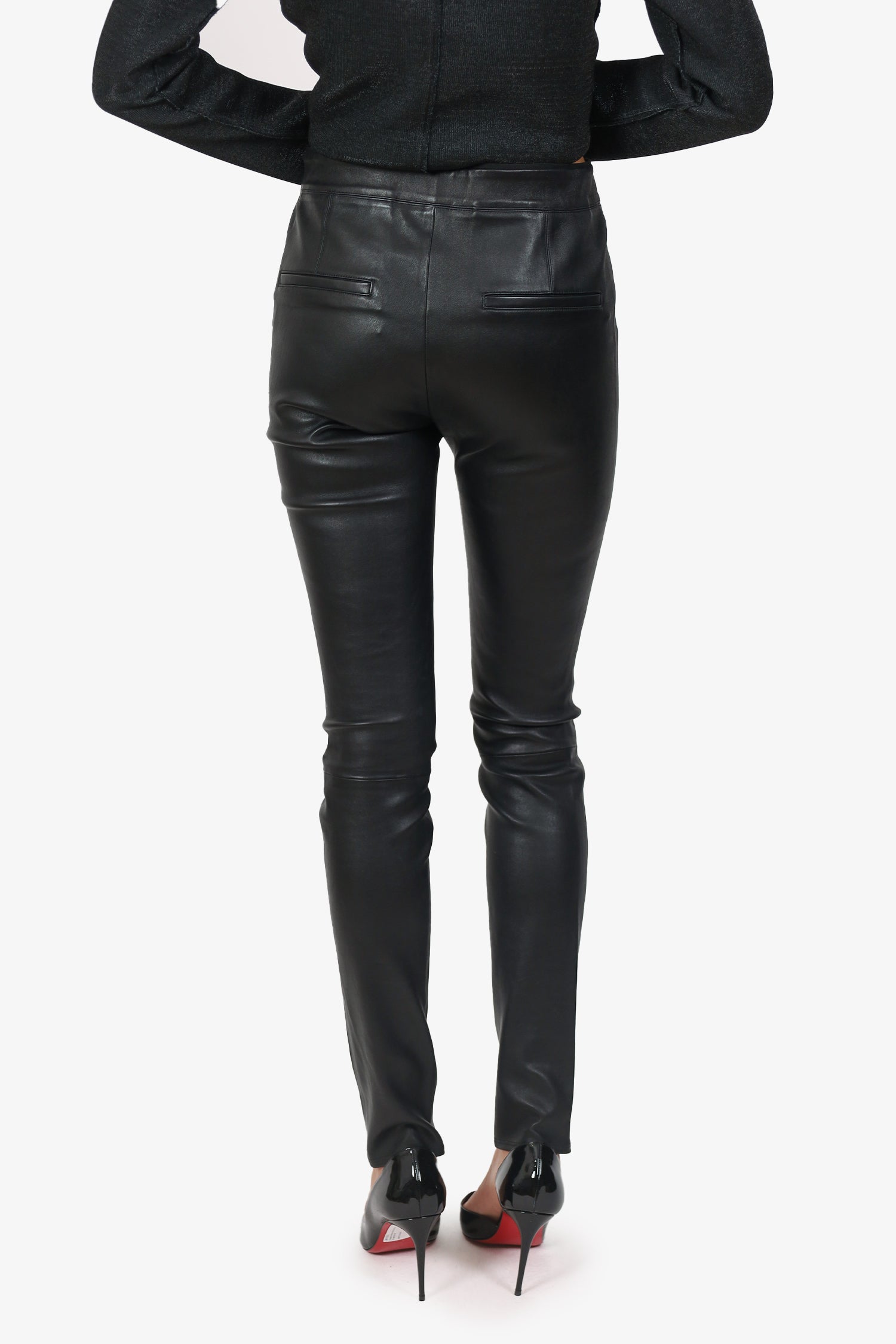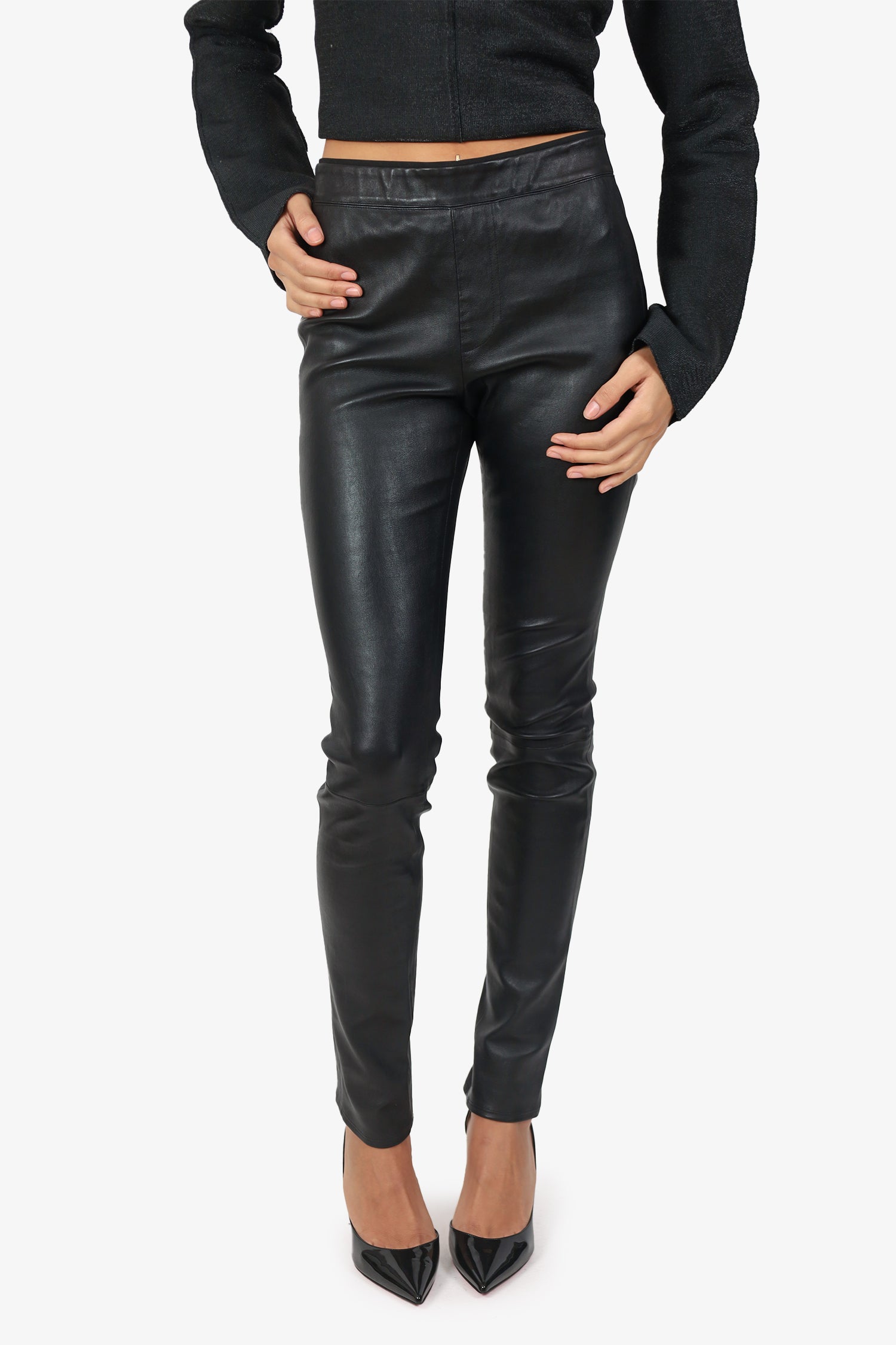 Refresh availabilityHelmut Lang Black Leather Leggings. Slip-on. Elasticated waistband. 2 exterior faux rear pockets. Tonal stitching.