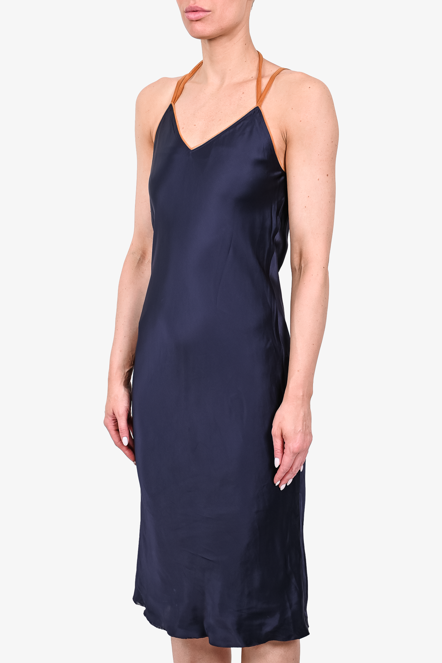 Refresh availabilityHelmut Lang Navy Blue Slip Dress with Orange Trim. V-neck. Pull-on. Tonal stitching.