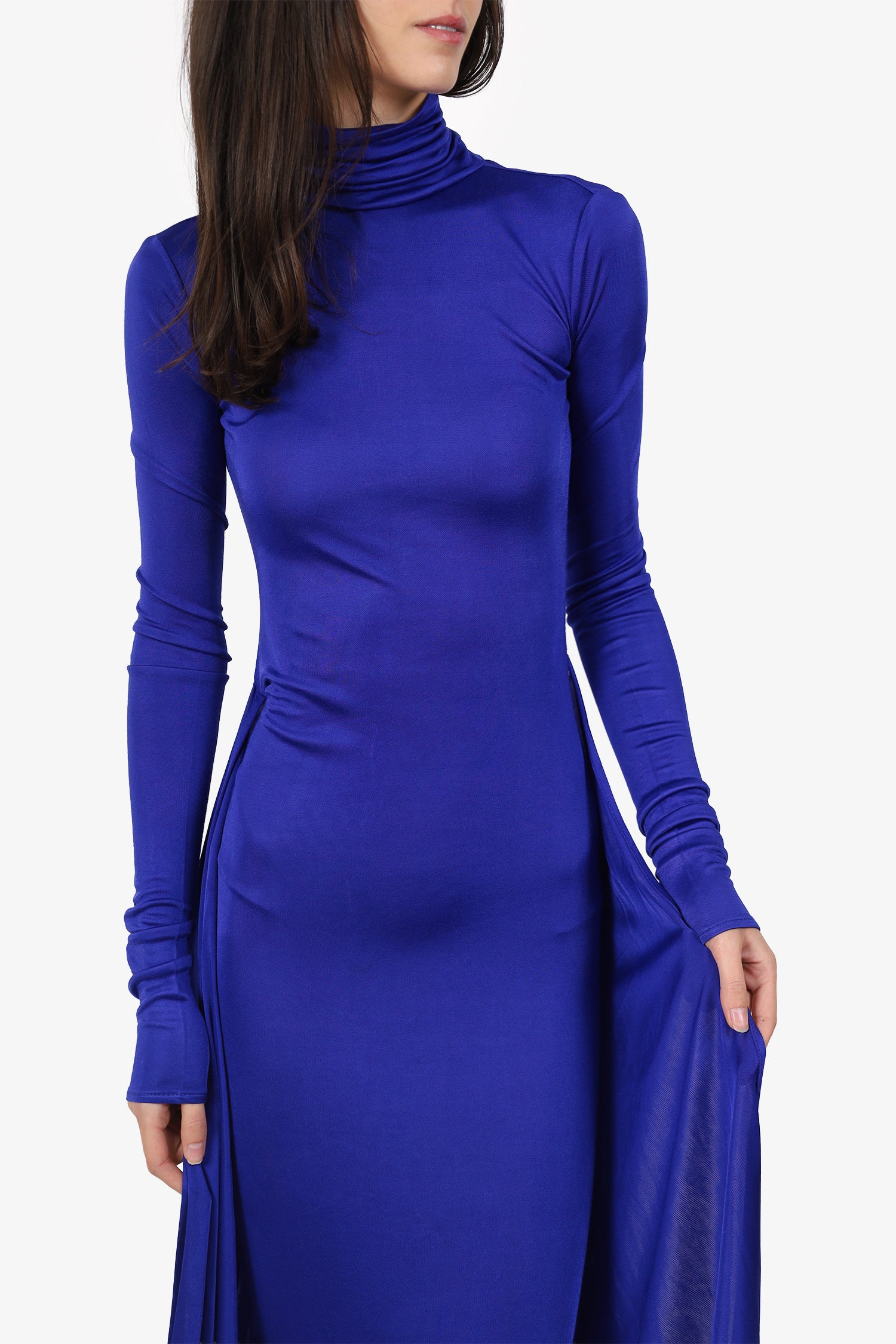 Refresh availabilityHelsa Purple Slinky Jersey Long Sleeve Turtle Neck Gown. Pull-on. Rear zip with hook closure. Silver-tone hardware. Tonal stitching.