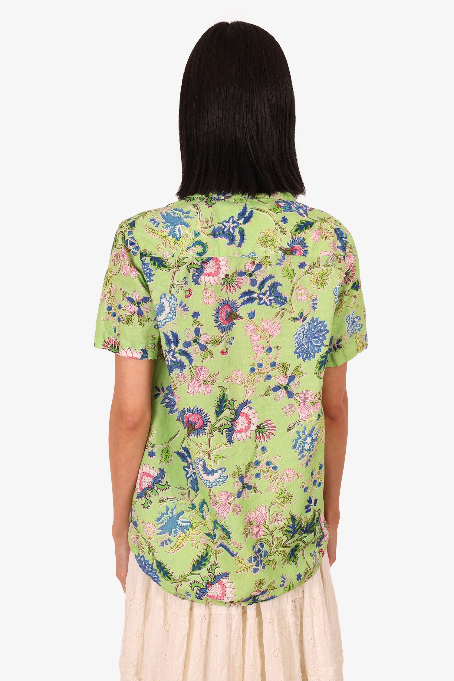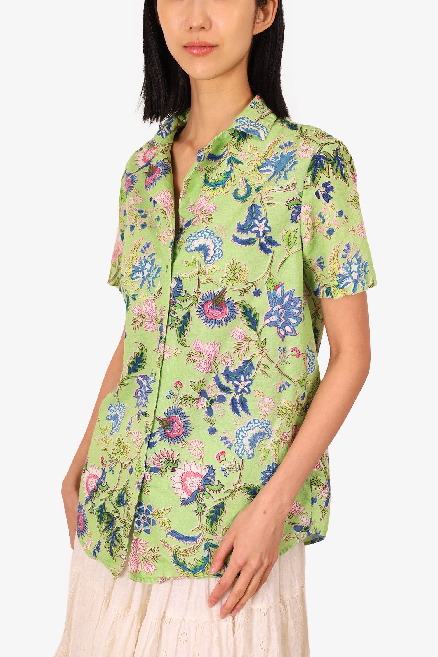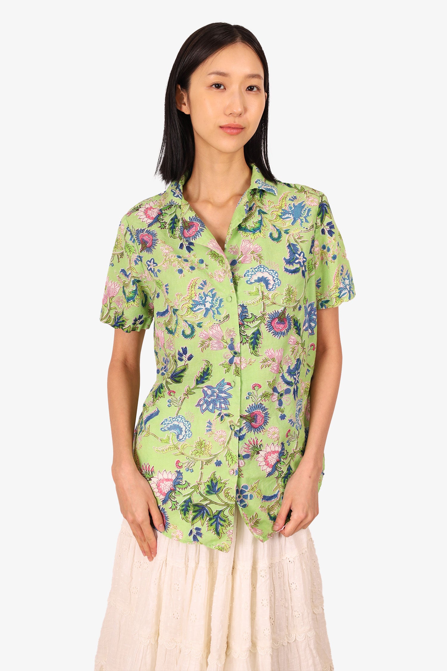 Refresh availabilityHemant & Nandita Green/Blue Floral Print Short Sleeve Button Up Blouse. Collared neckline. Front button-up closure. Unlined. Tonal stitching.