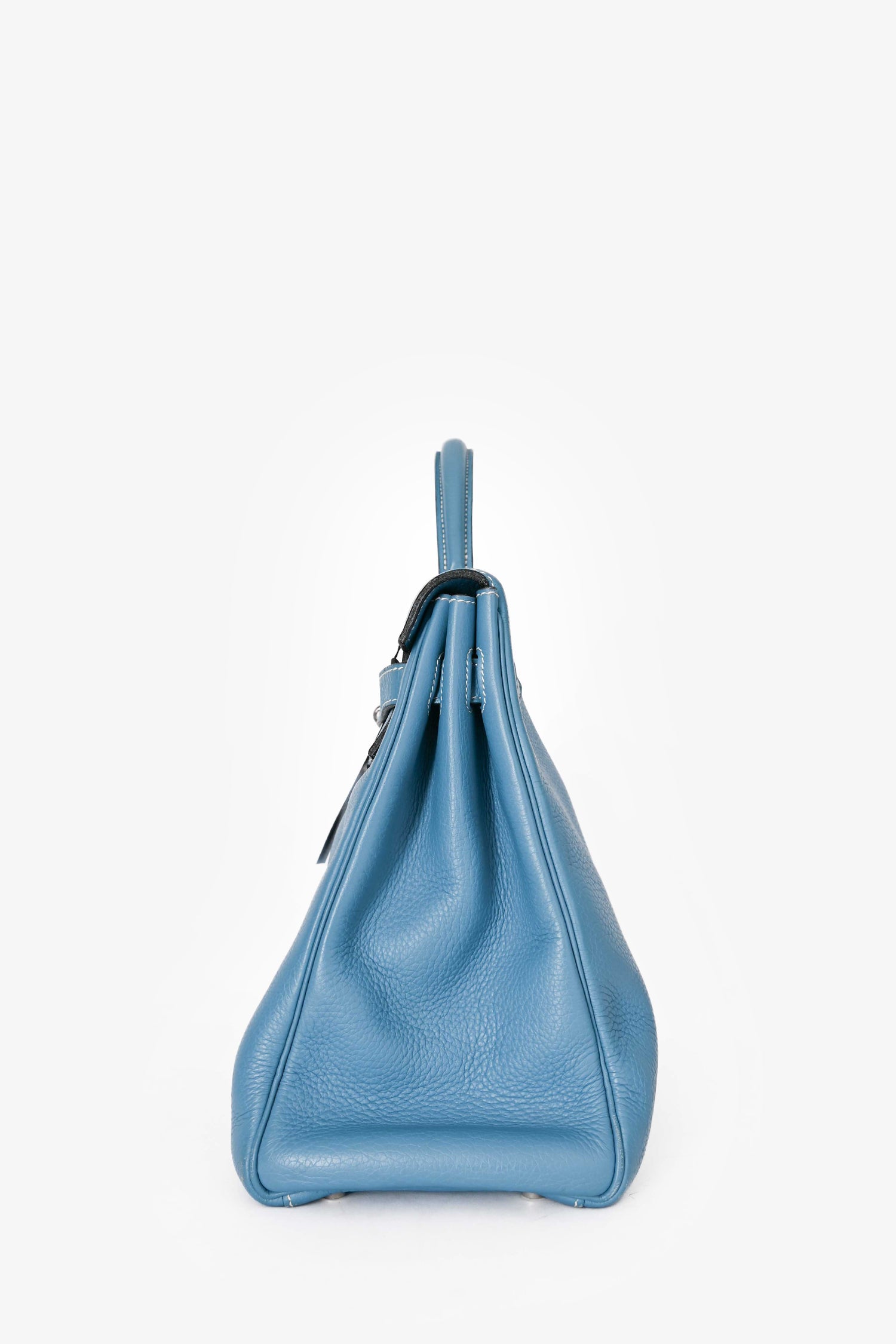 Refresh availabilityHermès 2003 Blue Jean Leather Kelly 35 with Strap. Structured silhouette. Signature flap closure with turn-lock and padlock. Single top handle and detachable shoulder strap. Leather-lined interior with zip and two slip pockets. Contrast stitching.