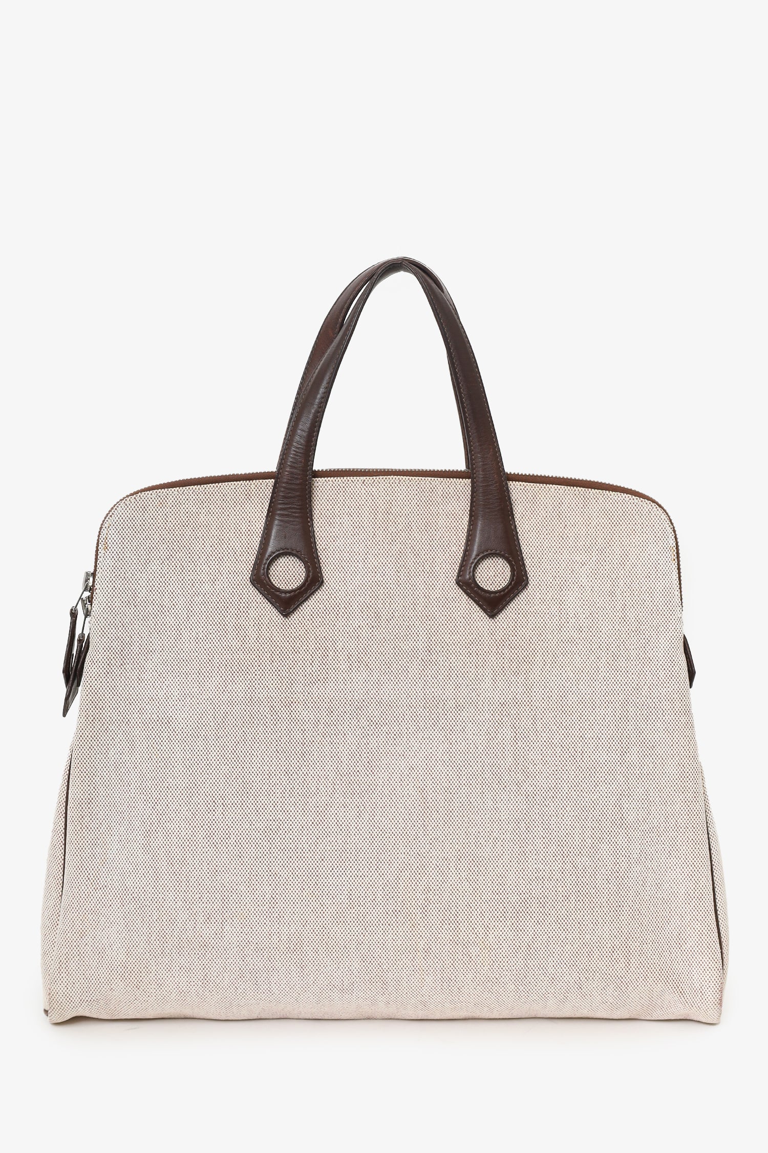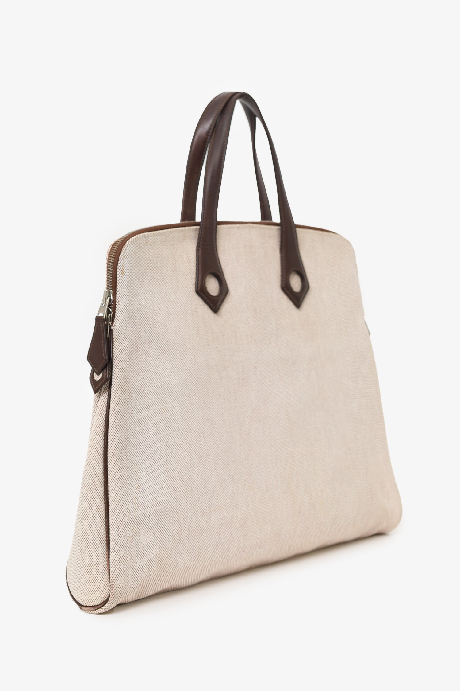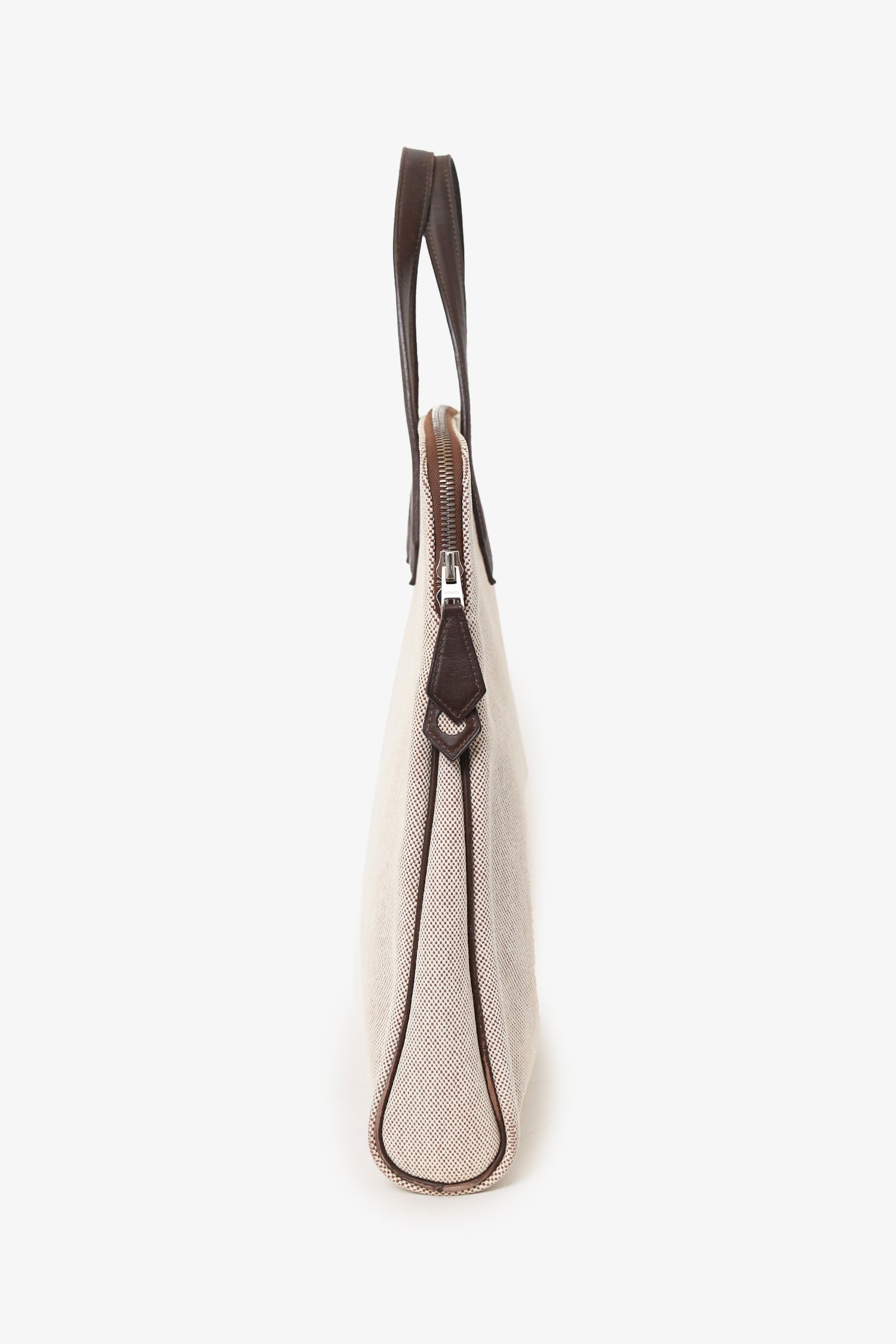 Refresh availabilityHermes 2006 Brown/Beige Canvas/Leather. Top zip closure. Single interior wall slip pocket. Top handle. Silver-tone hardware. Tonal stitching.