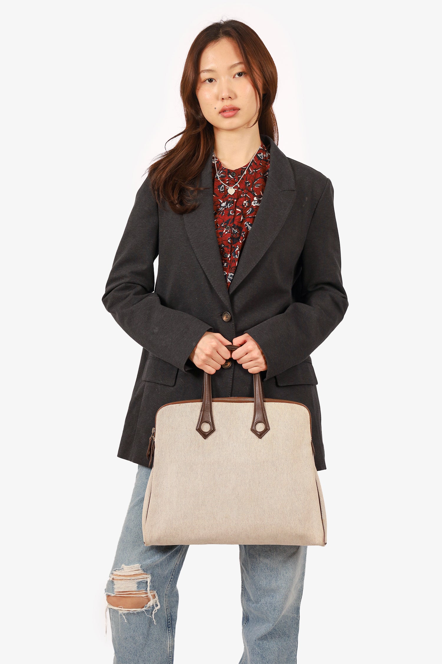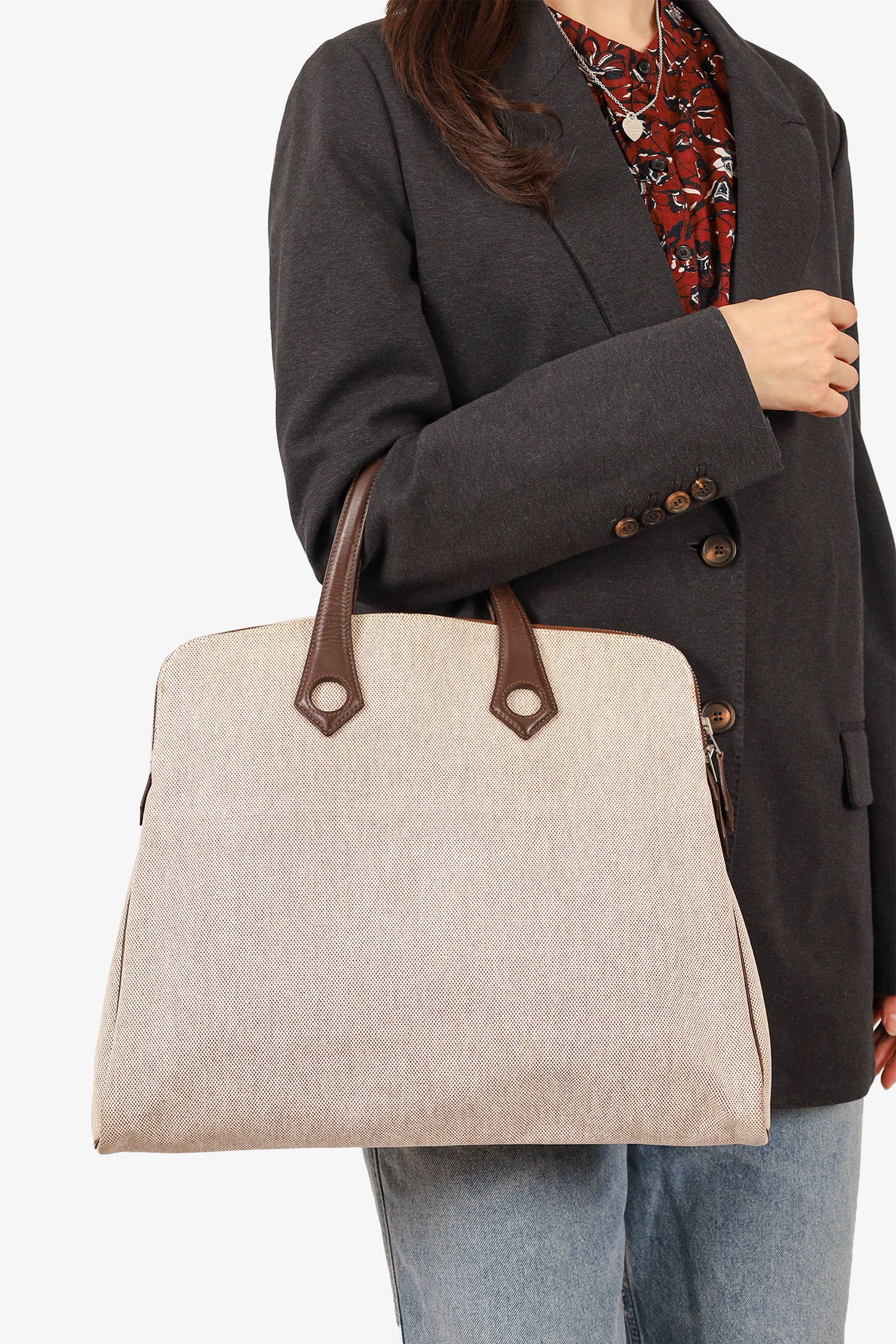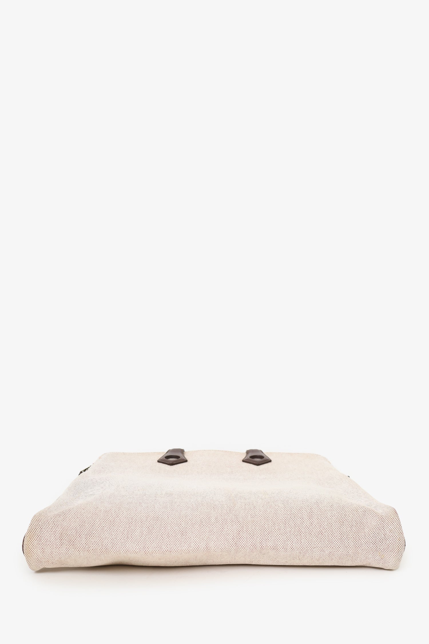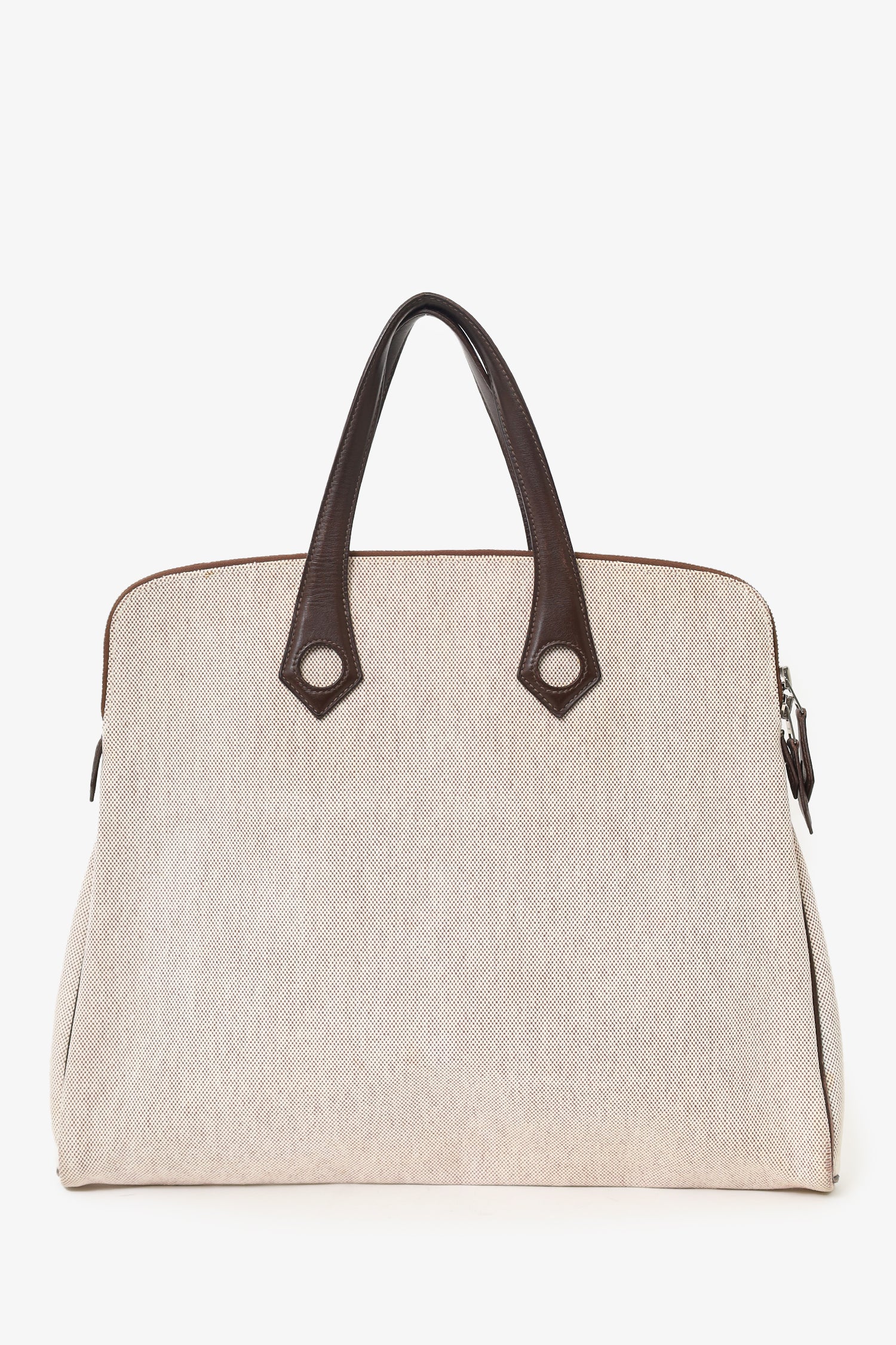 Refresh availabilityHermes 2006 Brown/Beige Canvas/Leather. Top zip closure. Single interior wall slip pocket. Top handle. Silver-tone hardware. Tonal stitching.