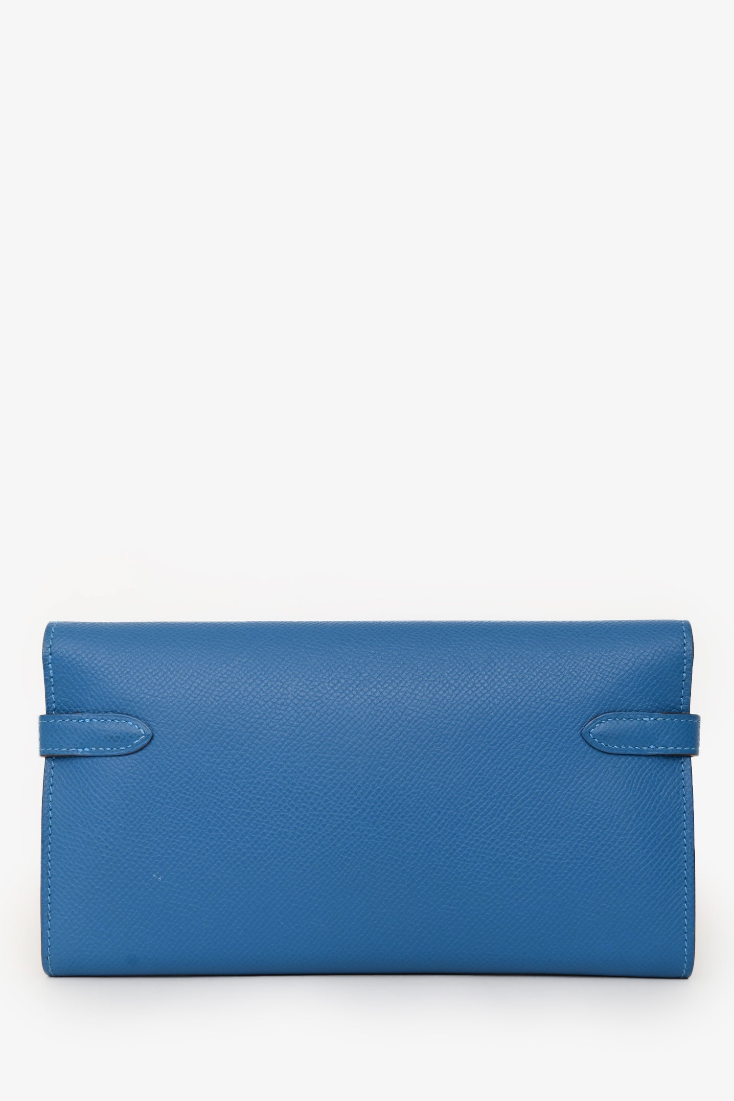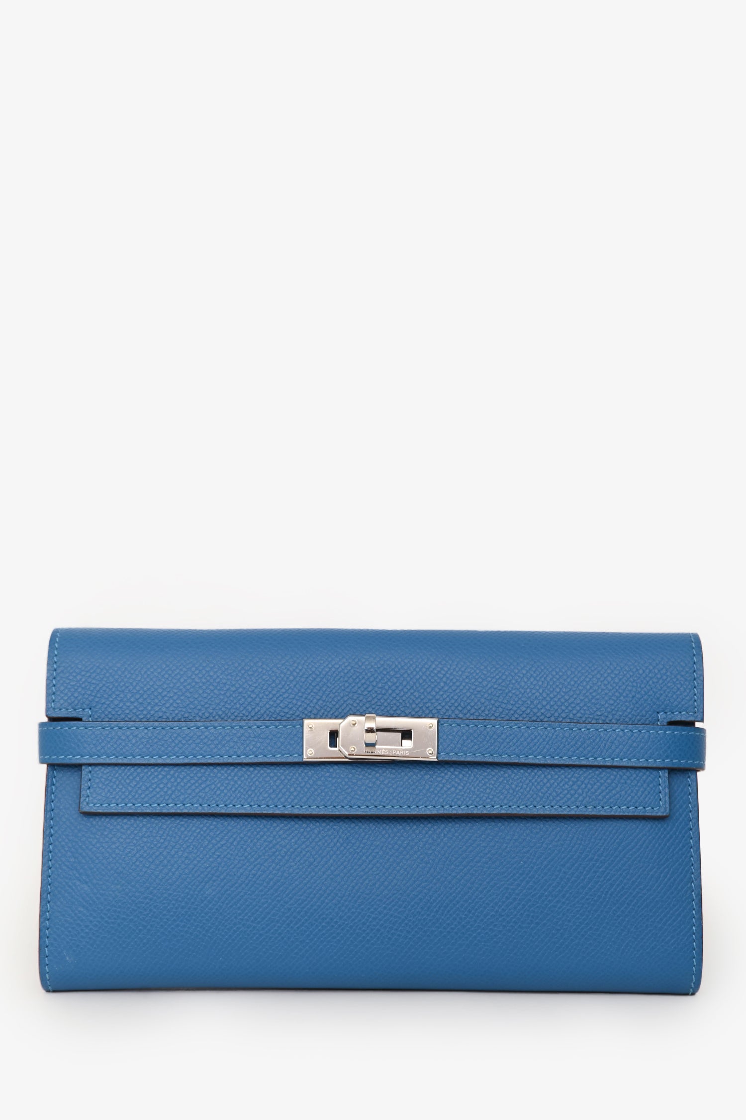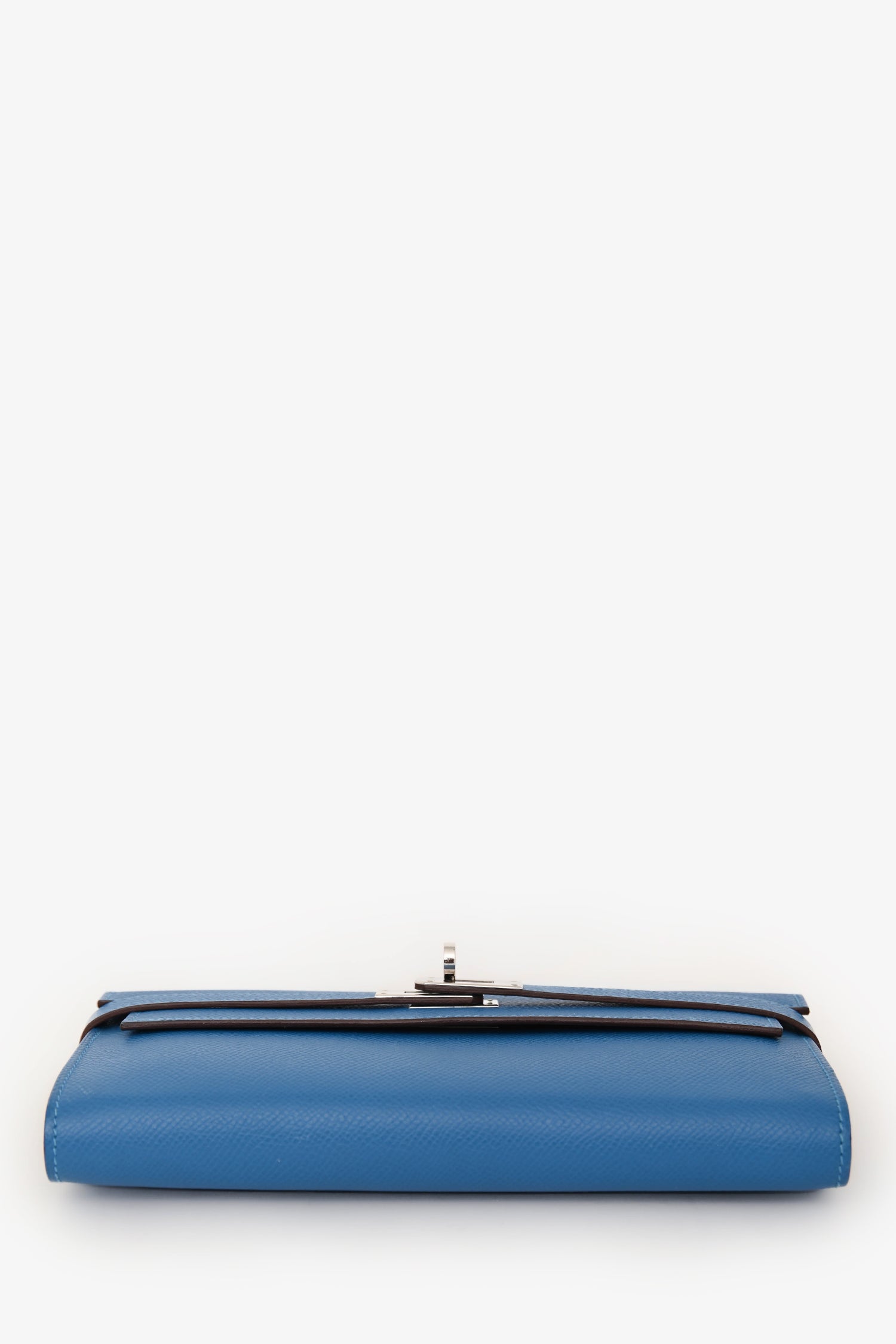 Refresh availabilityHermès 2011 Blue Epsom Kelly Long Wallet PHW. Front fold-over flap and side straps with turn-lock closure. Two interior compartments with a middle zip pocket. Each compartment has a cash and 6 card slots. Palladium hardware. Tonal stitching.