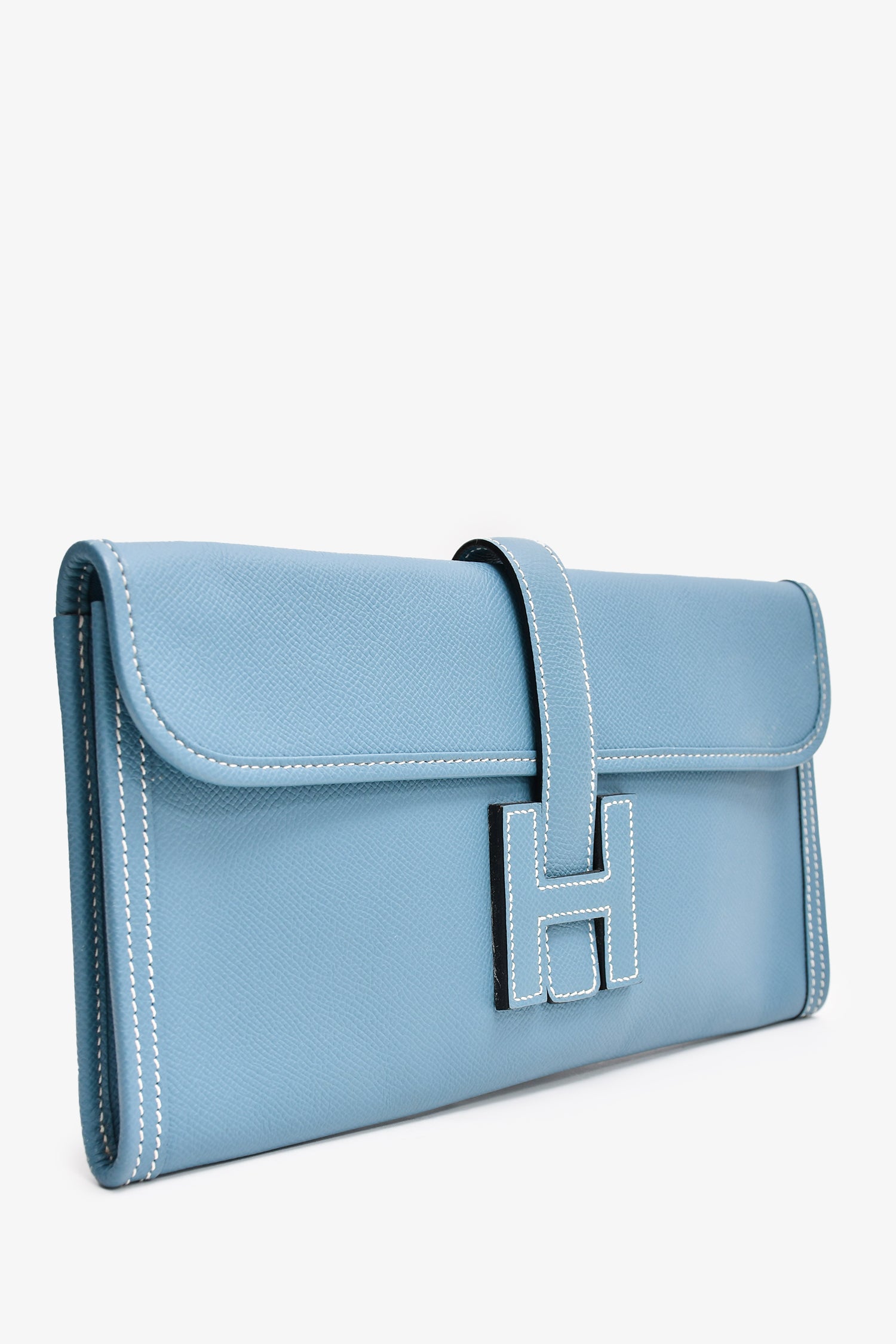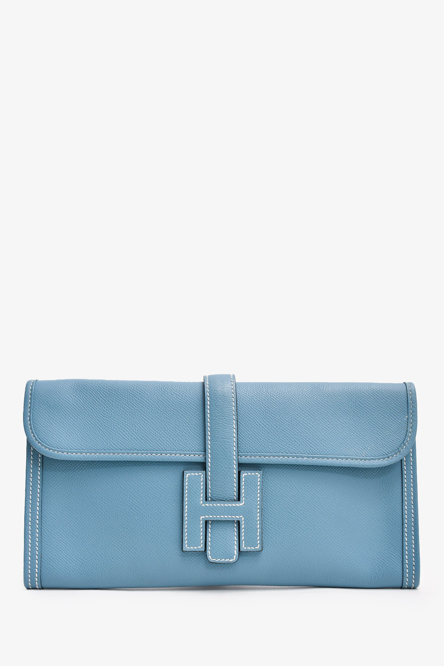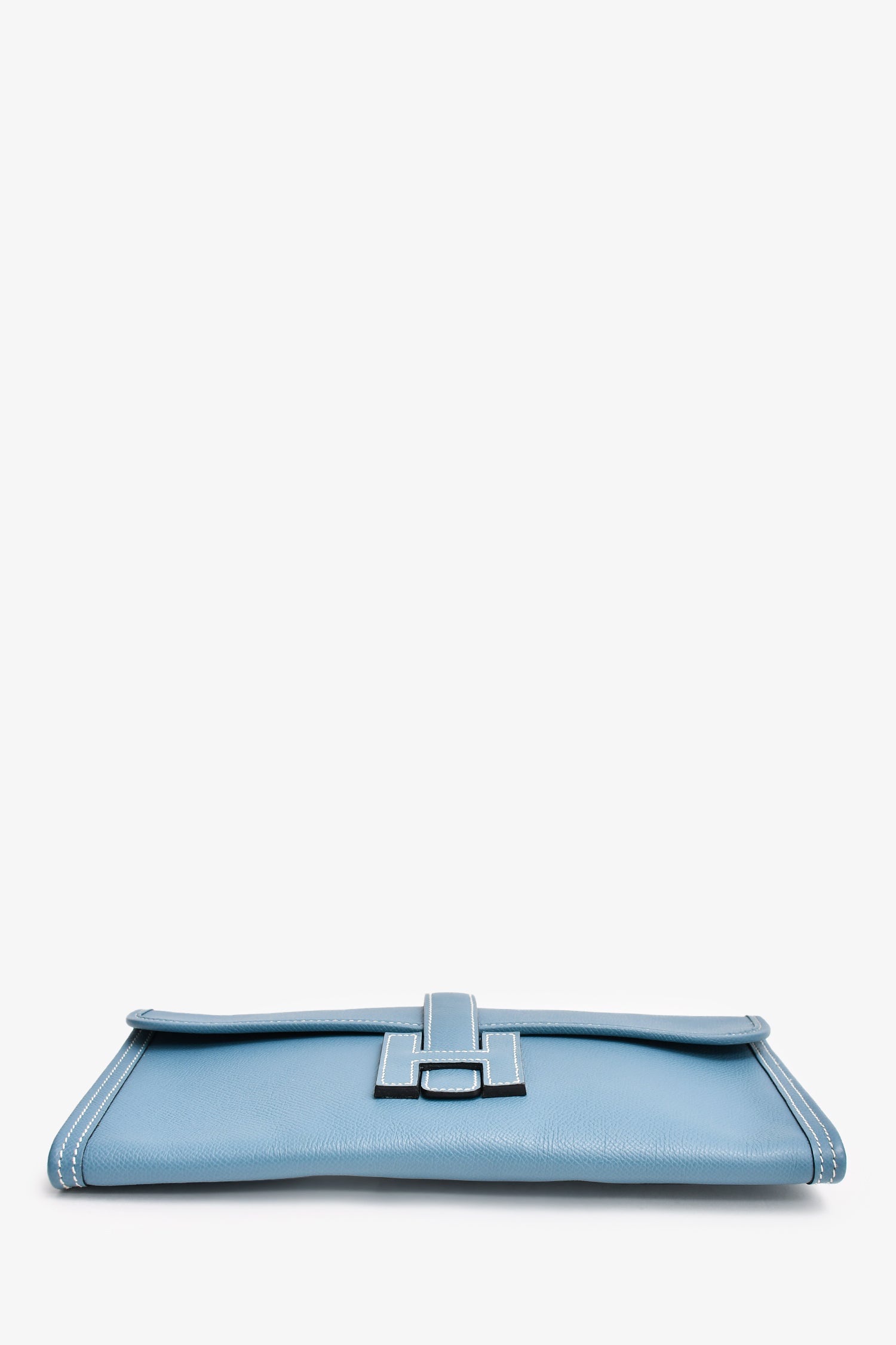 Refresh availabilityHermès 2011 Blue Jean Epsom Leather Jige Elan 29 Clutch. Front fold-over flap with push tab closure. Contrast stitching.