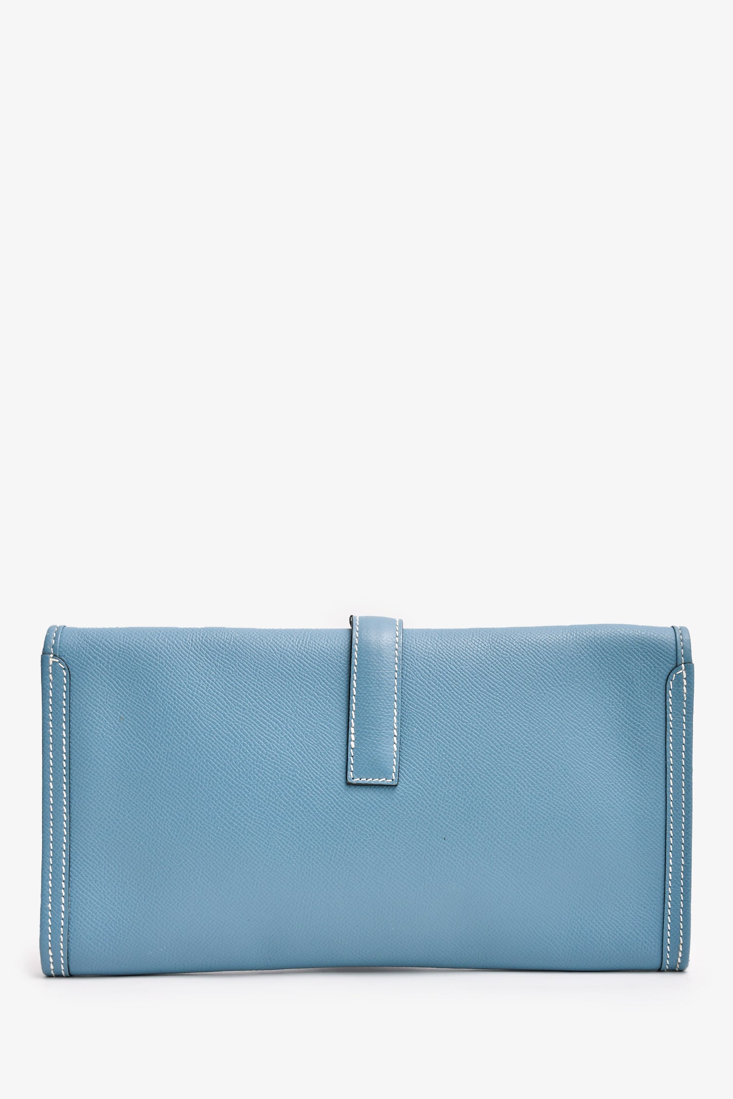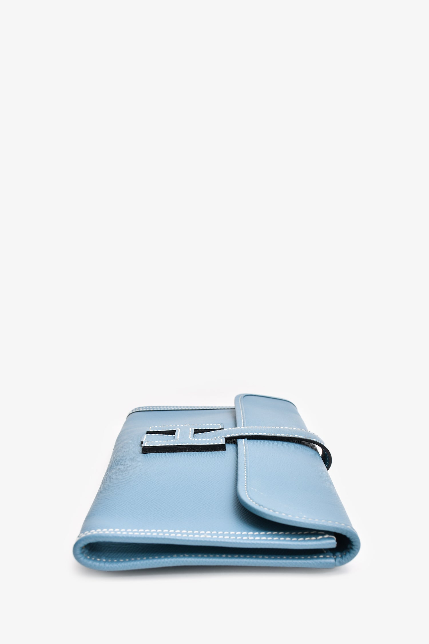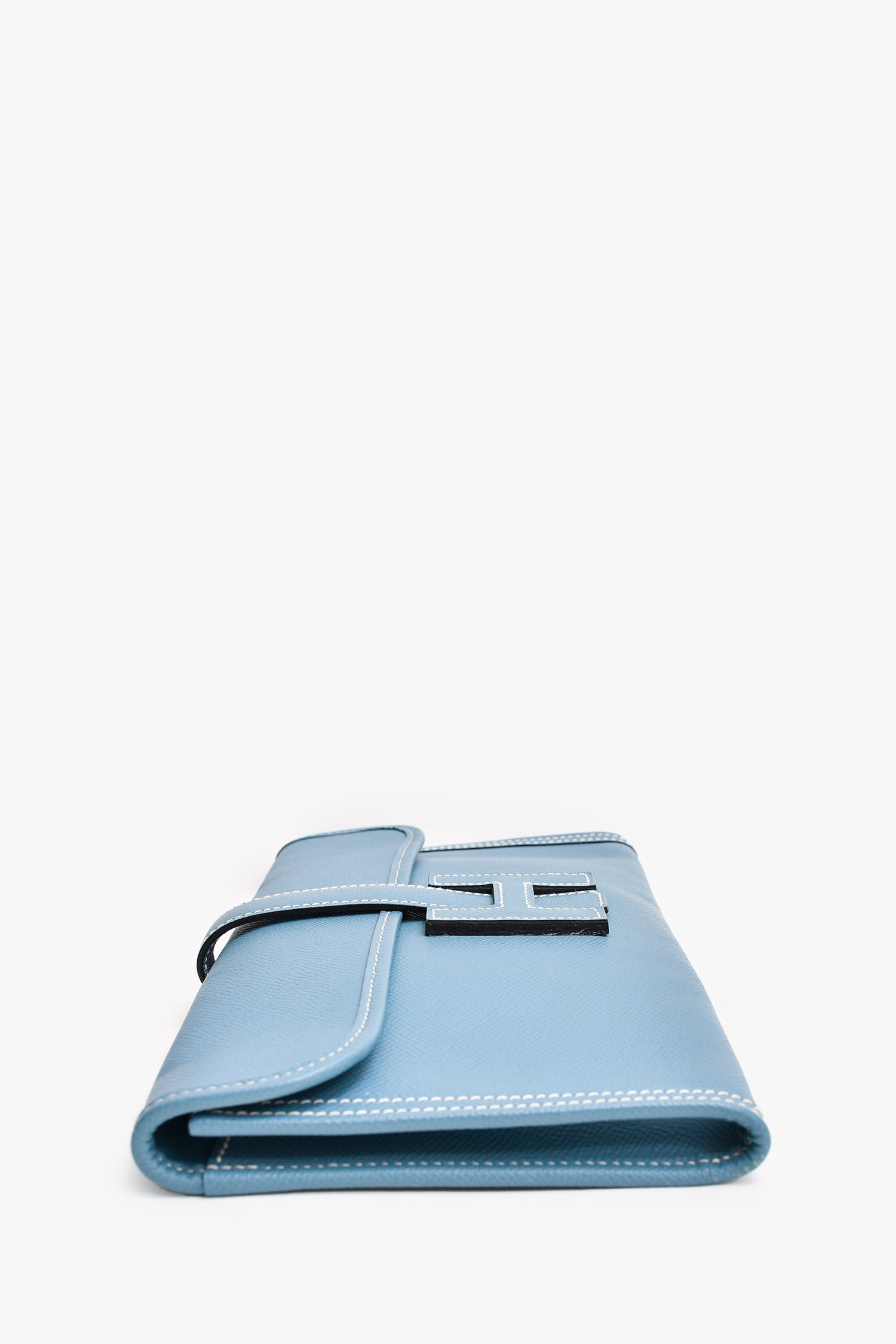 Refresh availabilityHermès 2011 Blue Jean Epsom Leather Jige Elan 29 Clutch. Front fold-over flap with push tab closure. Contrast stitching.