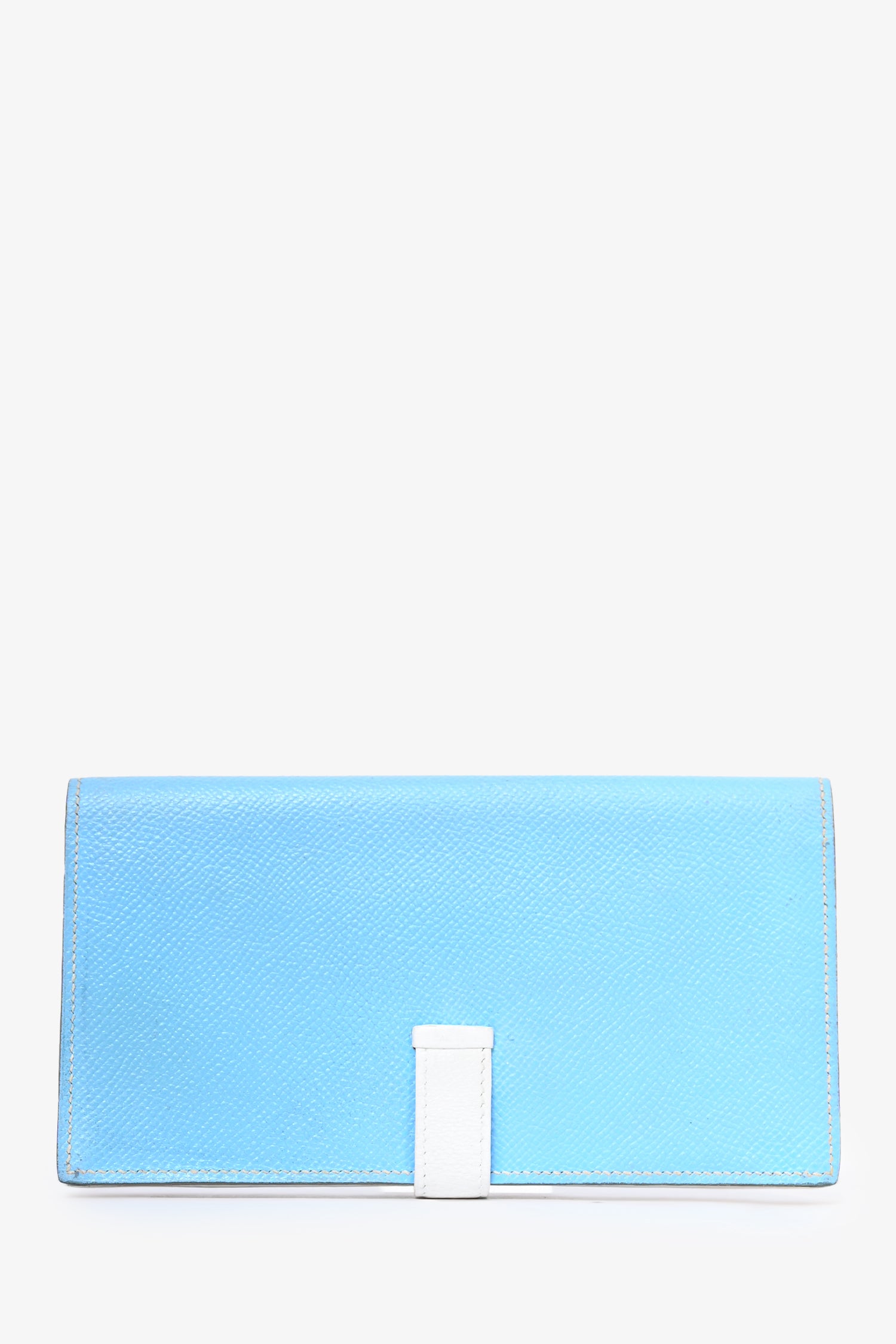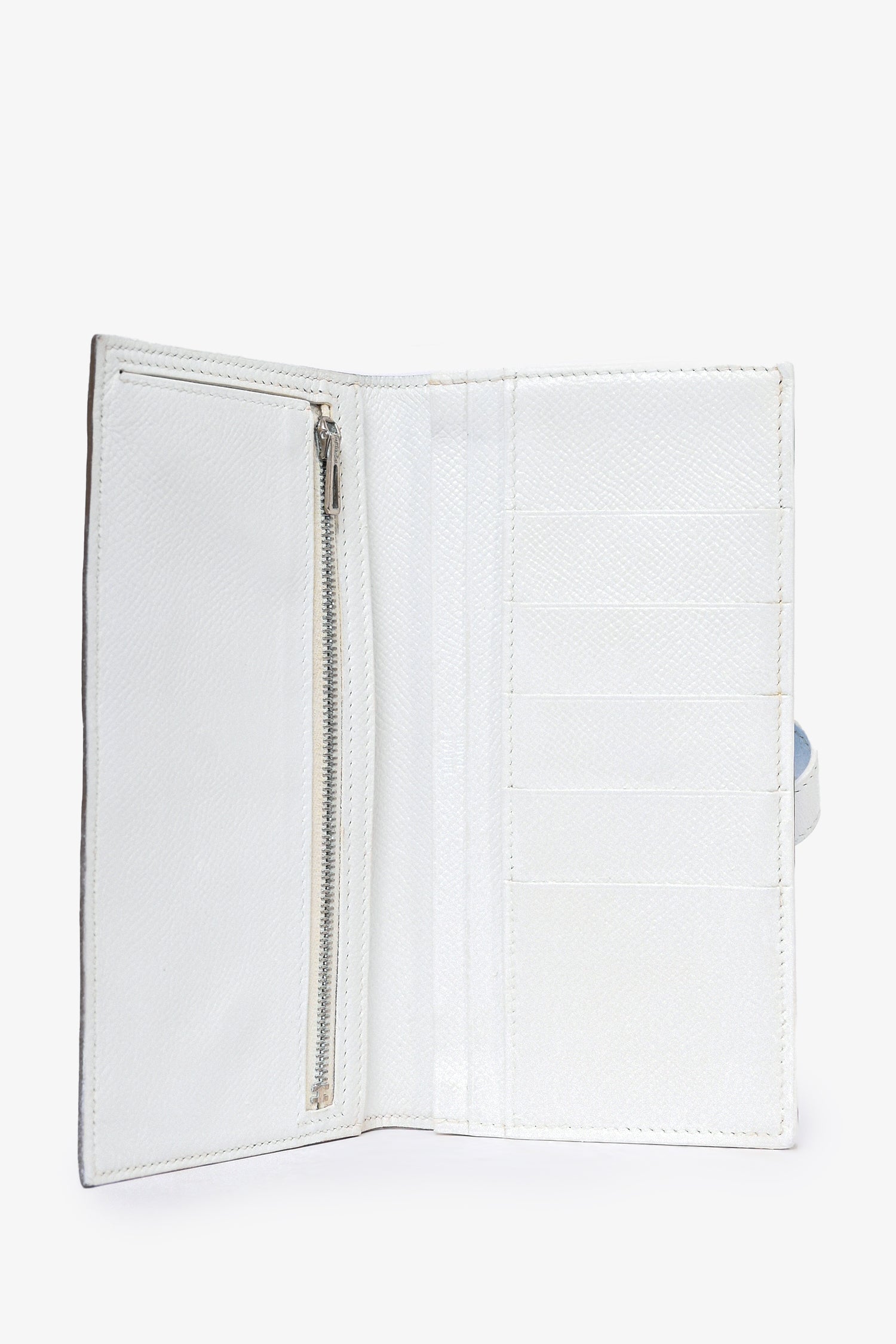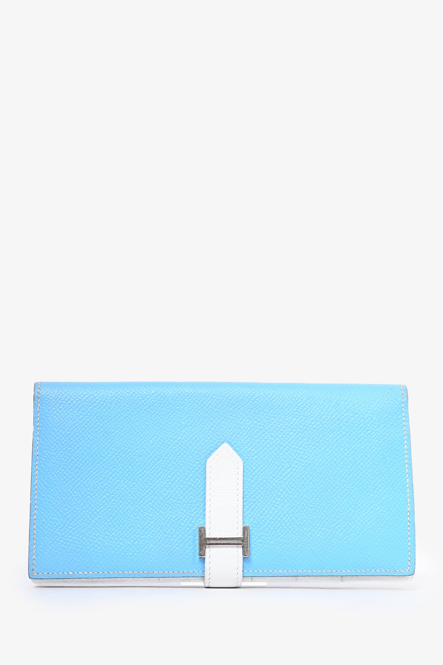 Refresh availabilityHermès 2011 Blue/White Epsom Leather Bearn Wallet. Front fold-over strap closure. 5 card slots. 4 billfold compartments. 1 zippered coin compartment. Silver-tone hardware. Lining repainted.